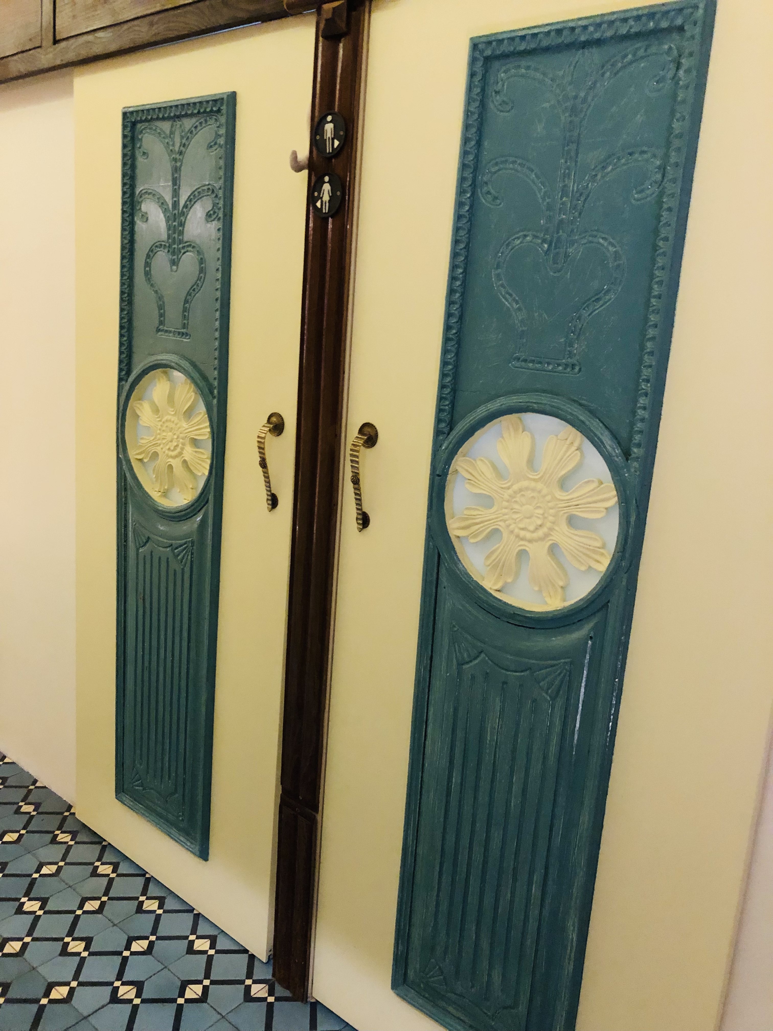 En el pasillo me encantaron las puertas de los baños y los dos pequeños rincones en la entrada del local.