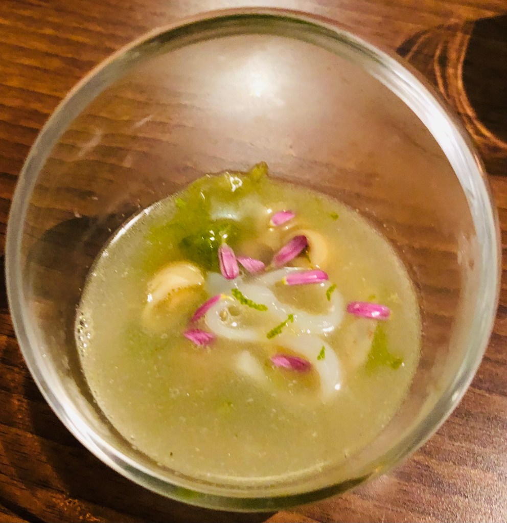 Una mariscada, algas y cítricos, para mi gusto un pelín más floja, quizás porque me gustan menos los caldos de pescado, pero siempre es un gusto personal.