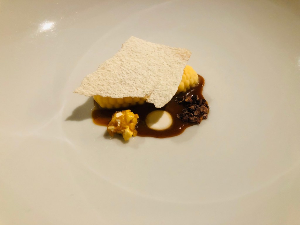El primero Maíz, dulce de leche, mole y cacao, con una cuidada presentación, detalle de la mazorca de maíz perfectamente elaborada y un toque picante en contraste con el dulzor, que suele dar en demasía a los platos, el dulce de leche, le da un sabor muy especial.