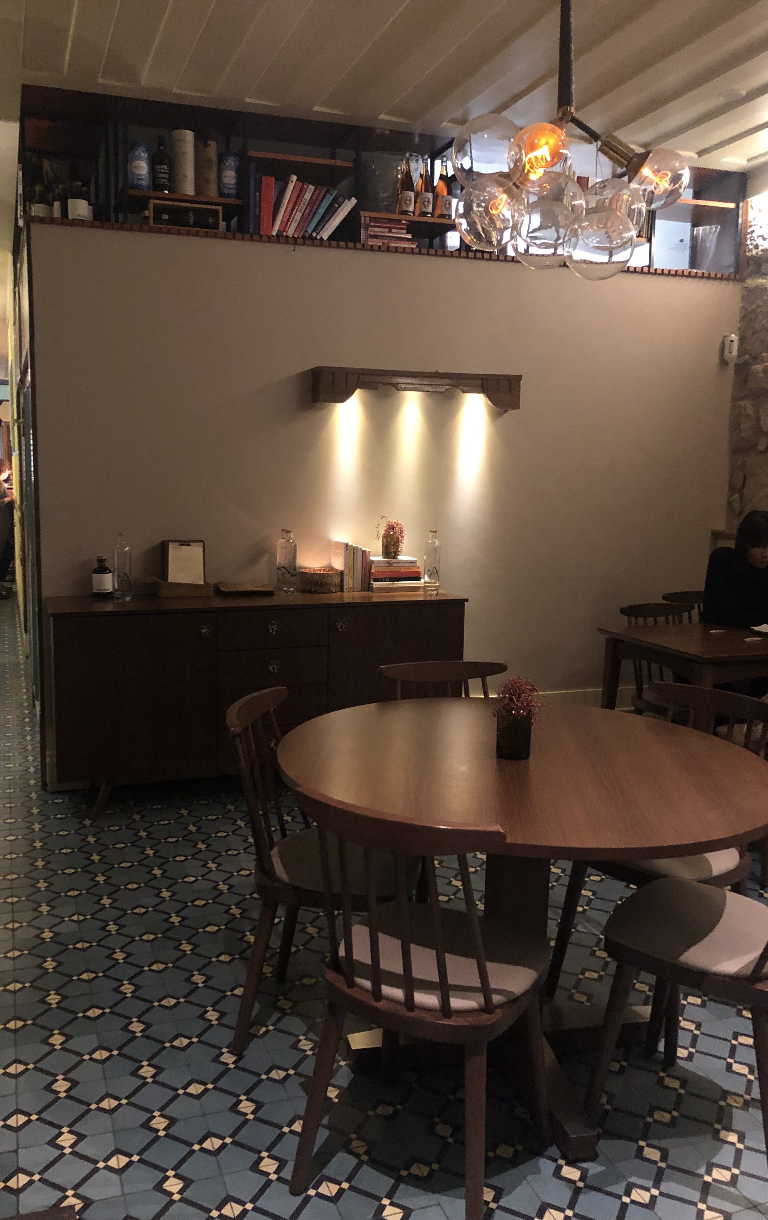 El local tiene tres ambientes, dos de ellos separados por un pequeño pasillo y una terraza exterior que, como era noche y llovía, no pudimos disfrutar y que estoy segura, será una delicia en buen tiempo.