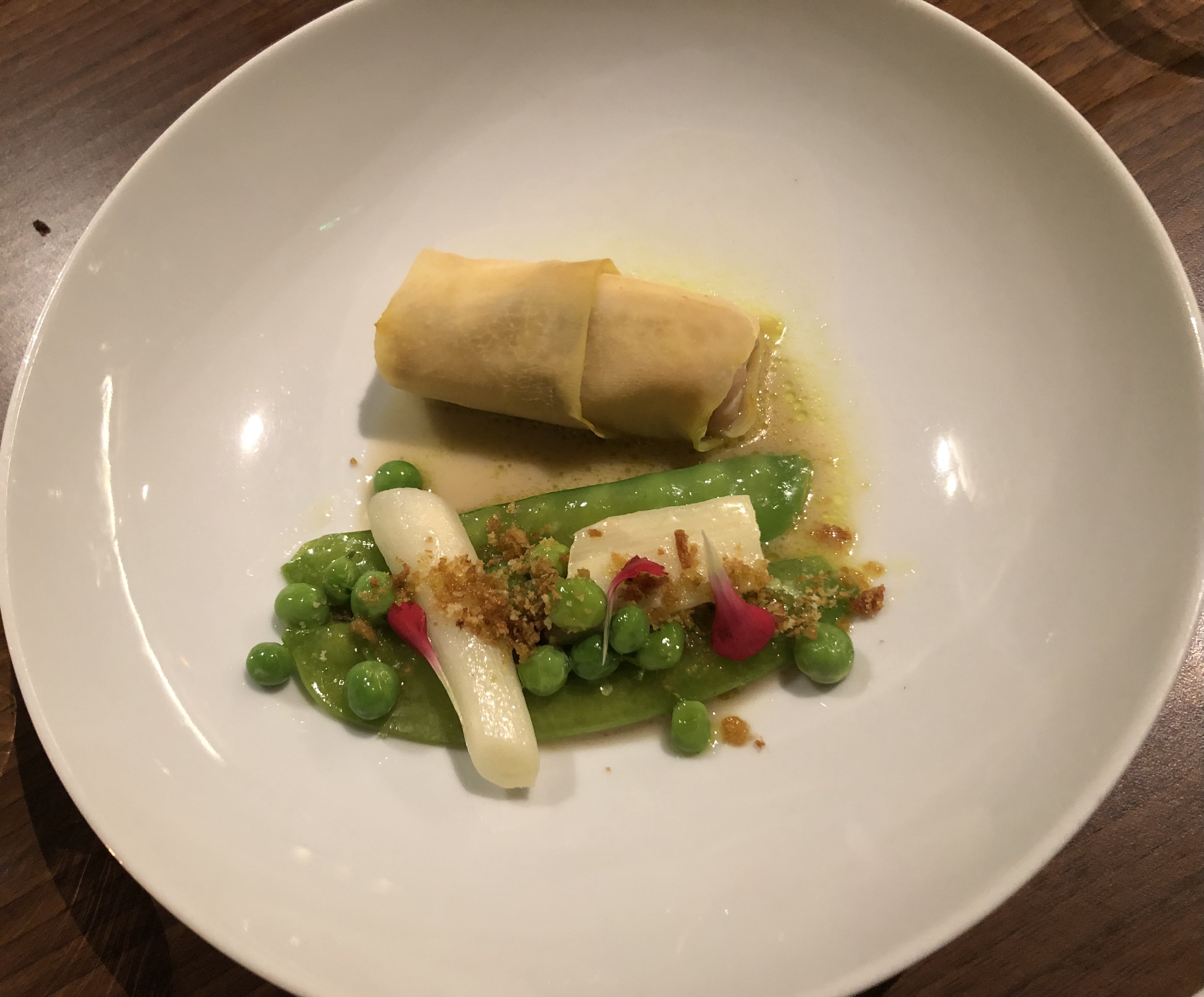 En el tema pescado, una Corvina con espárragos y guisantes, envuelta en pasta brie, al punto de cocción y con unas verduras exquisitas al dente de sabor potente, extraordinario.