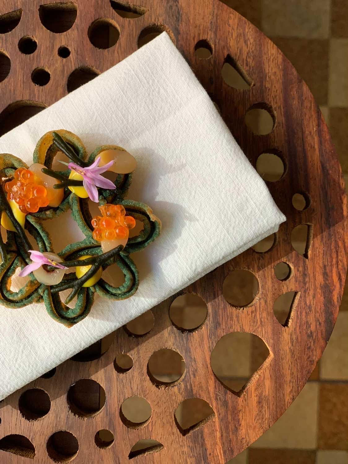 Después la Galleta de garbanzo, balchao, gamba y de algas.