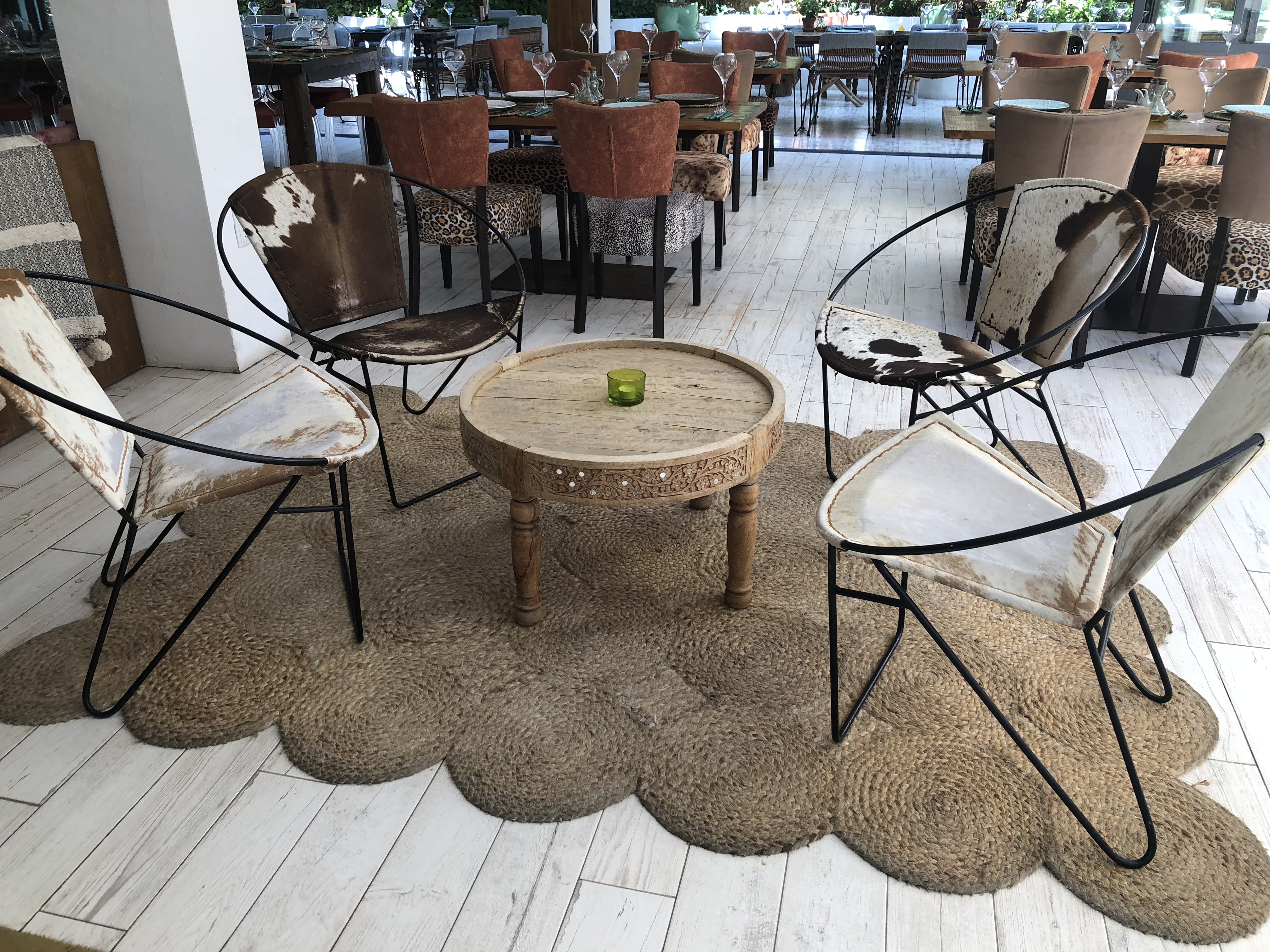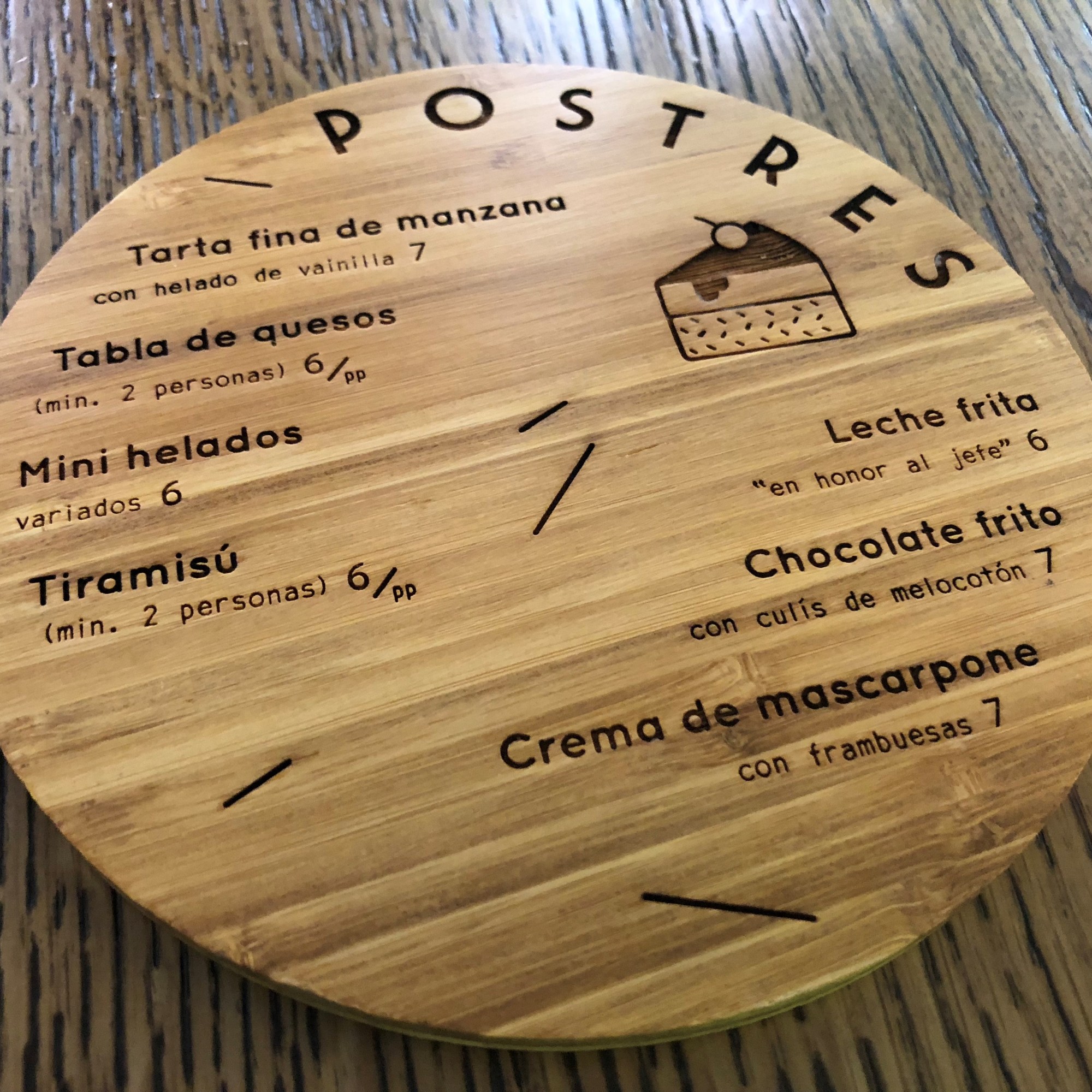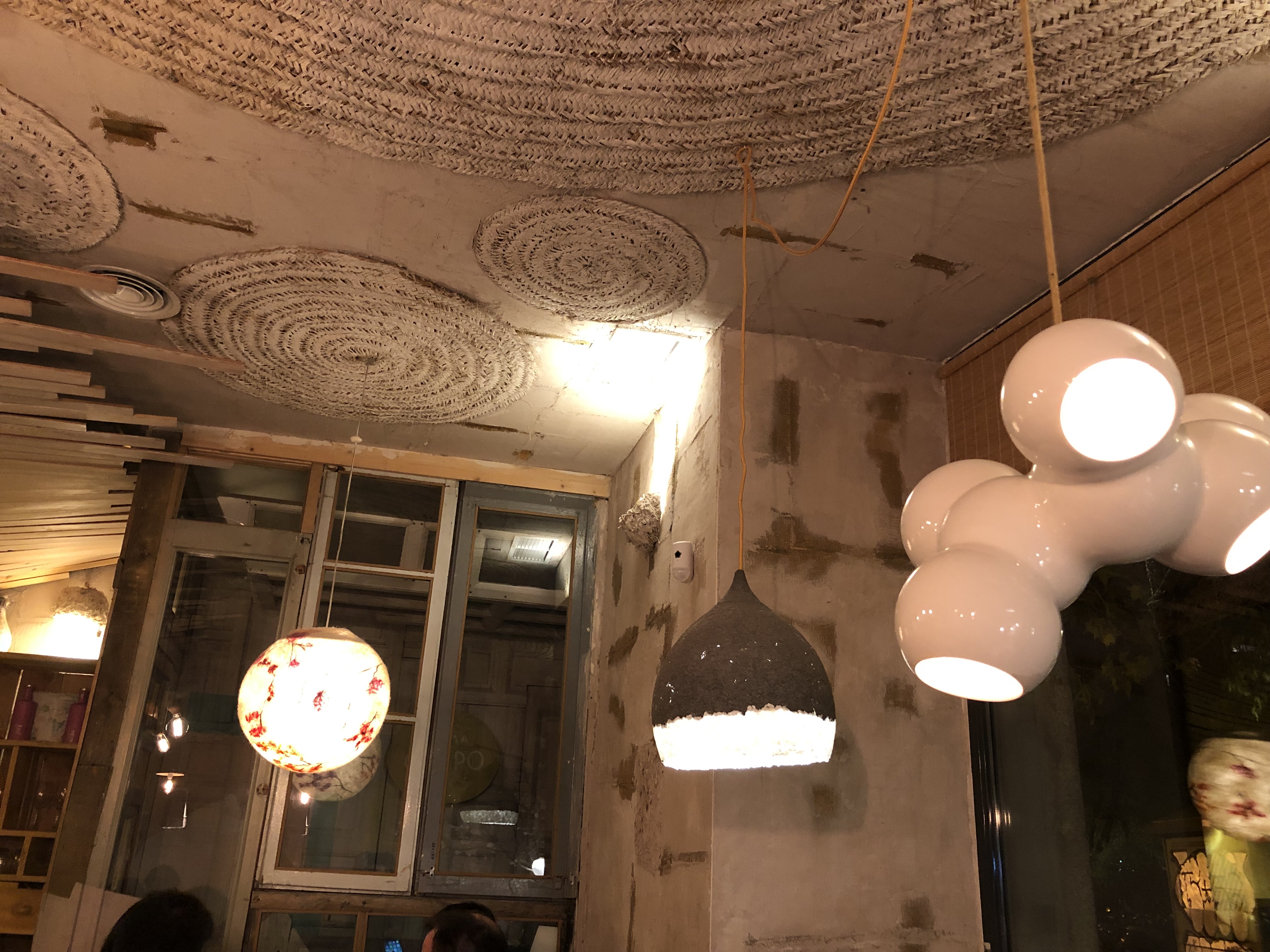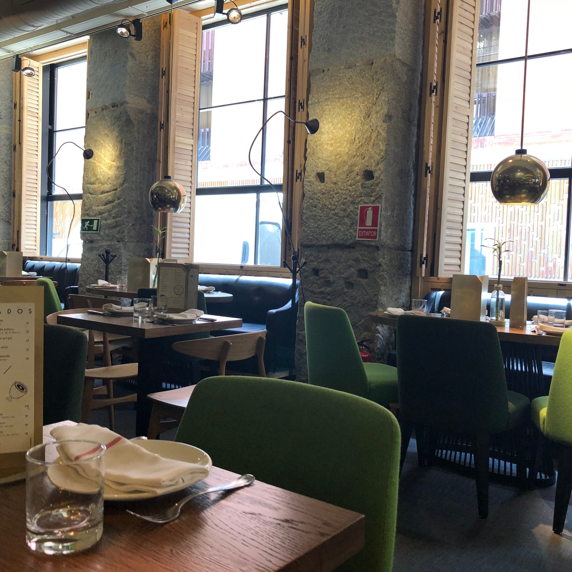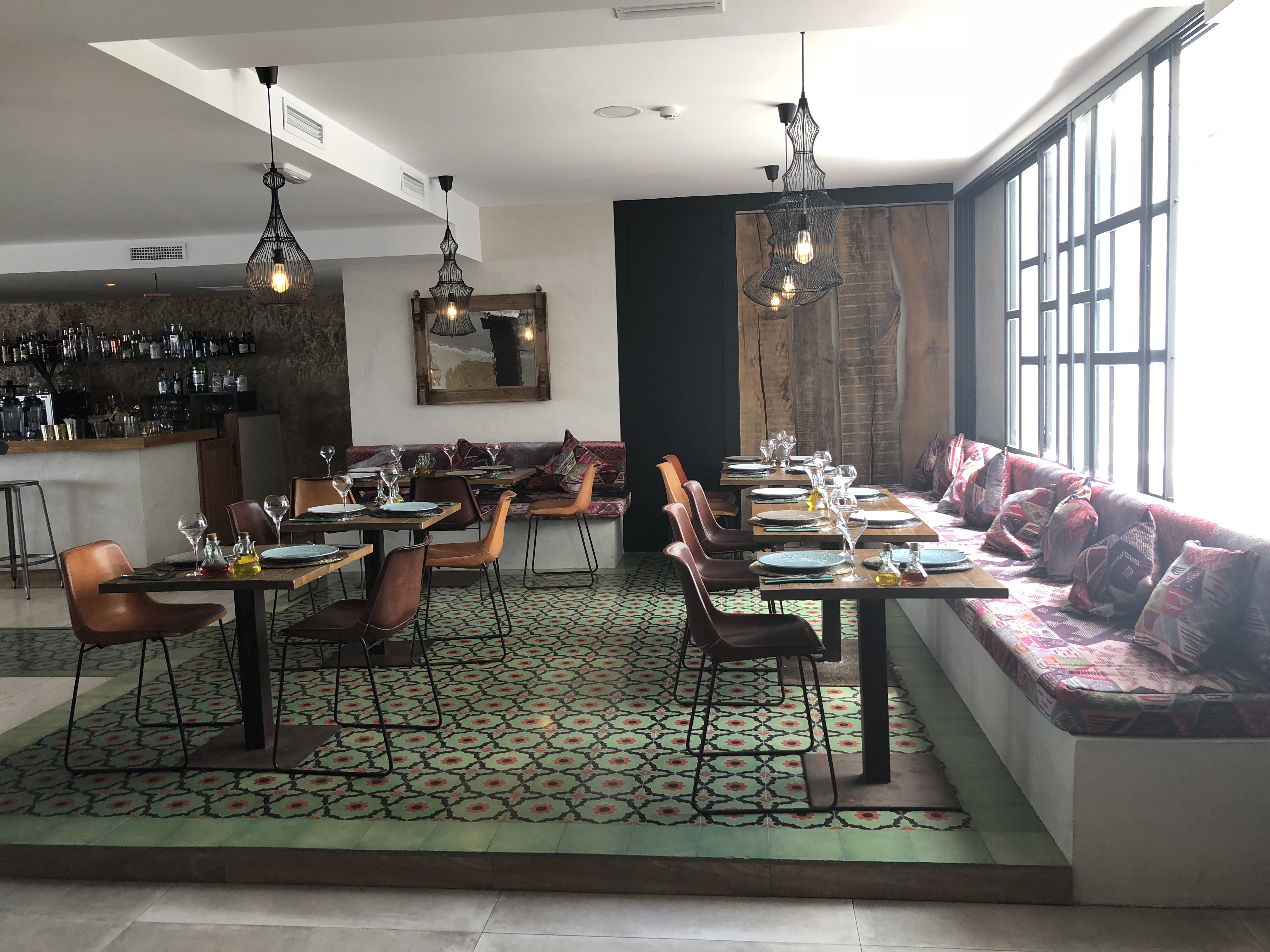 Es muy curioso que en cuanto entras en la sala cambie tanto el ambiente. De la penumbra pasamos a una luminosidad excesiva, quizás se deba a que Noor en árabe significa luz. Un espacio minimalista con mesas redondas, blancas, sin mantel; blanco también en las paredes desnudas; la cocina vista al fondo y todos los comensales mirando hacia ella. Destacando así el suelo, un original mosaico y su techo, una enorme estructura de madera a modo de cúpula, impactante, dando a la sala un singular juego de luces, que atenúa el exceso de luz.