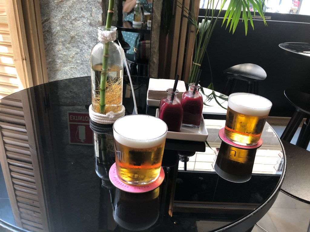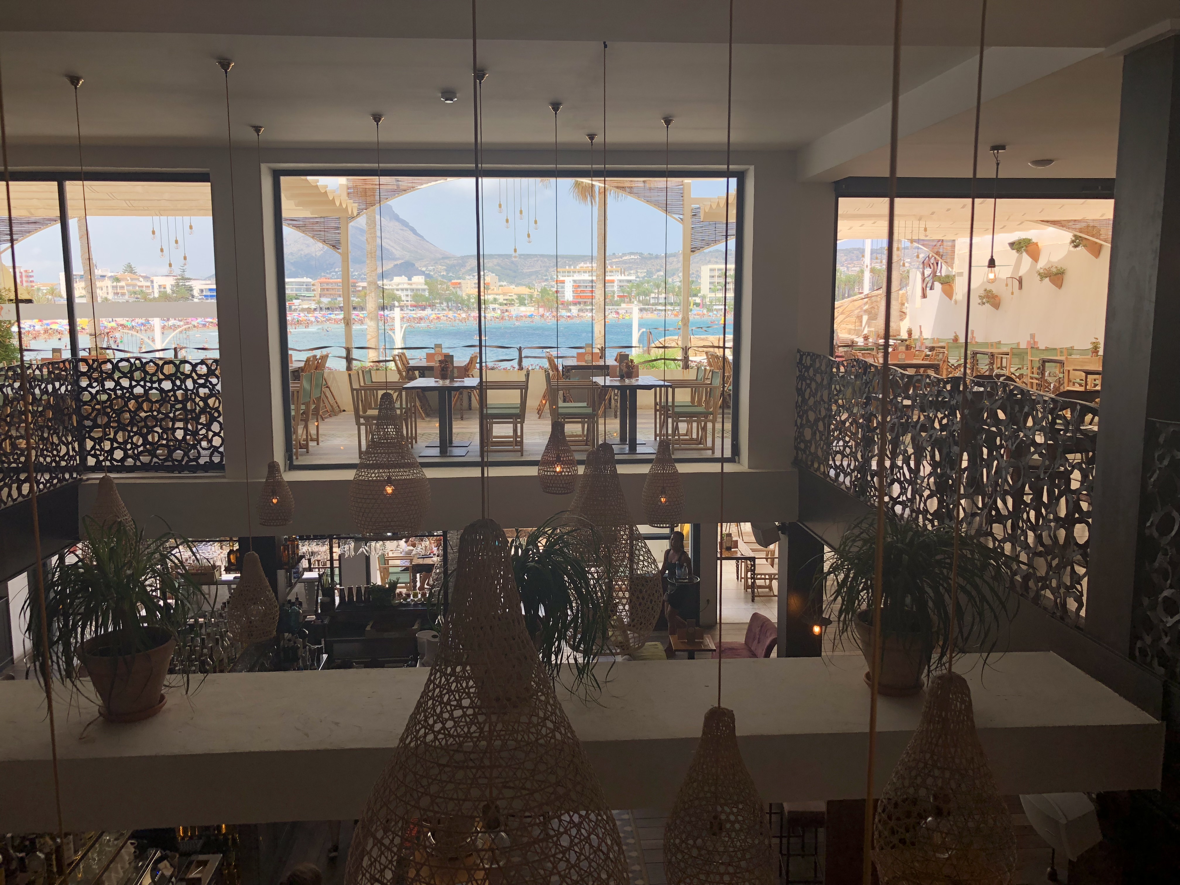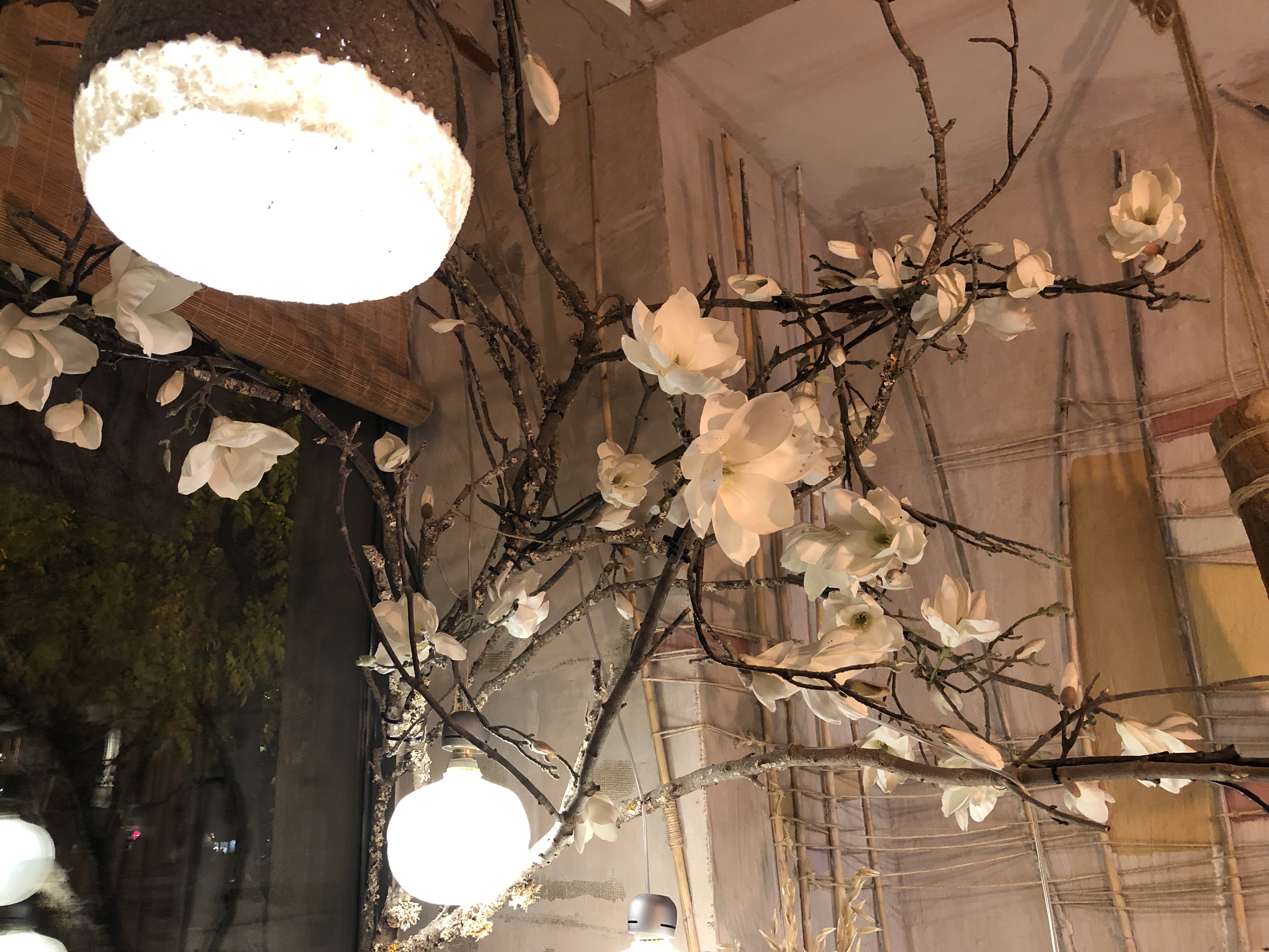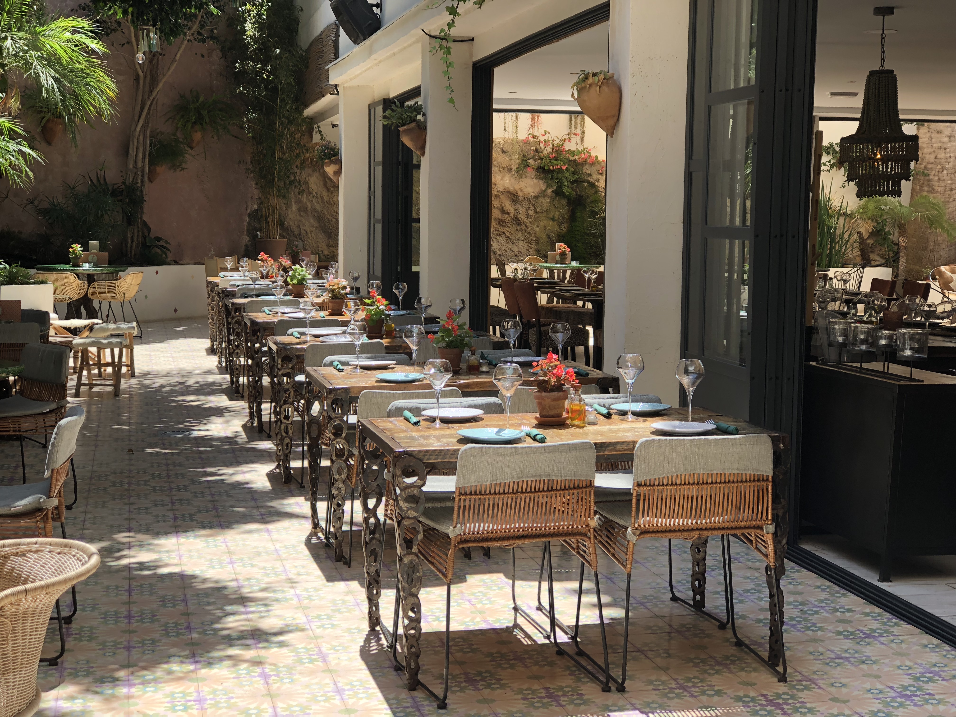 Es muy curioso que en cuanto entras en la sala cambie tanto el ambiente. De la penumbra pasamos a una luminosidad excesiva, quizás se deba a que Noor en árabe significa luz. Un espacio minimalista con mesas redondas, blancas, sin mantel; blanco también en las paredes desnudas; la cocina vista al fondo y todos los comensales mirando hacia ella. Destacando así el suelo, un original mosaico y su techo, una enorme estructura de madera a modo de cúpula, impactante, dando a la sala un singular juego de luces, que atenúa el exceso de luz.