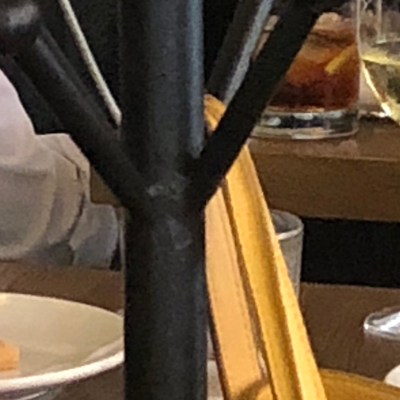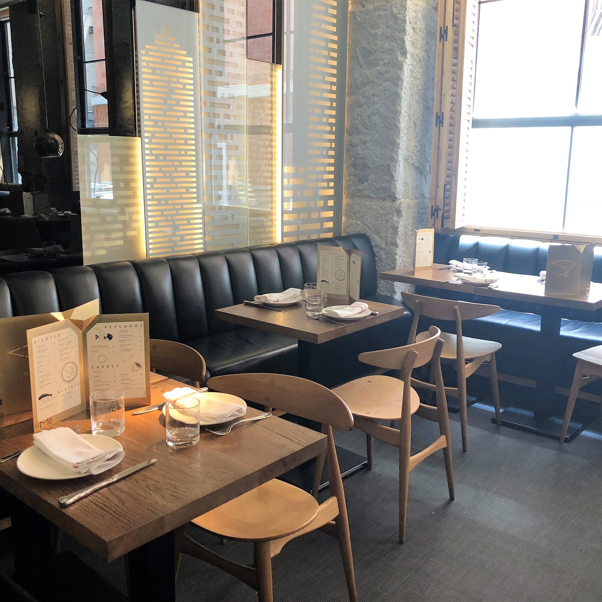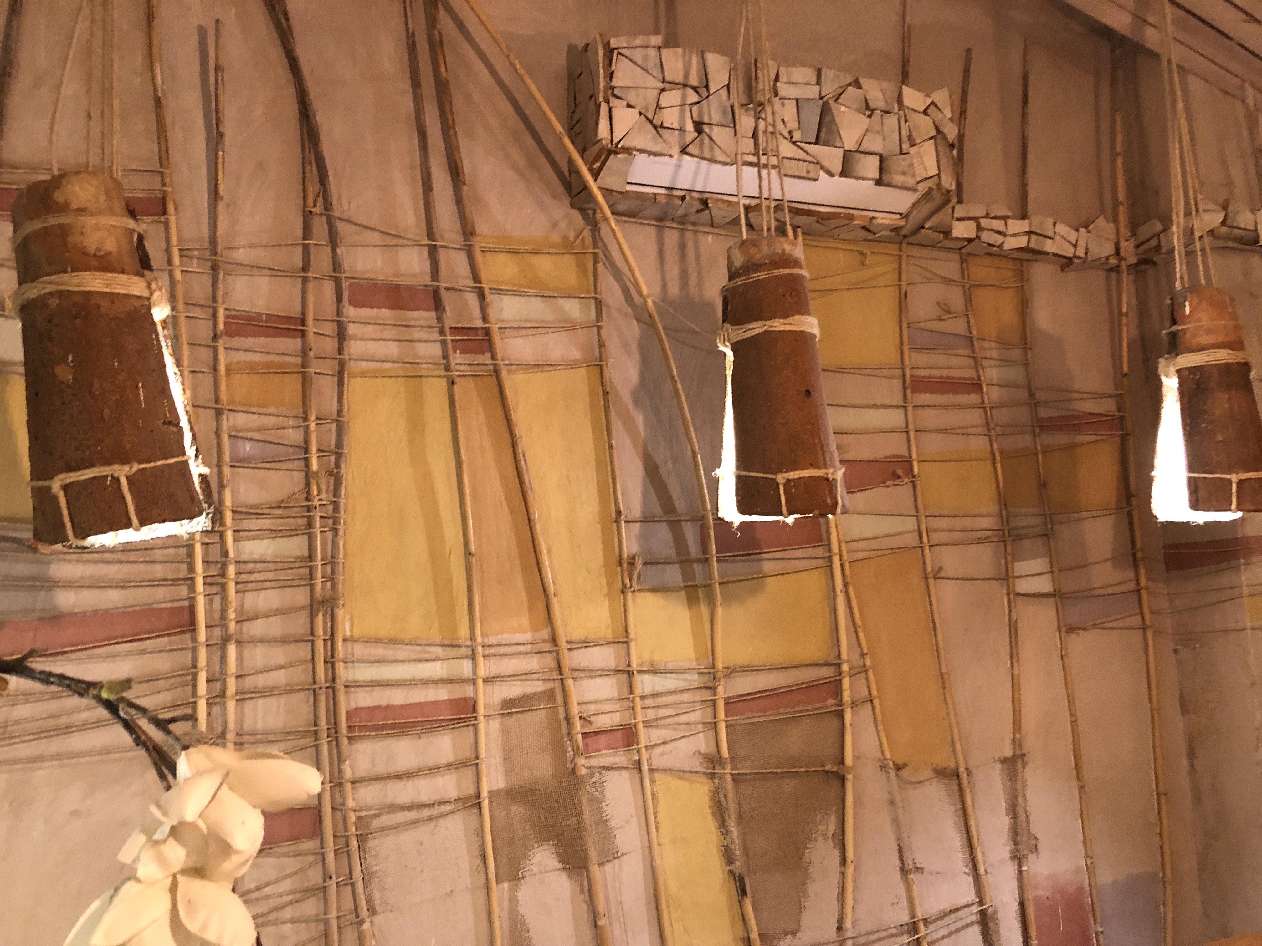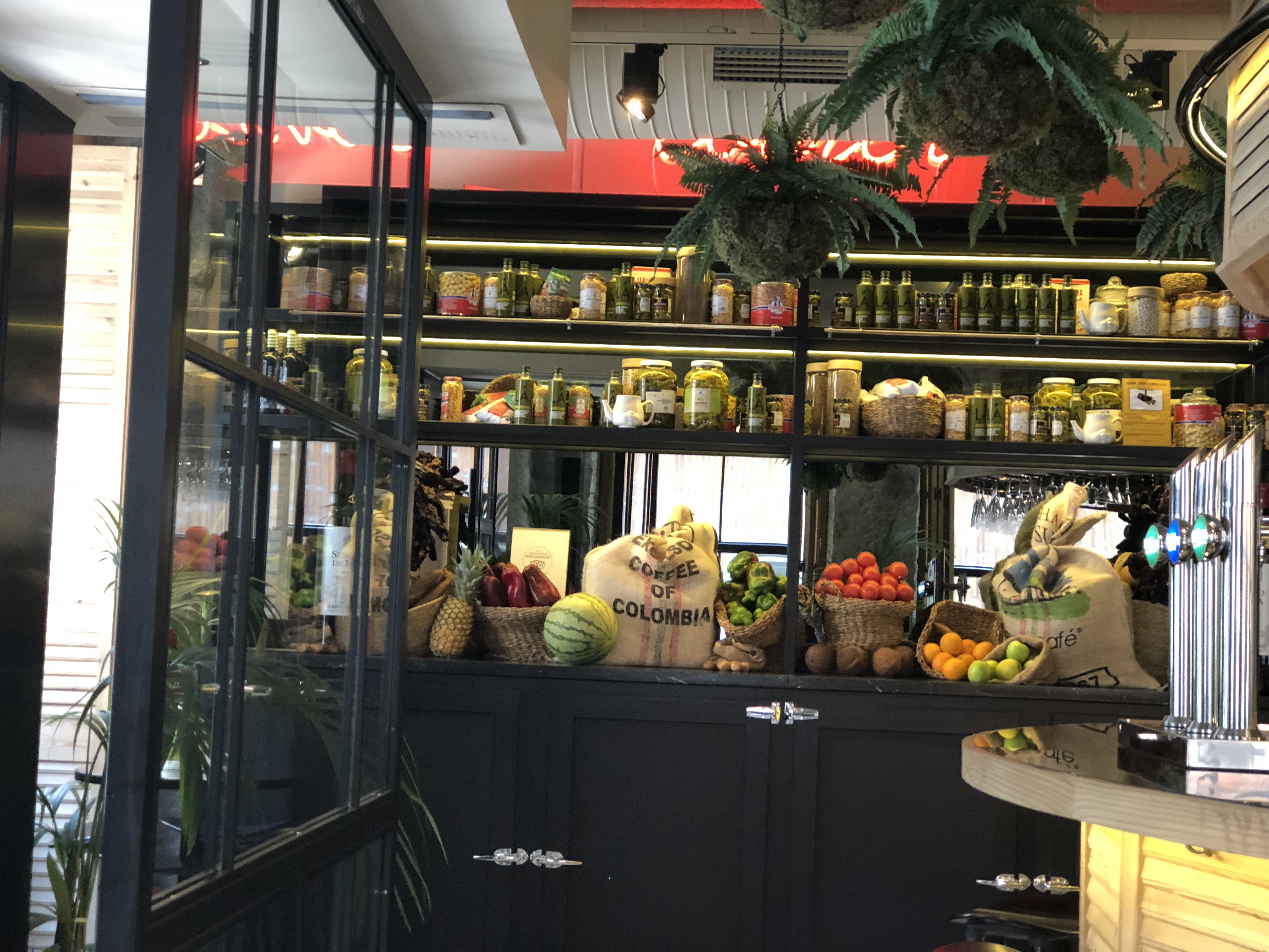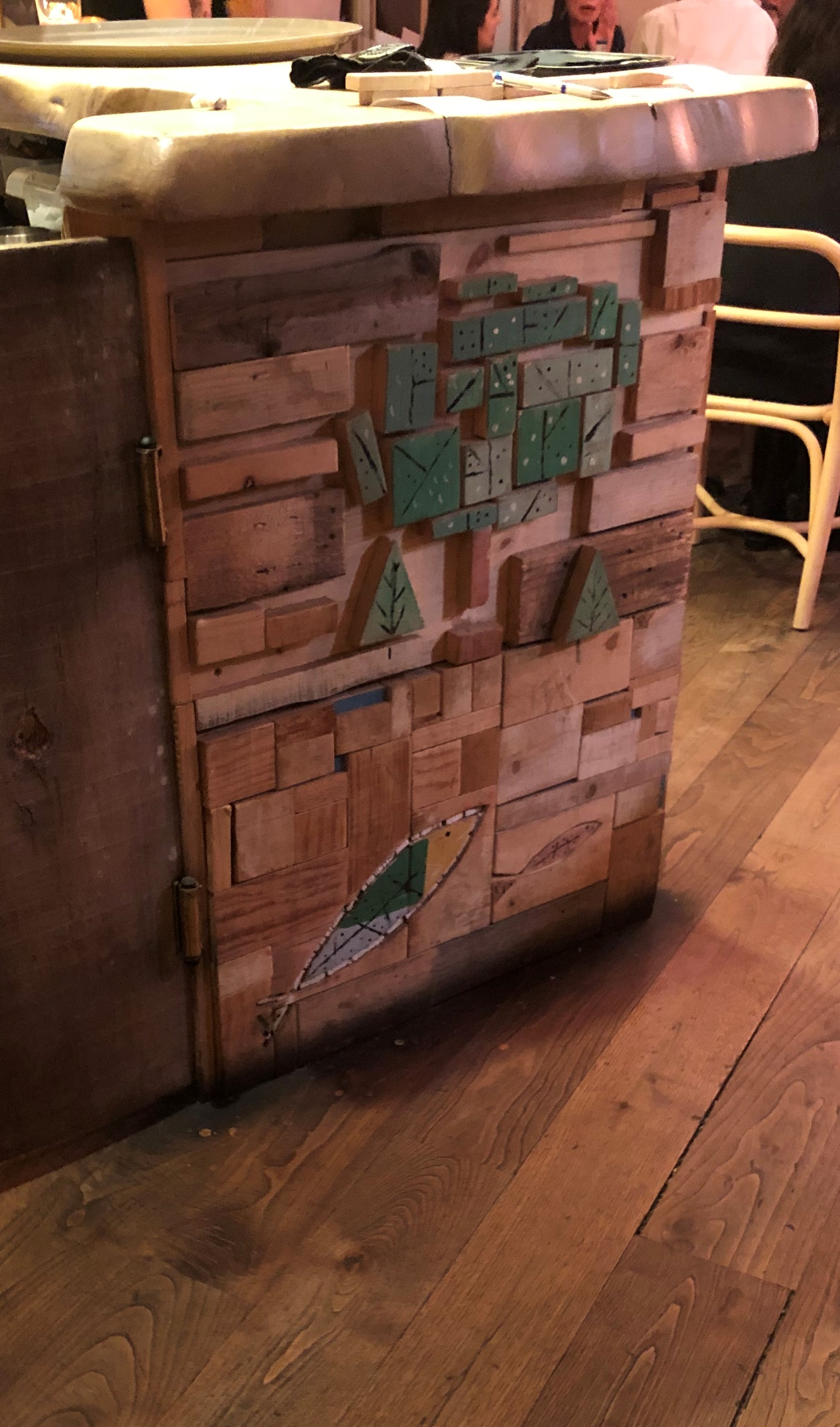 Es muy curioso que en cuanto entras en la sala cambie tanto el ambiente. De la penumbra pasamos a una luminosidad excesiva, quizás se deba a que Noor en árabe significa luz. Un espacio minimalista con mesas redondas, blancas, sin mantel; blanco también en las paredes desnudas; la cocina vista al fondo y todos los comensales mirando hacia ella. Destacando así el suelo, un original mosaico y su techo, una enorme estructura de madera a modo de cúpula, impactante, dando a la sala un singular juego de luces, que atenúa el exceso de luz.