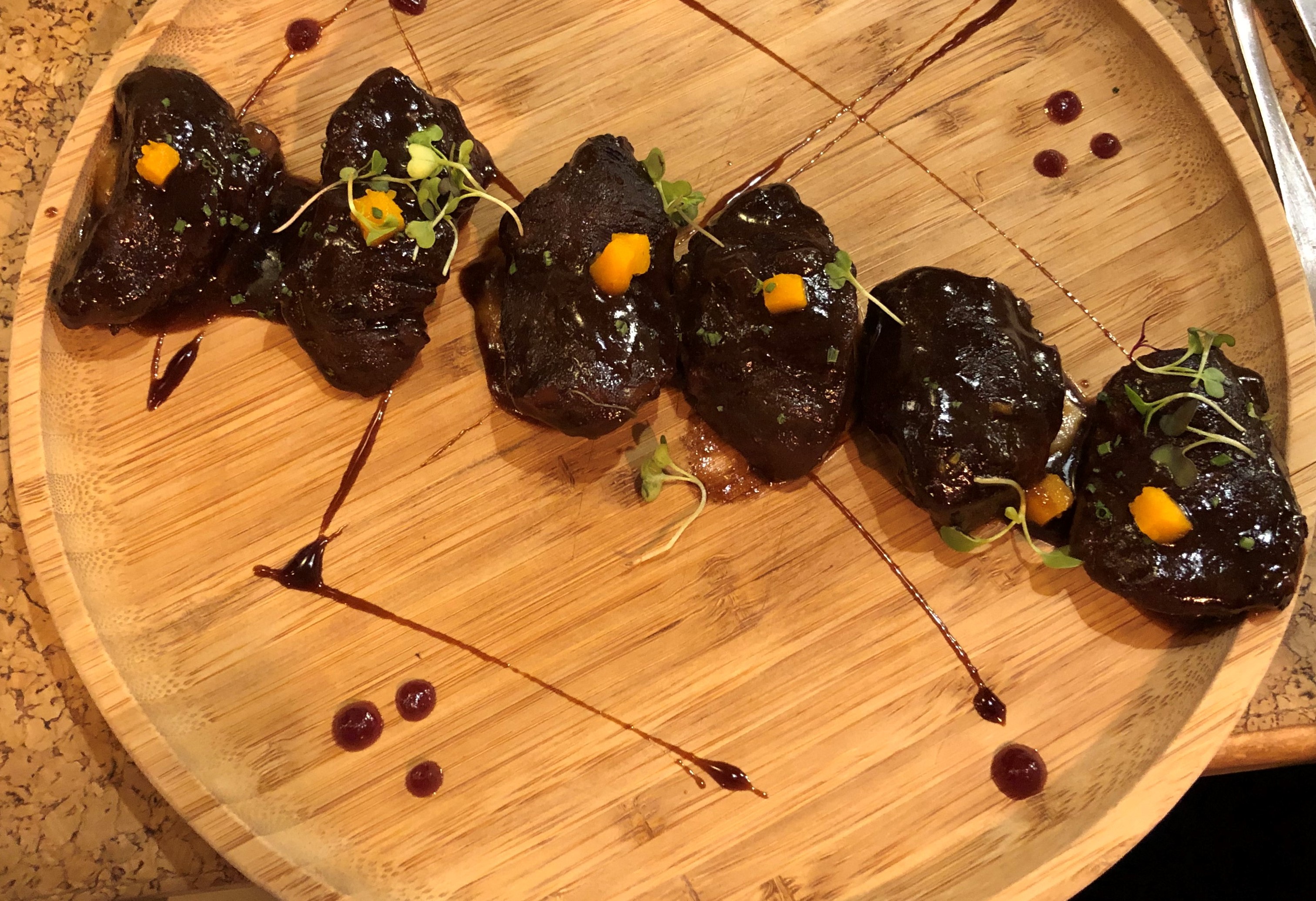 Comenzamos los primeros con Karim de Almendra tostada, erizo del Sáhara y manzana verde con Zumaque. Con una presentación preciosa en su simetría diminuta, aunque te expliquen el plato, te pasas un rato adivinando su composición a partir de los novedosos sabores.