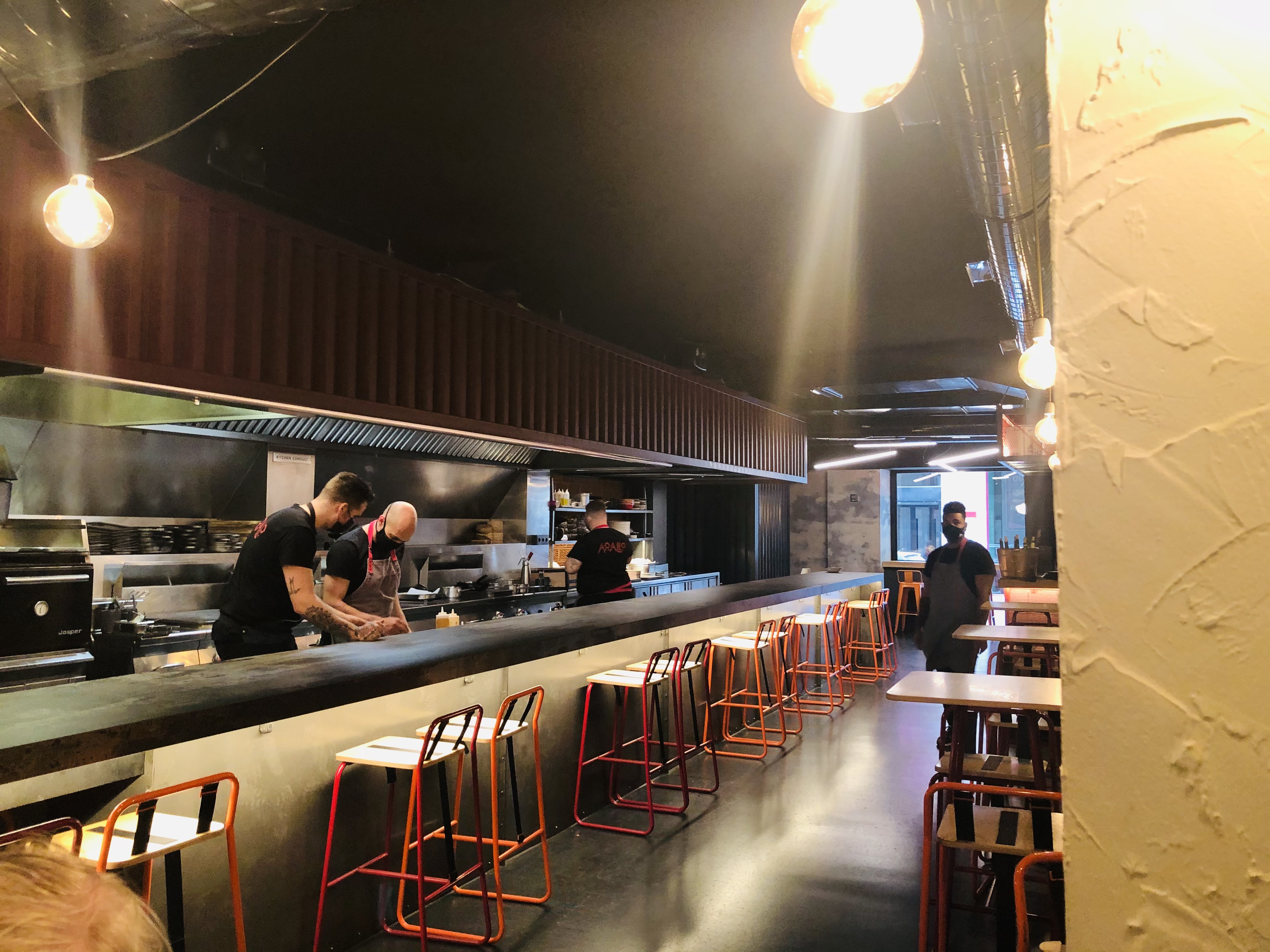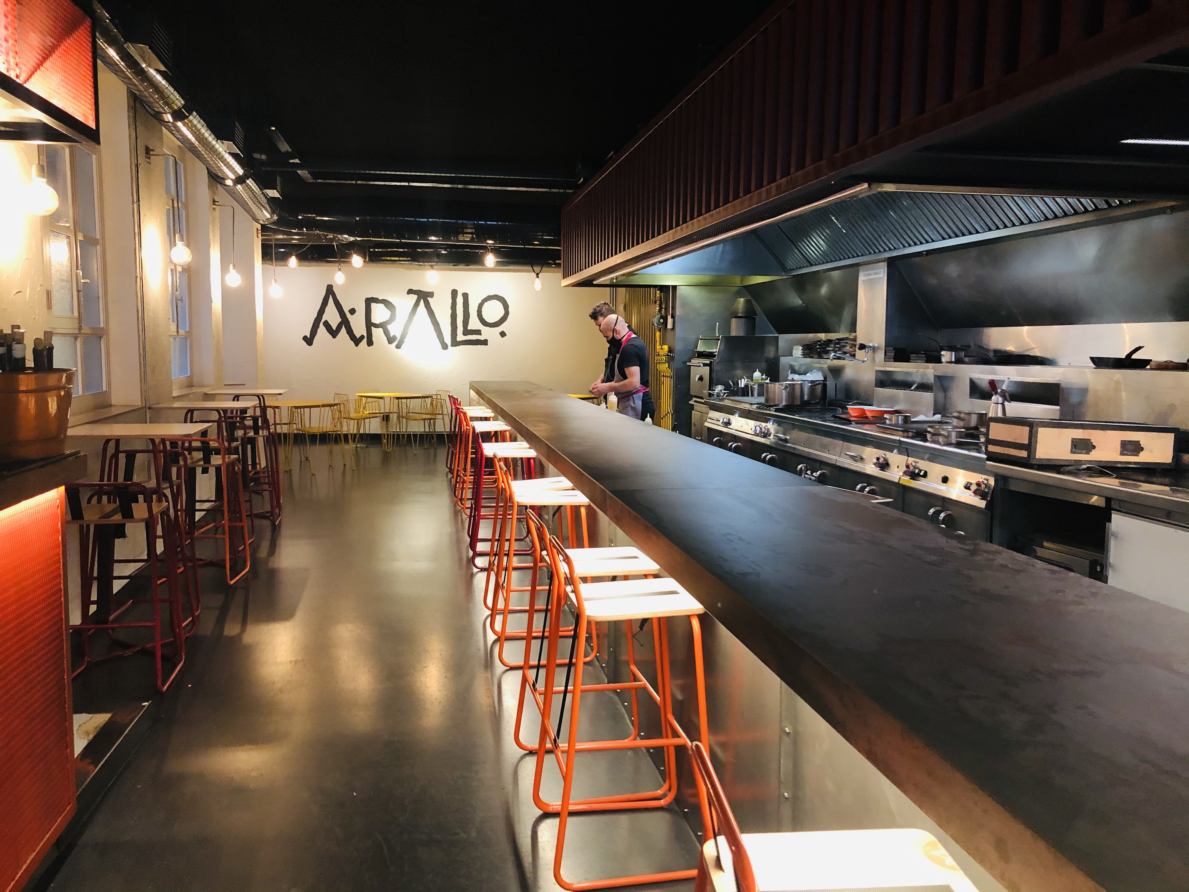 Se llama Arallo taberna, y ese espíritu yo creo que es el que quieren transmitir, un concepto para comer en su moderna e impresionante barra, desde donde puedes ver el espectáculo de los cocineros y los camareros trabajando.