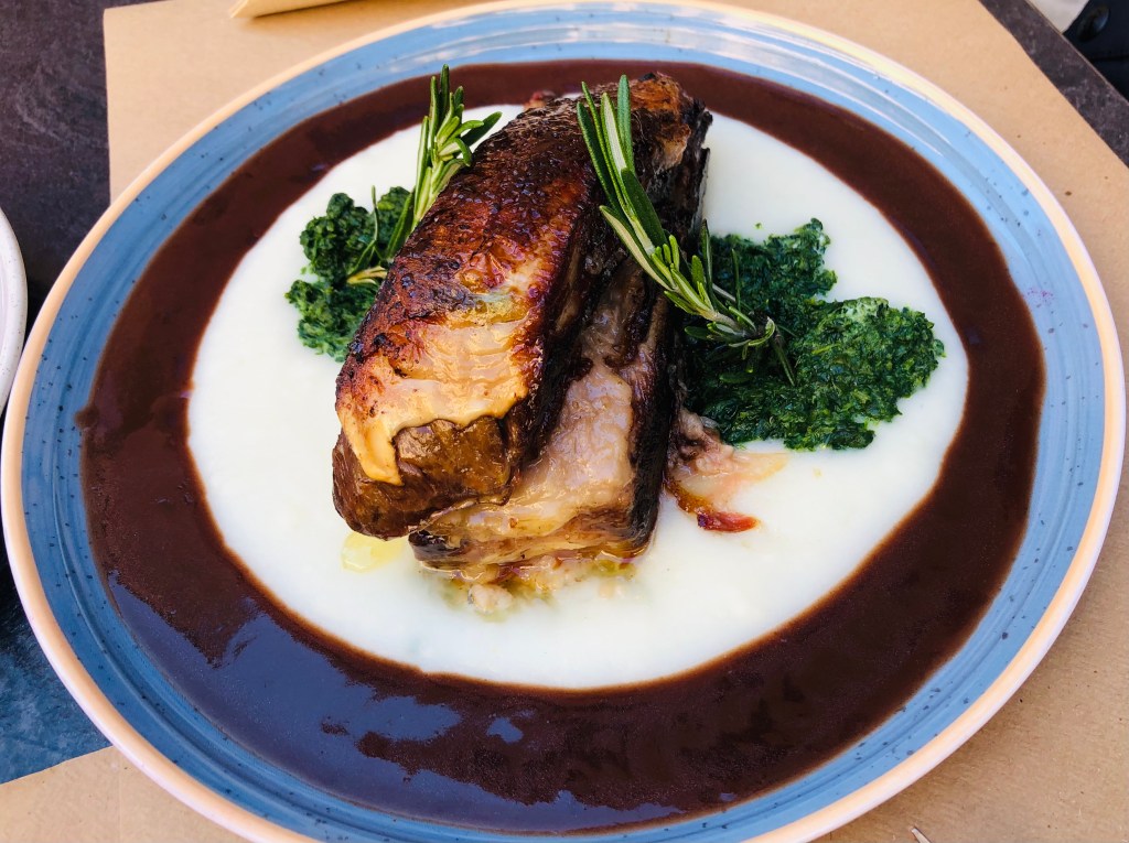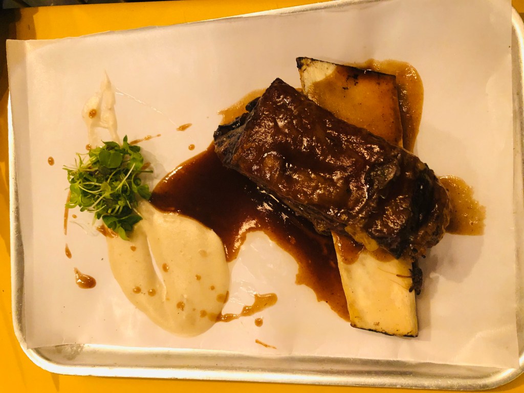 Imprescindible la Costilla de vaca asada 12 horas y ahumada a las brasas, servida sobre puré de taro asado