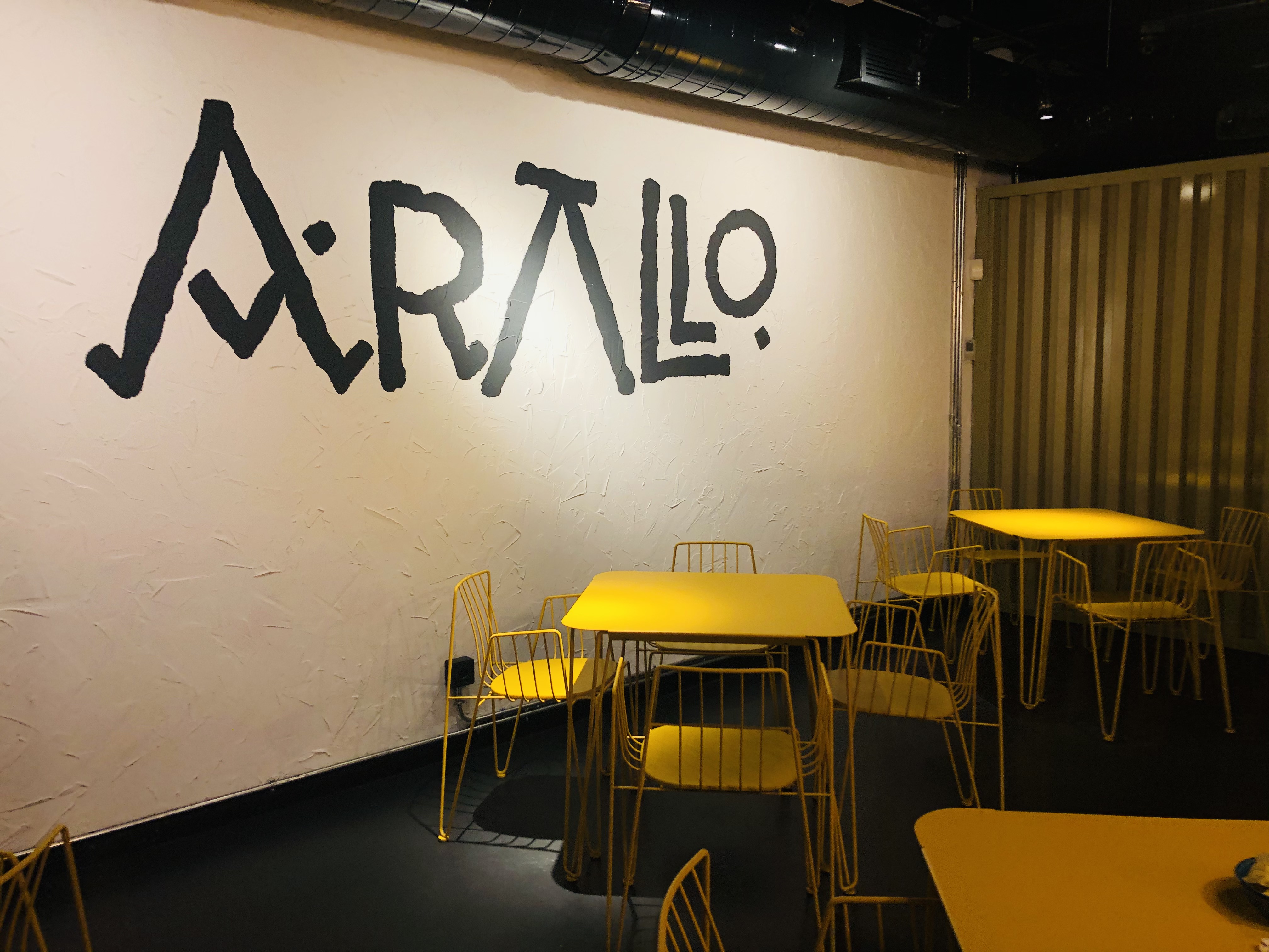 Aun así, no te deja indiferente. El local con su estética industrial. Unas mesas al fondo, vivos colores en el mobiliario, amarillos, rojos, música y una dinámica muy activa en su personal.