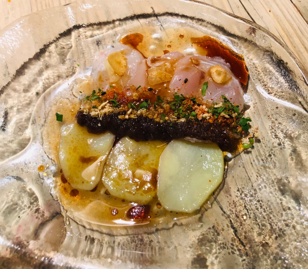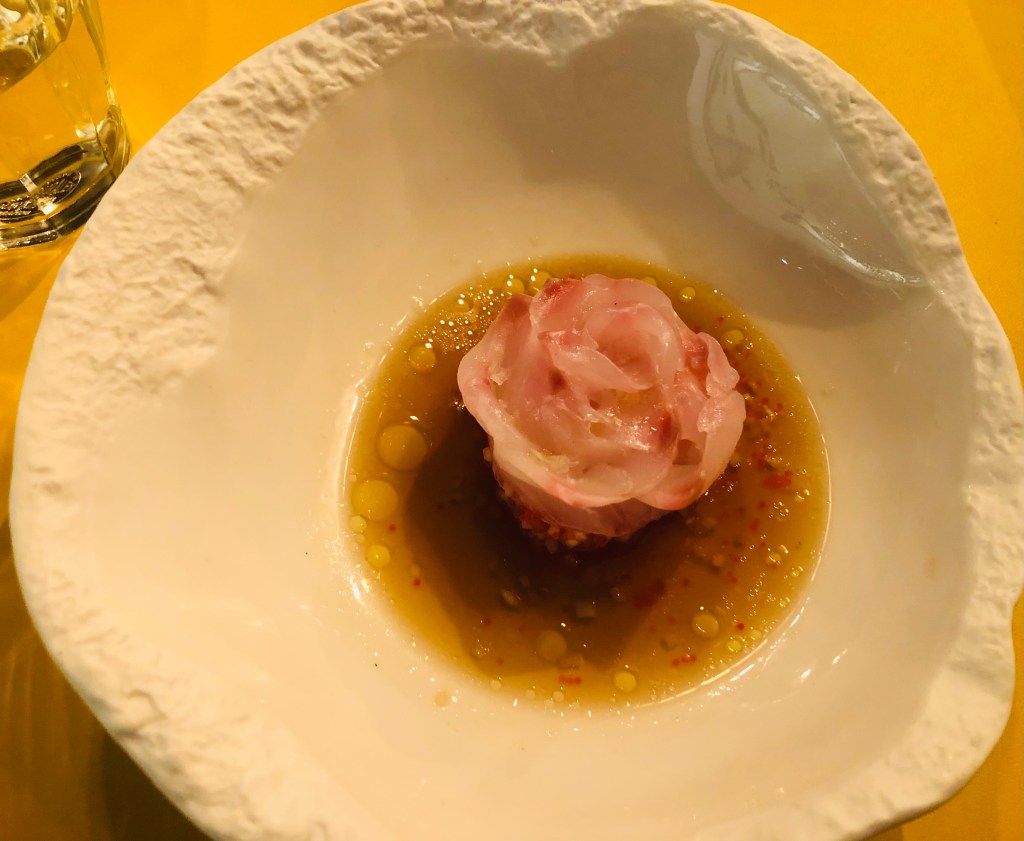Con la miel en los labios del plato anterior nos presentan el Besugo a la madrileña muy poco hecho. Increíble, porque al verlo efectivamente es crudo, pero en boca es como si te estuvieses comiendo un tradicional besugo al horno, absolutamente fantástico.
