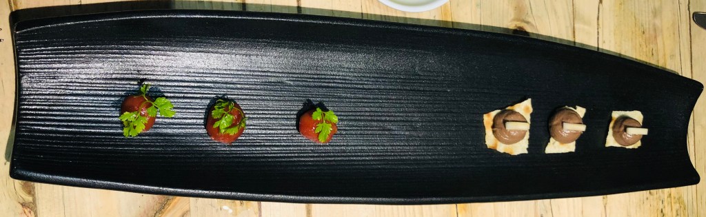 Y así comenzamos con unos muy logrados aperitivos. Tuvieron el detalle de ponernos tres cuando solo dos de los tres comensales que éramos elegimos la degustación.