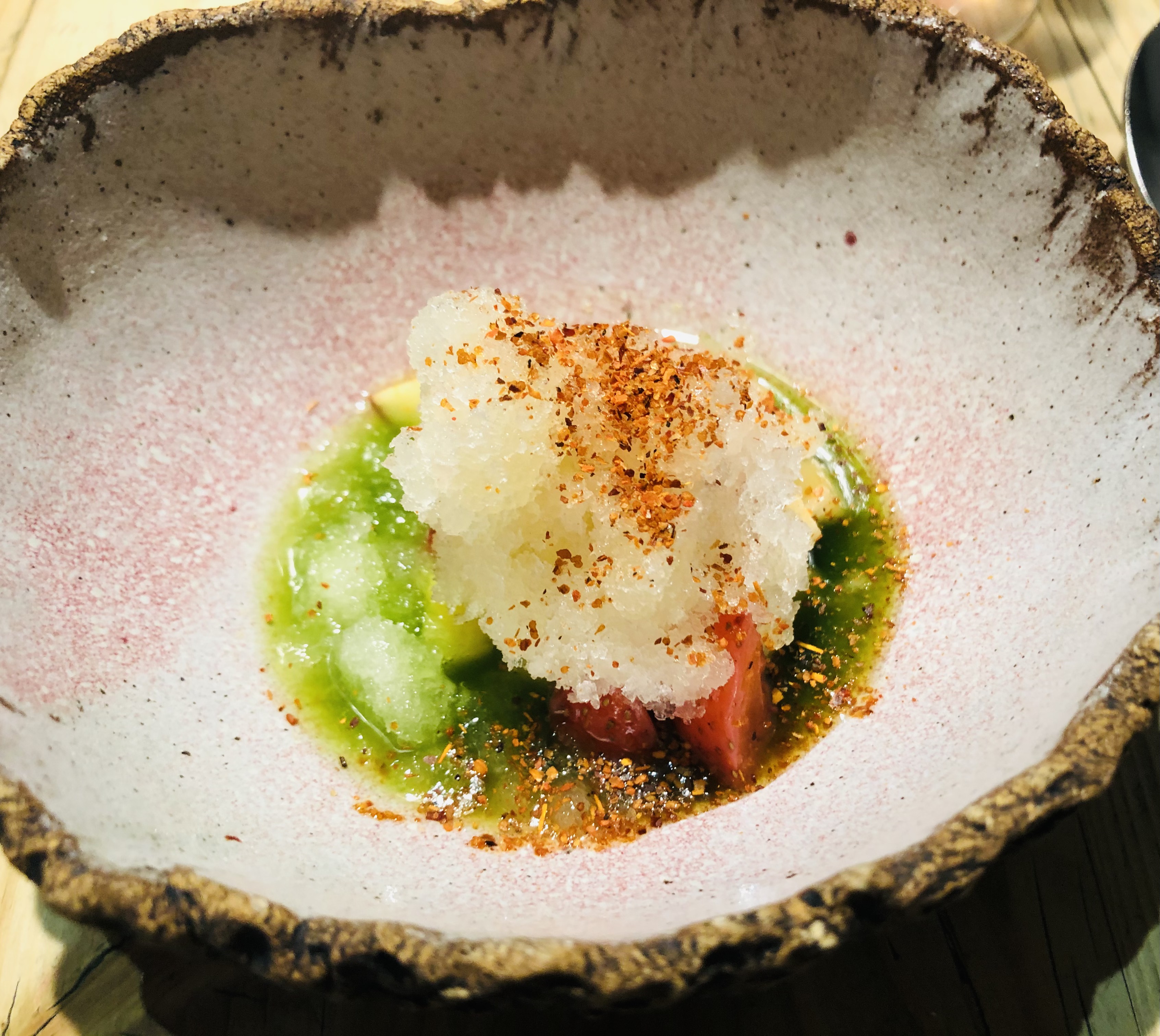 Otro toque asiático esta vez con pescado un suave Sashimi de lubina con una presentación muy bonita.
