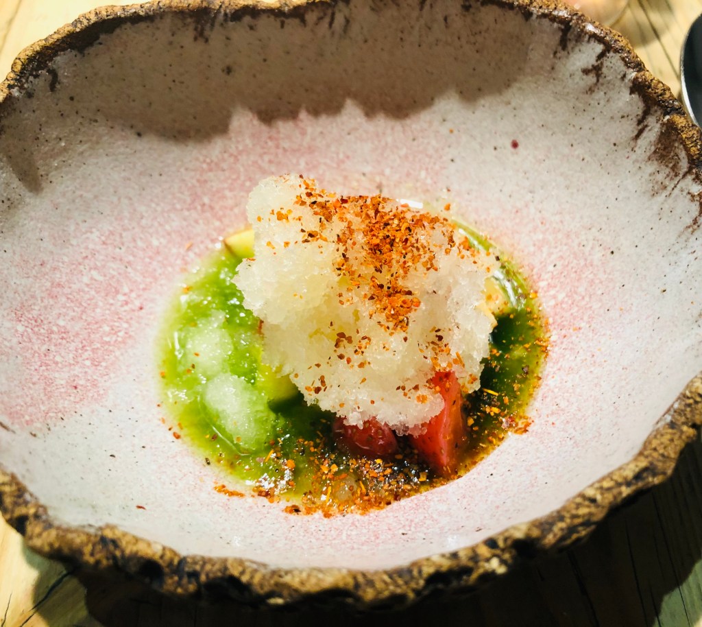 Un delicioso Profiterol de Merluza, unos Mochis, un exquisito pastelito japonés de pescado, y una sopa fría de Tomates Fermentados