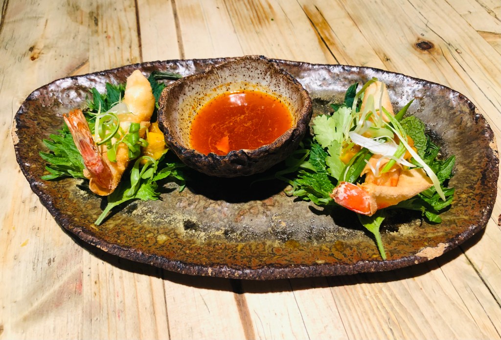 Una gamba con un fino rebozado y una base de mango que envuelta en el shiso a modo de rollito te lo puedes comer de un par de bocados mojados en una salsa deliciosa.