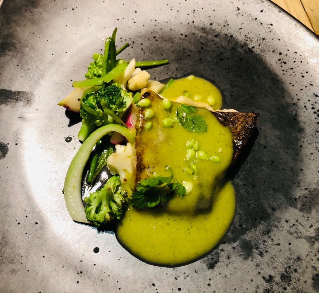 Ya en plena fiesta degustativa recibimos la Merluza a la brasa con pil pil de guisante lágrima, jugosa, riquísima con una verduritas crujientes de acompañamiento y ese original pil pil.