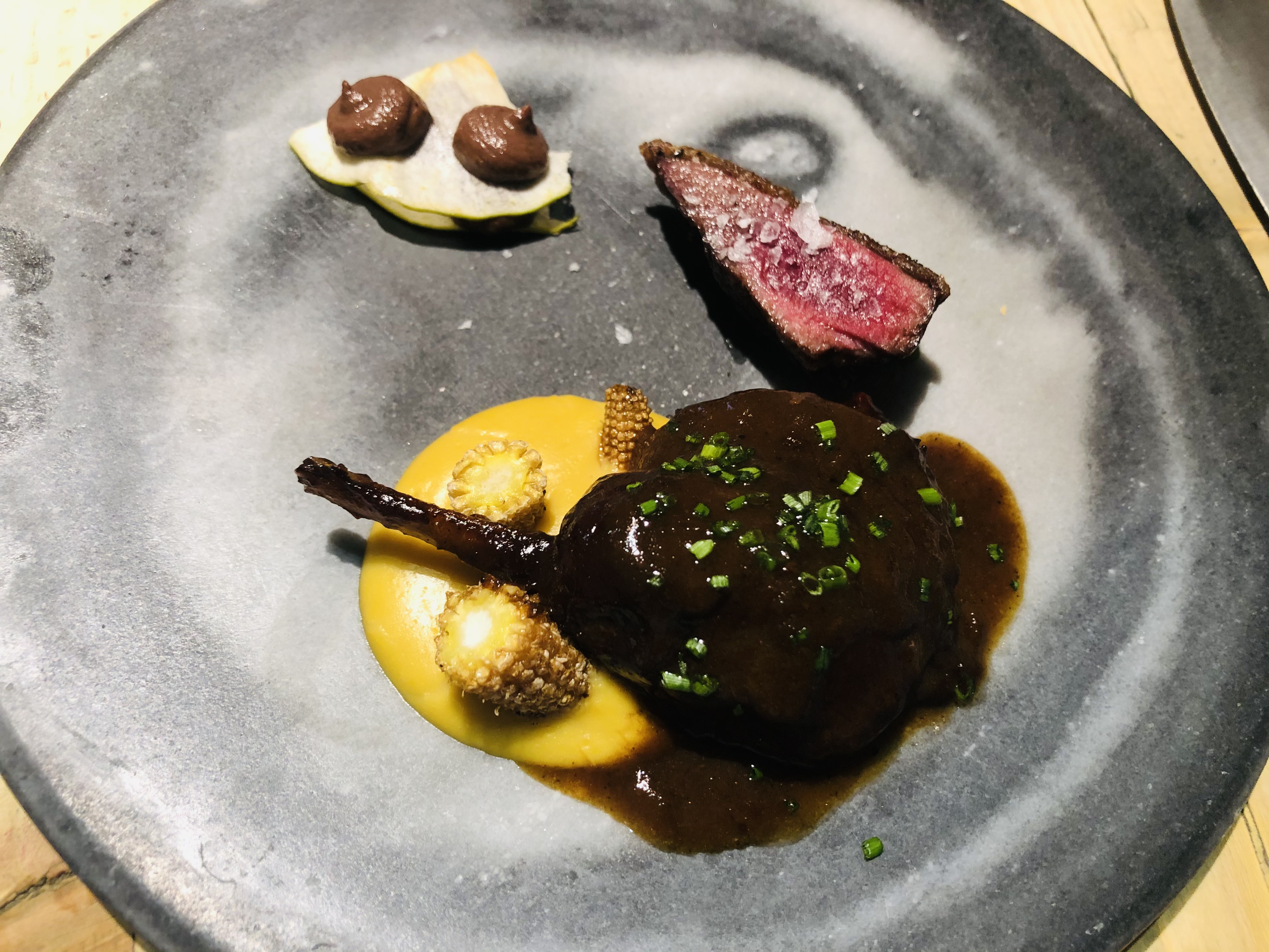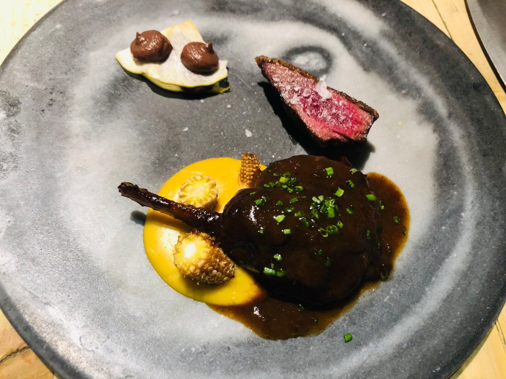 El Pato a la brasa con crema de maíz ahumado y paté casero de sus interiores, siguió el ejemplo de todo lo anterior dejándonos un sabor de boca perfecto, sin decaer en ningún momento el nivel.