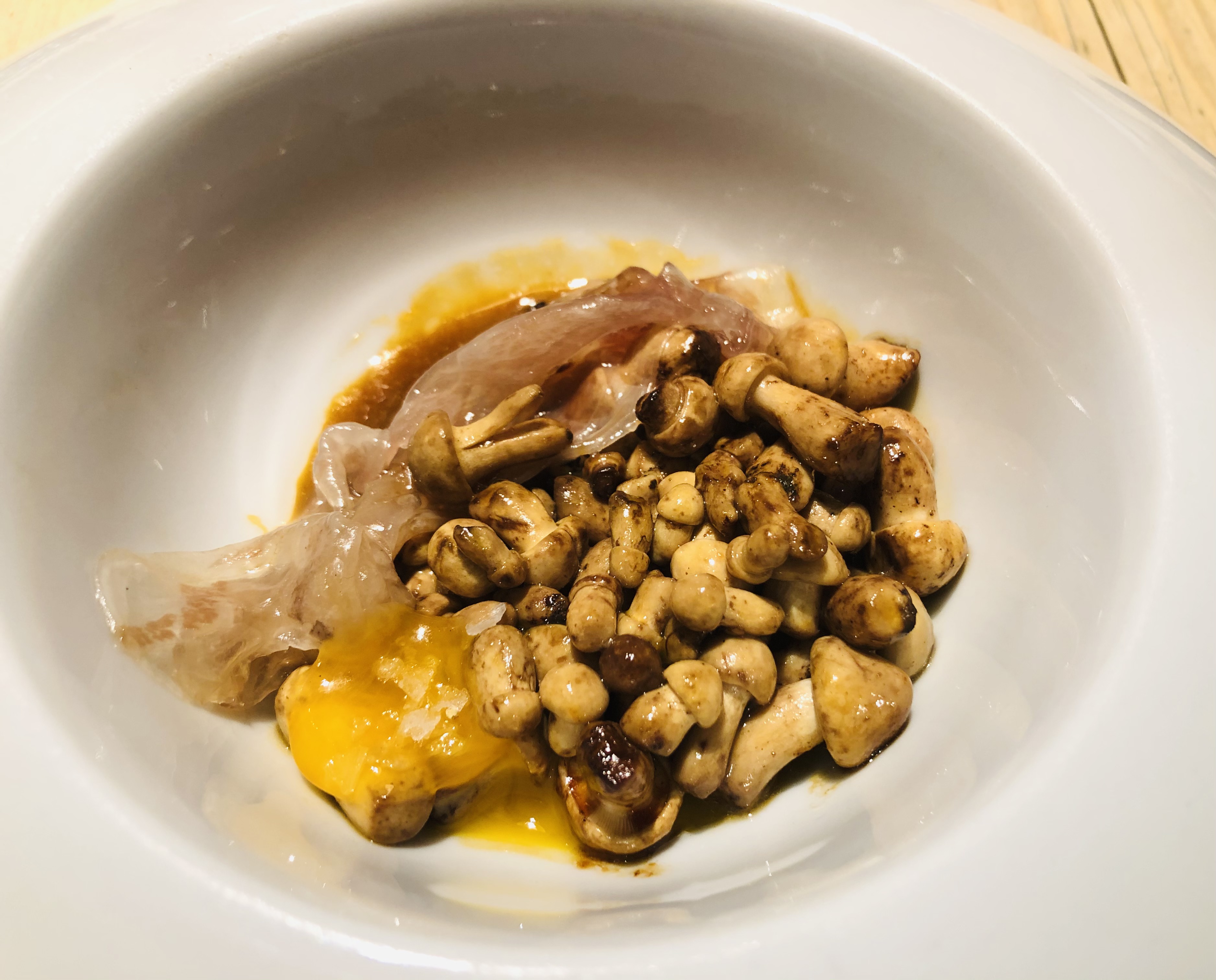 Unos Perretxicos con yema de huevo de corral, jugo de carne y papada ibérica, potencia de sabor y exquisitez.