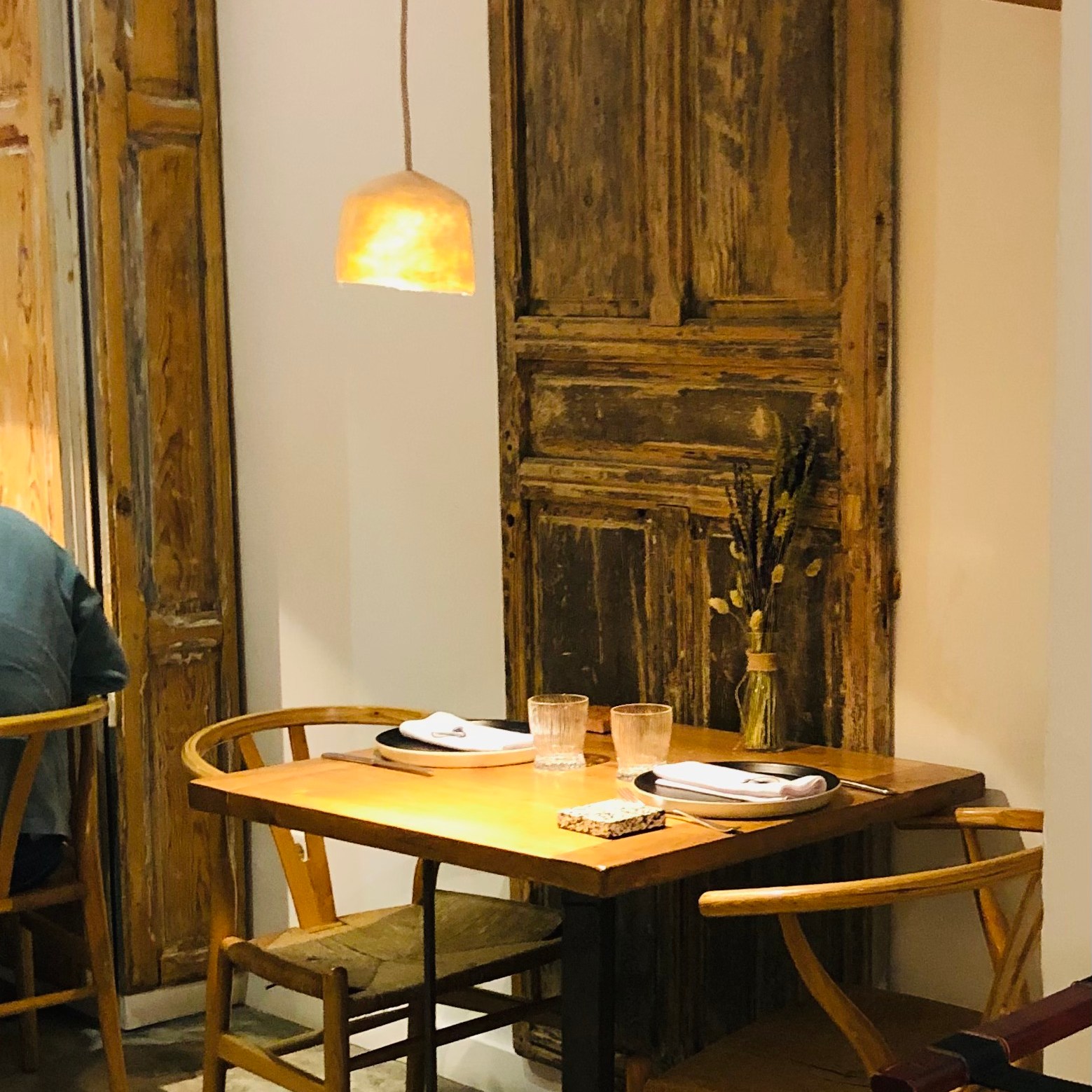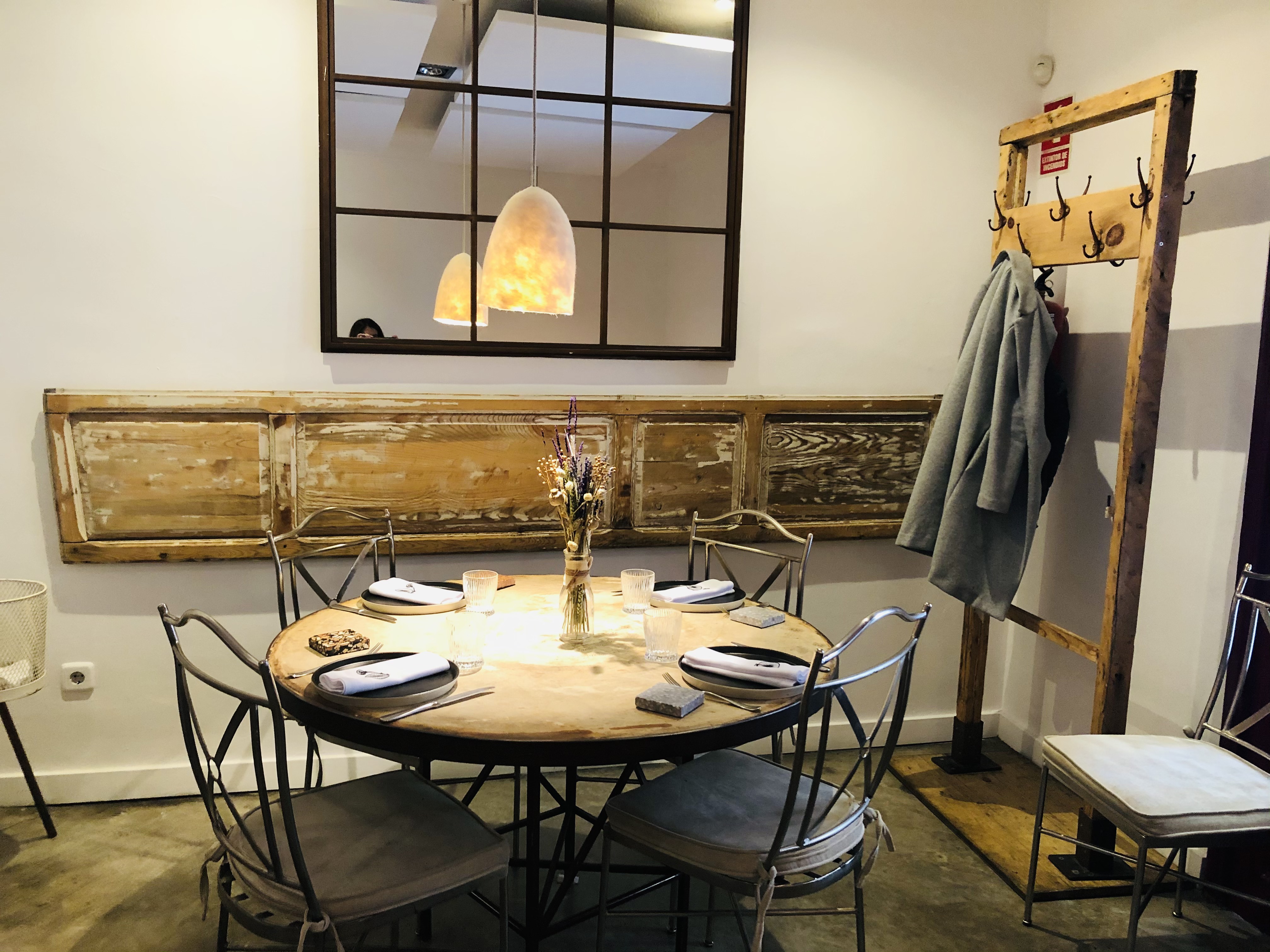 Una decoración rústica con múltiples detalles, antigüedades, como algún perchero o puerta envejecida, viejos cajones hechos pequeñas estanterías, un sencillo bouquet de flores secas sobre las mesas, algunas de ellas redondas mucho más acogedoras, y curioso el “azulejo” para posar el pan.