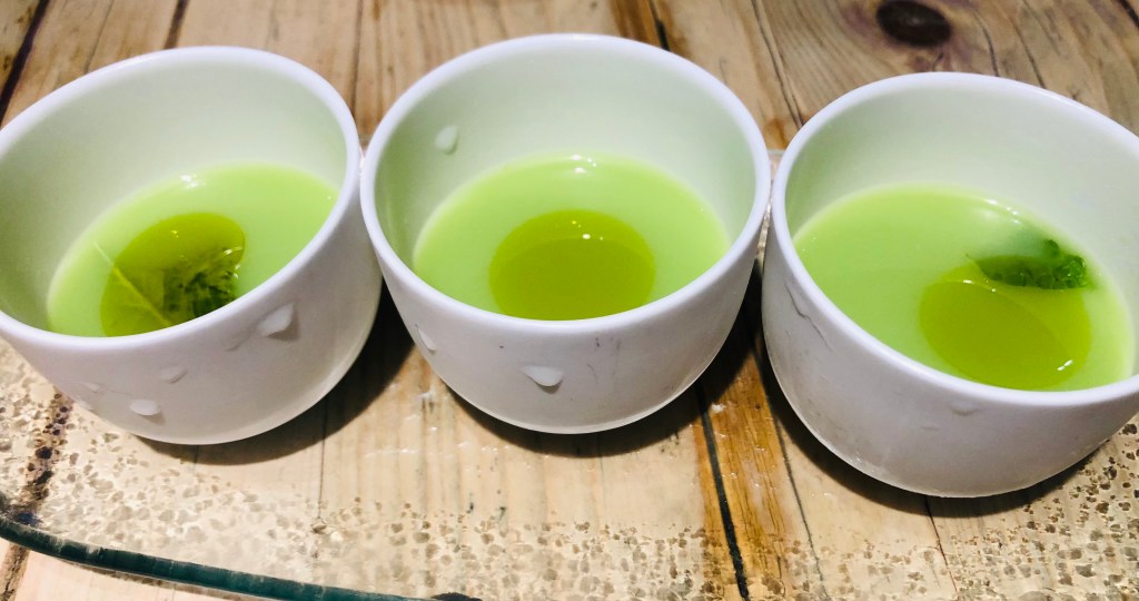 El primer postre, Frutas frescas con granizado de citrícos y una infusión de hierbabuena y albahaca, refrescante, ideal para separar sabores y pasar al siguiente más dulzón
