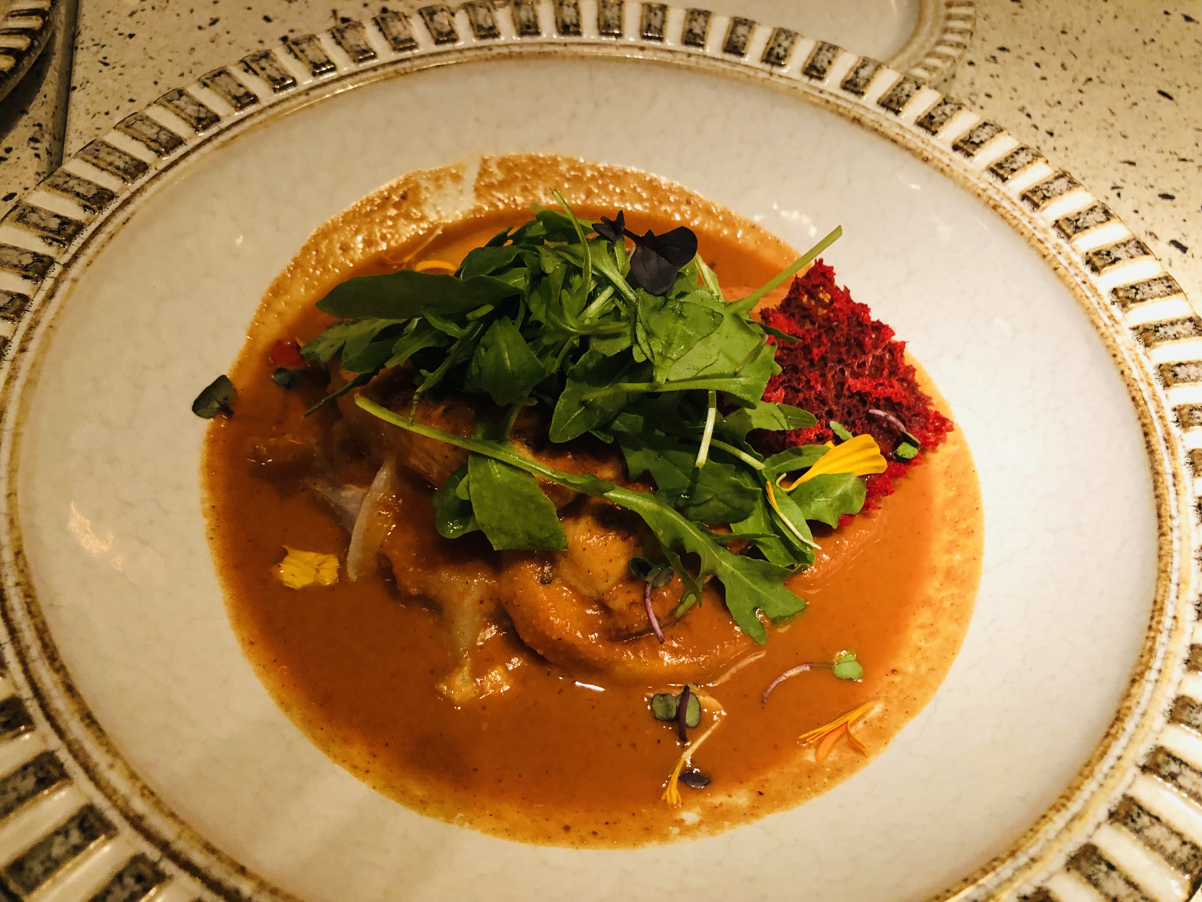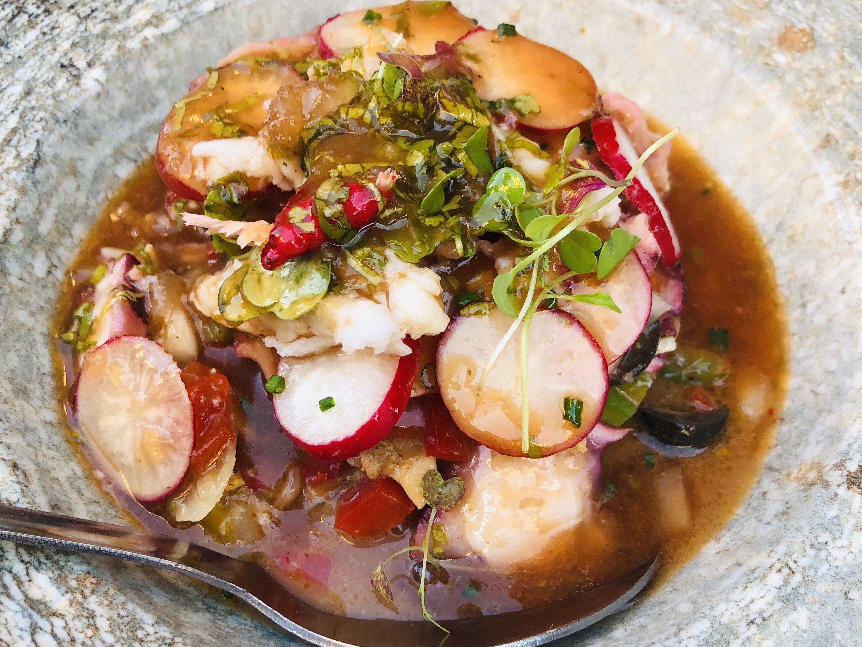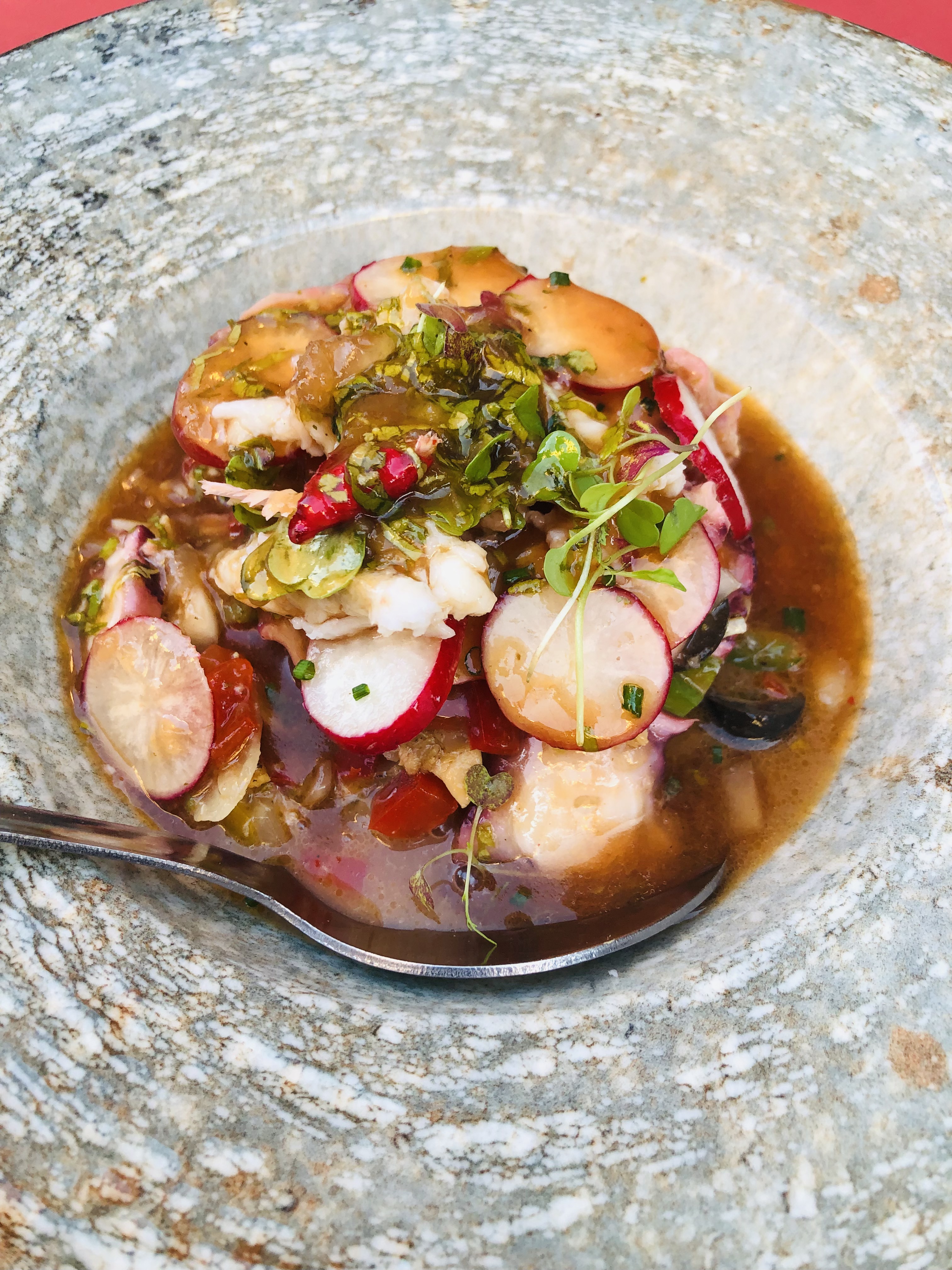 Rape en adobo de aceituna negra y pebrella, jugo de hervido y salsa cardinale de quisquilla.