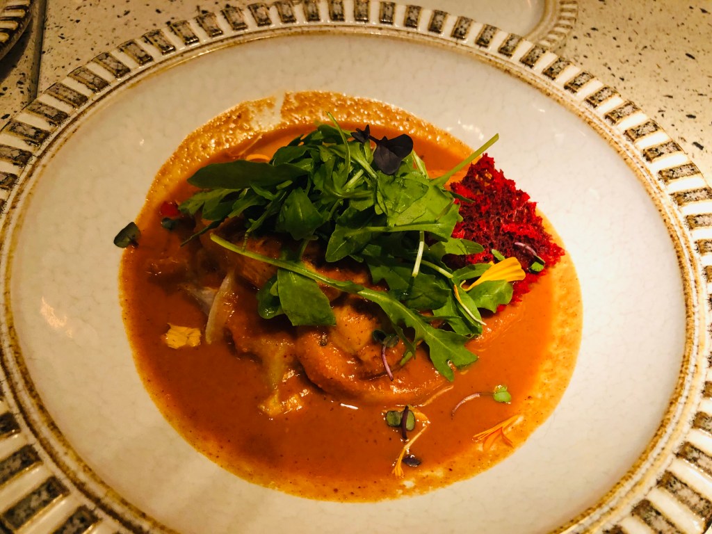 En un perfecto punto de cocción, sabroso y con una salsa perfecta el Mero con patata nueva, carbonara marinera y jugo de ñora