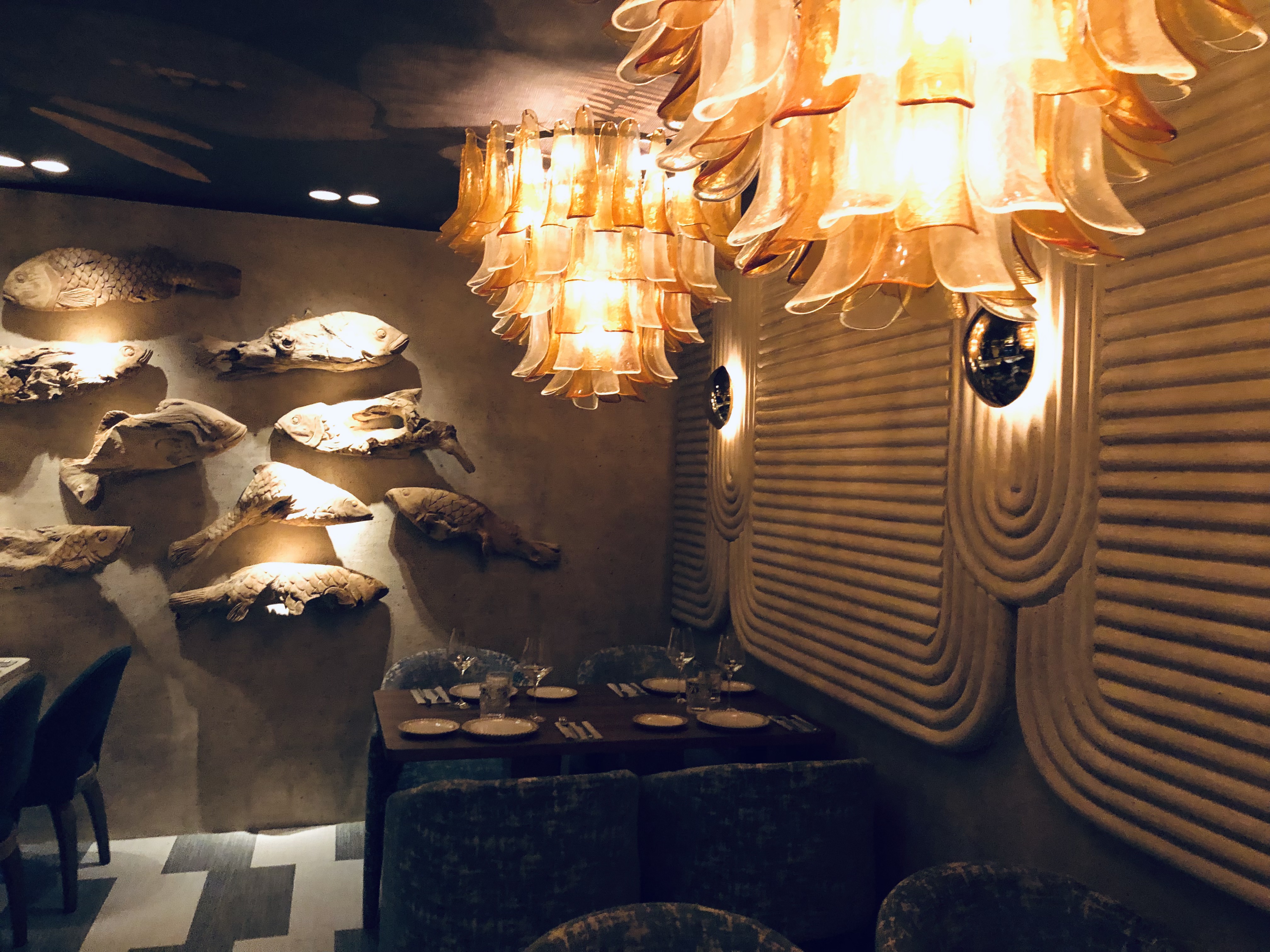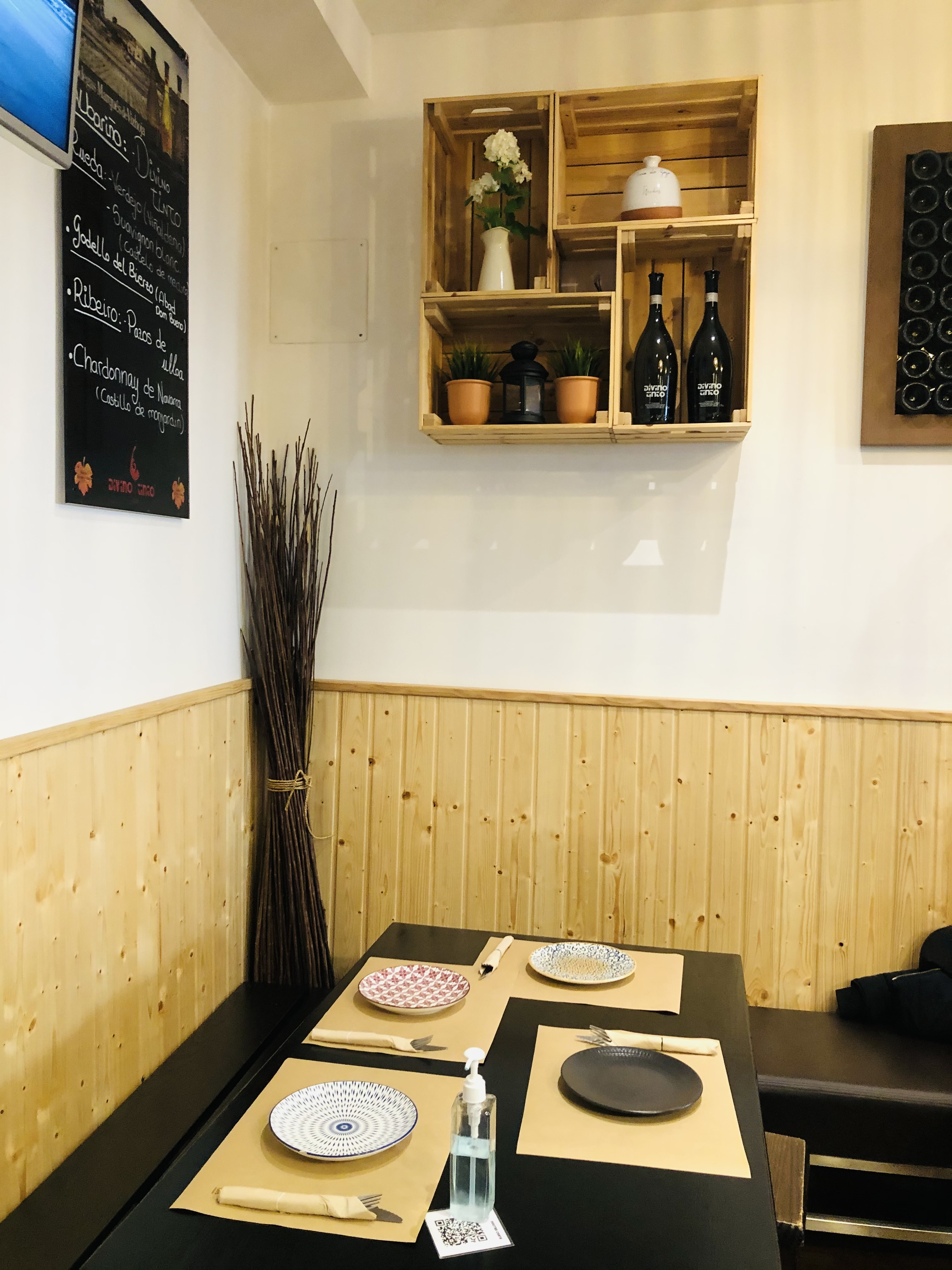 Con una decoración elegante y minimalista, conservan el precioso y colorido mural que tenían en el antiguo local en un reservado, y el detalle de servilletas imitando a los típicos paños de cocina portugueses o las bonitas bolsas para el pan.