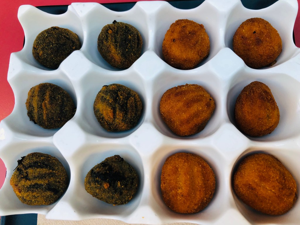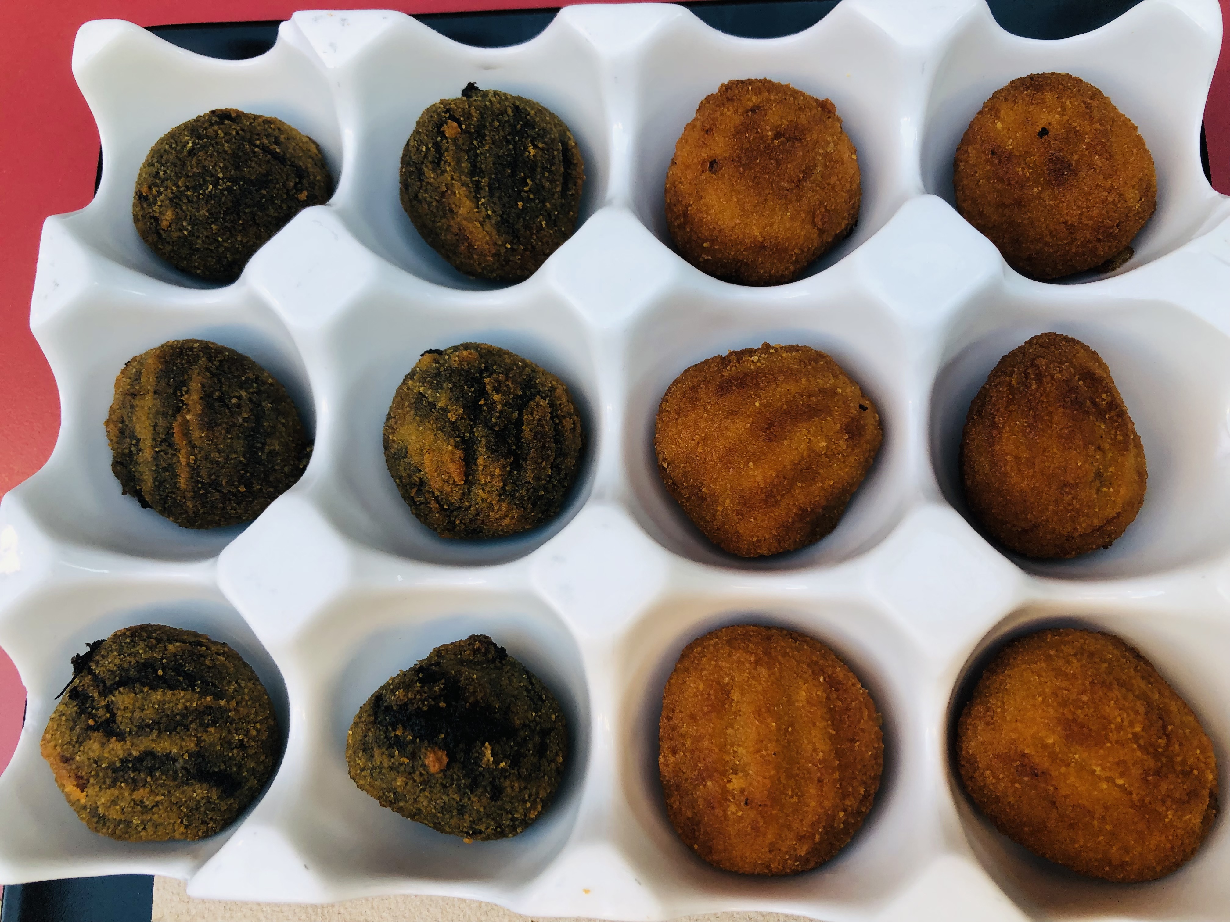 Su Croqueta de blanquet a la brasa, cebolleta y queso de cabra es perfecta, el blanquet es un embutido tradicional de la Comunidad Valenciana, es como una salchicha blanca o una especie de butifarra.