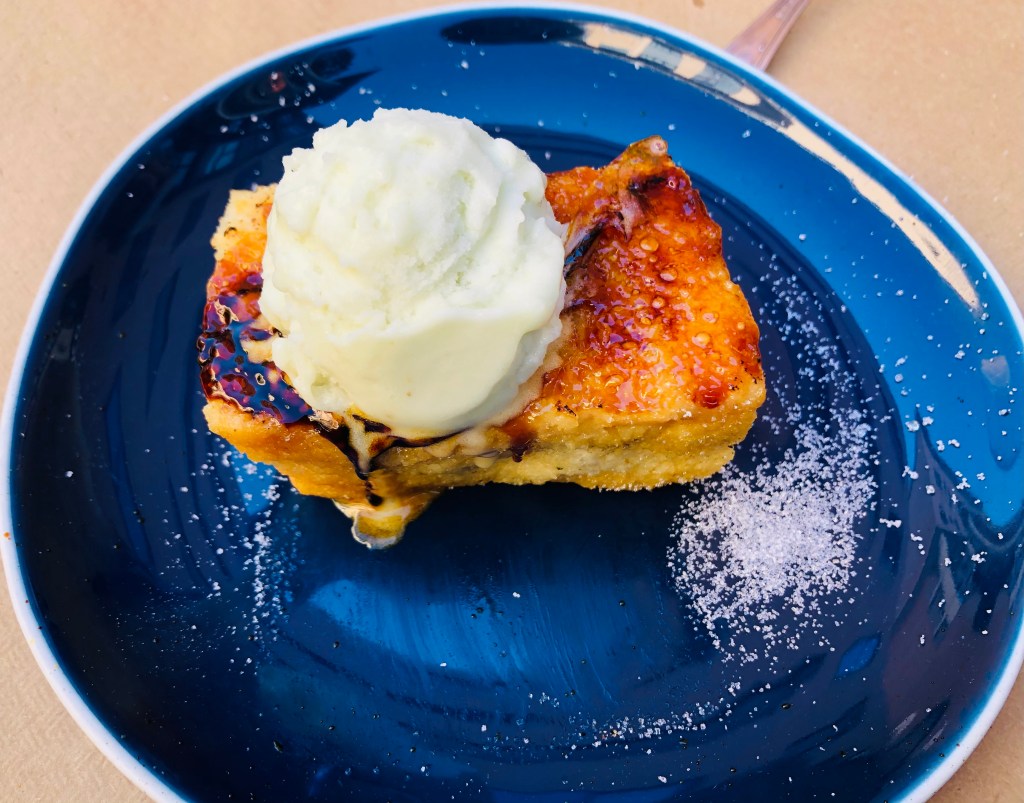 Pudin abade de priscos, acompañado con helado de maracujá, una receta de 1887 de un abad en la parroquia de Priscos en Braga
