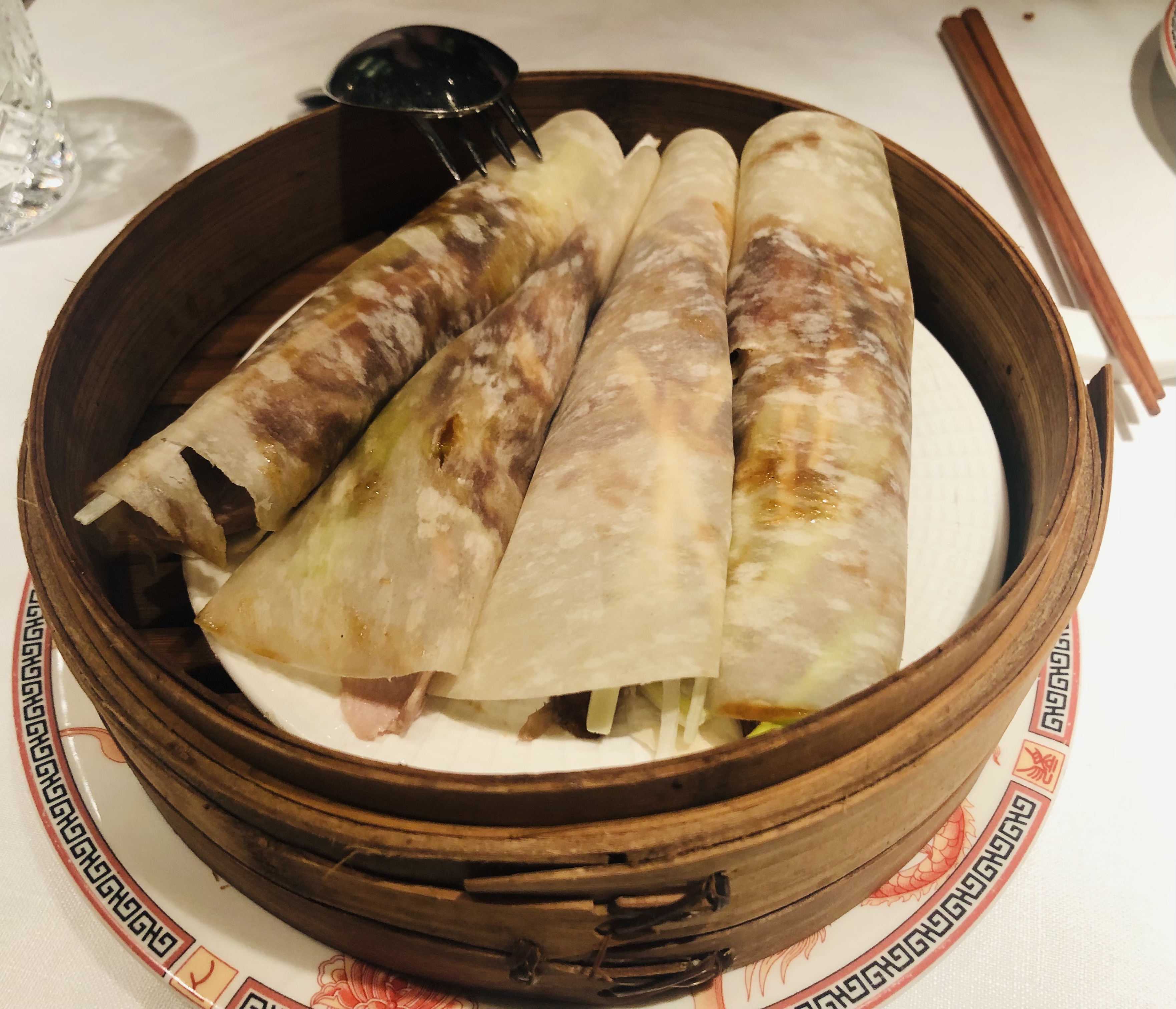 Y su plato estrella el Pato lacado estilo Pekín del que debo decir que está exquisito. Lo sirven enrollado en crepes con puerro y pepino que le dan un toque muy jugoso, aunque al parecer antes lo trinchaban delante del cliente y esto también se ha perdido. Lástima porque hasta en los restaurantes más modestos lo he presenciado y suele ser un espectáculo. No me gustó el detalle de que ya los sirviesen hechos, no me parece adecuado para este nivel de restauración.