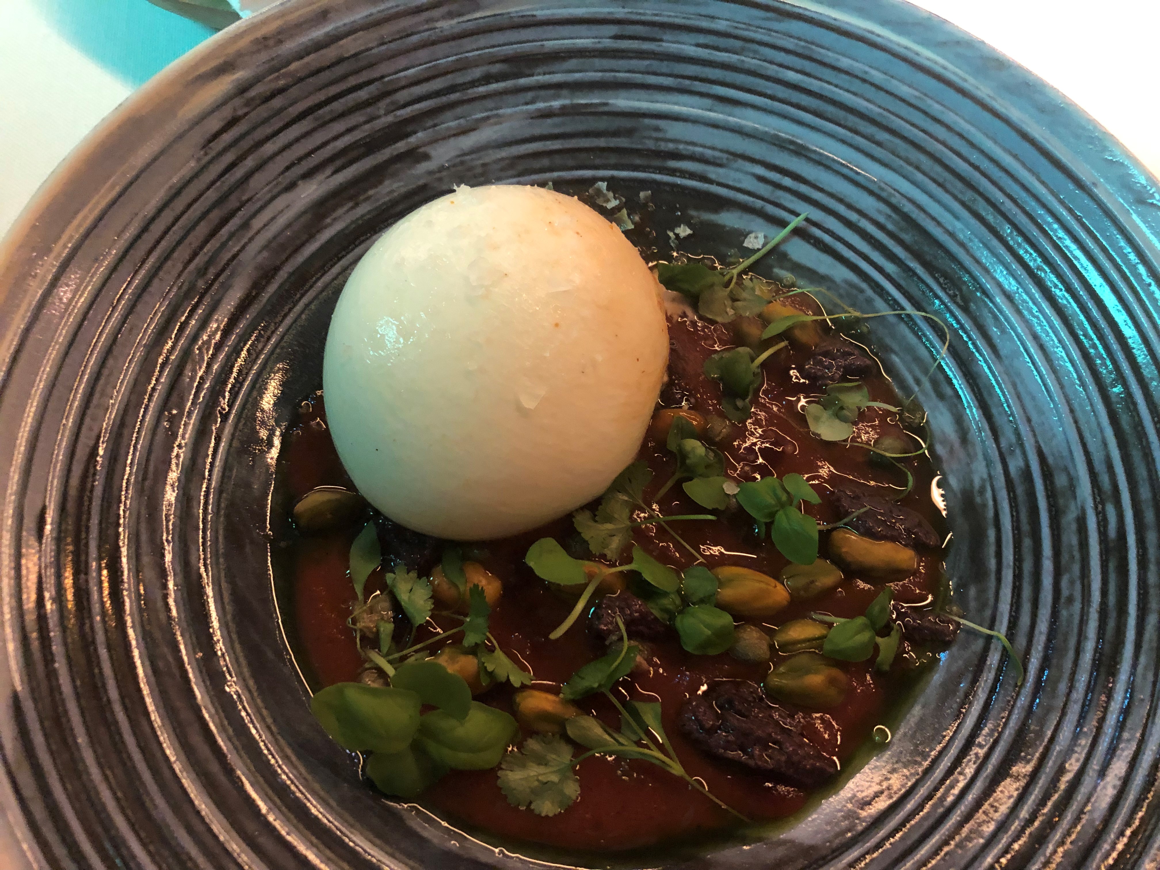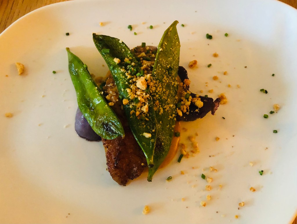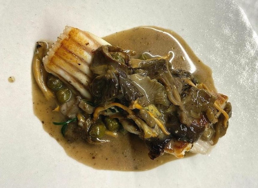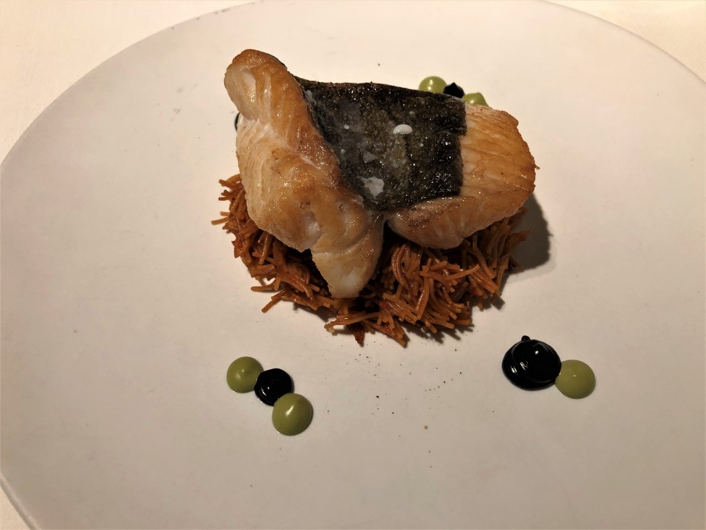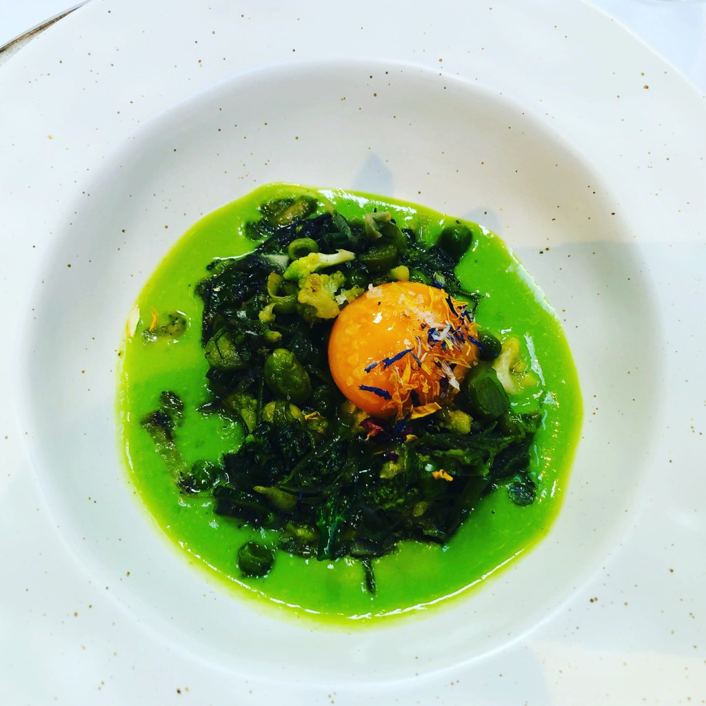 y que se revela en toda su dimensión en el siguiente plato que para mi fue uno de los platos estrellas del menú, el Panache de verdura y yema de huevo una variedad de verduras salteadas y que ligadas con el huevo en una base de caldo de guisantes tirabeques y berros hacen la delicia de cualquier paladar.
