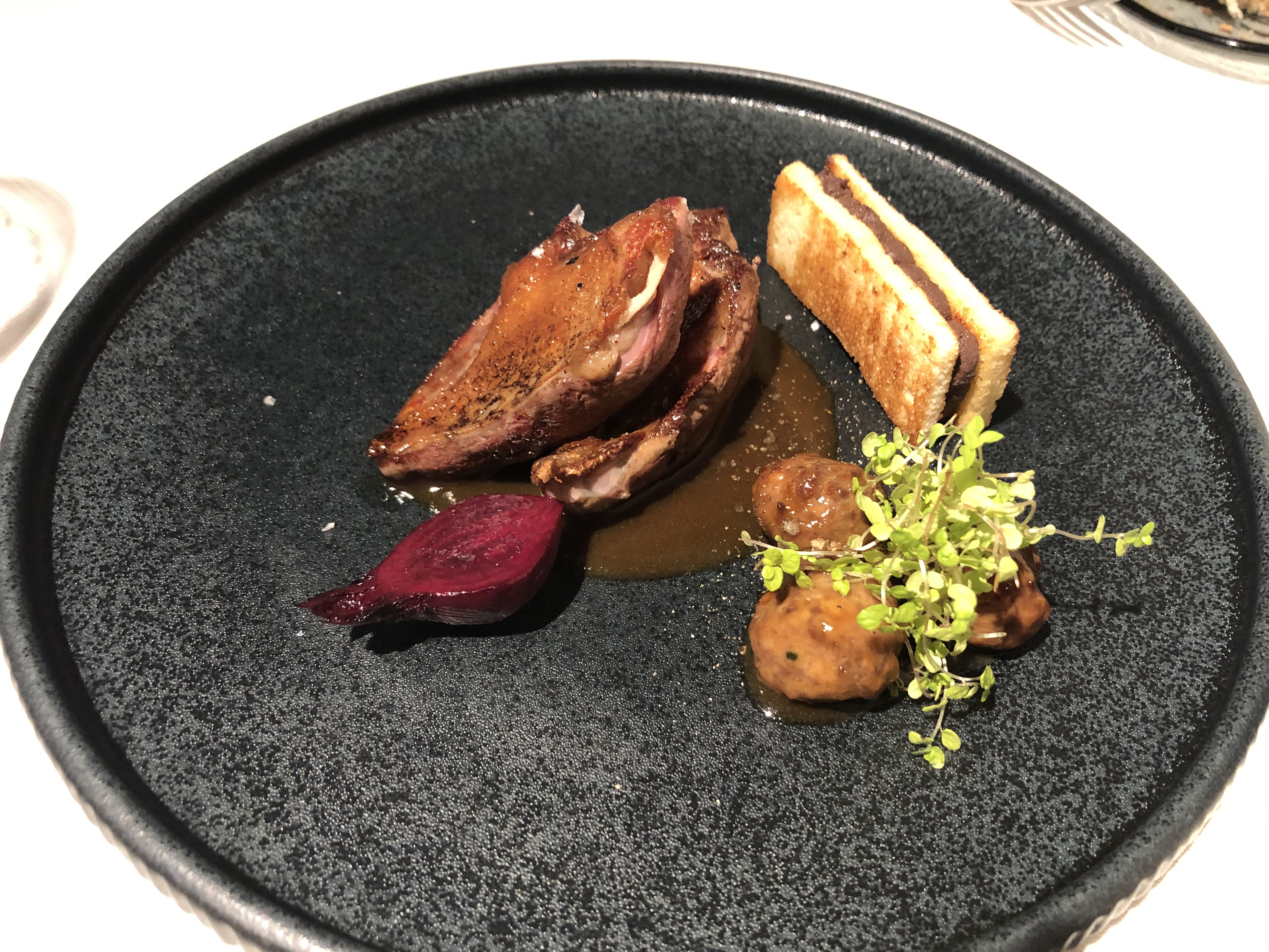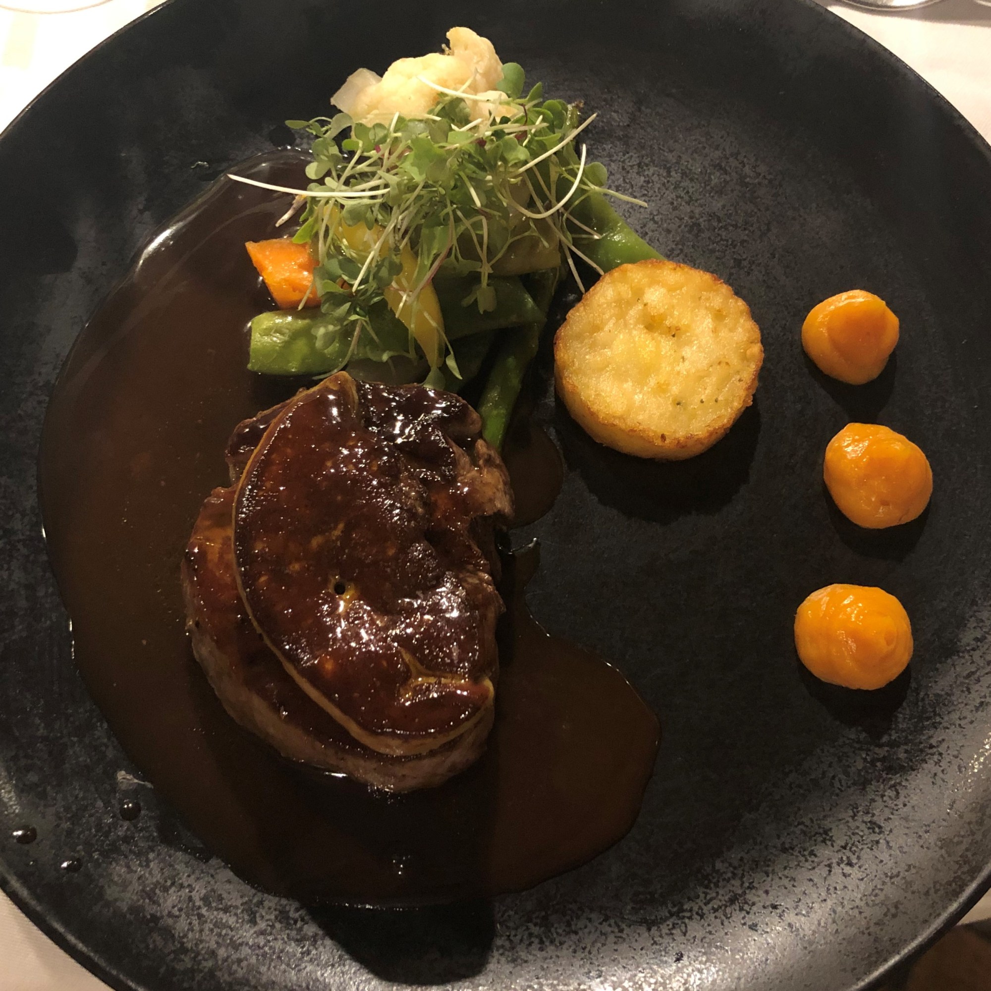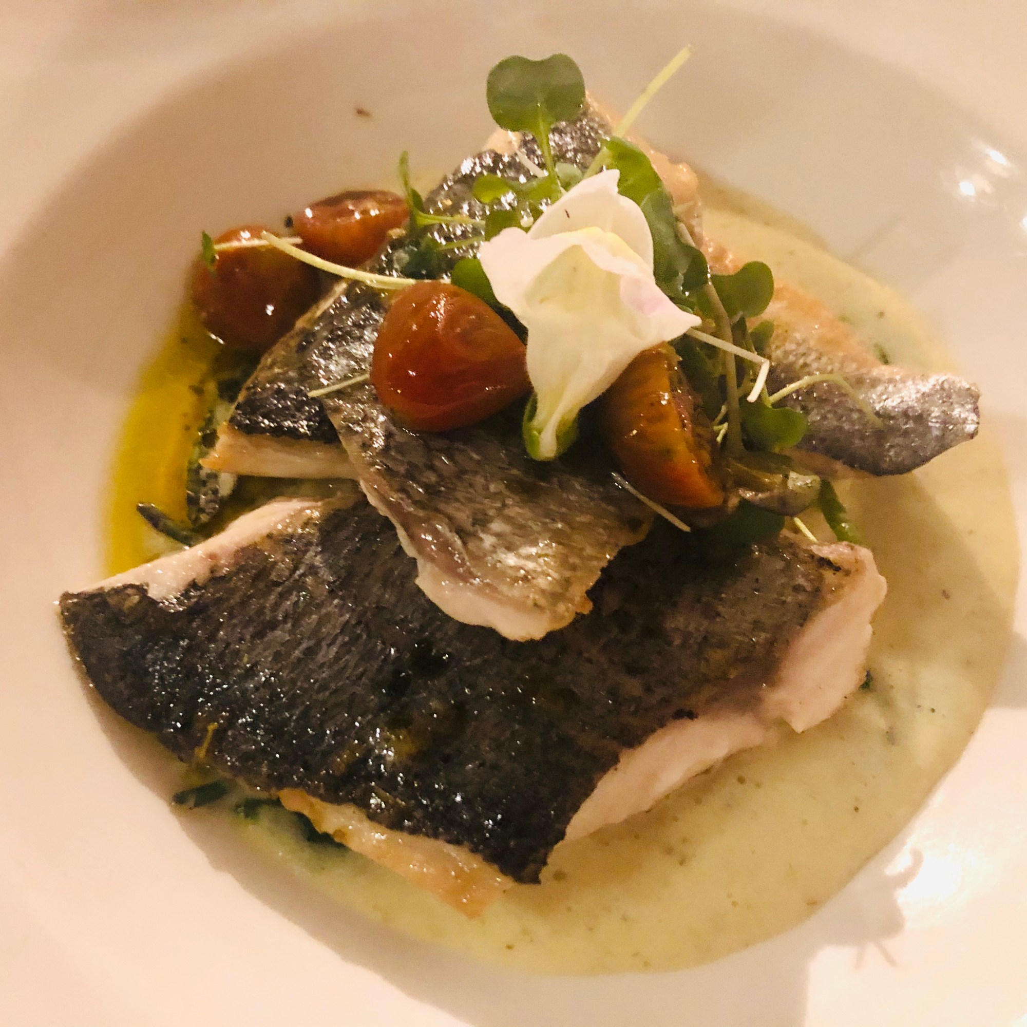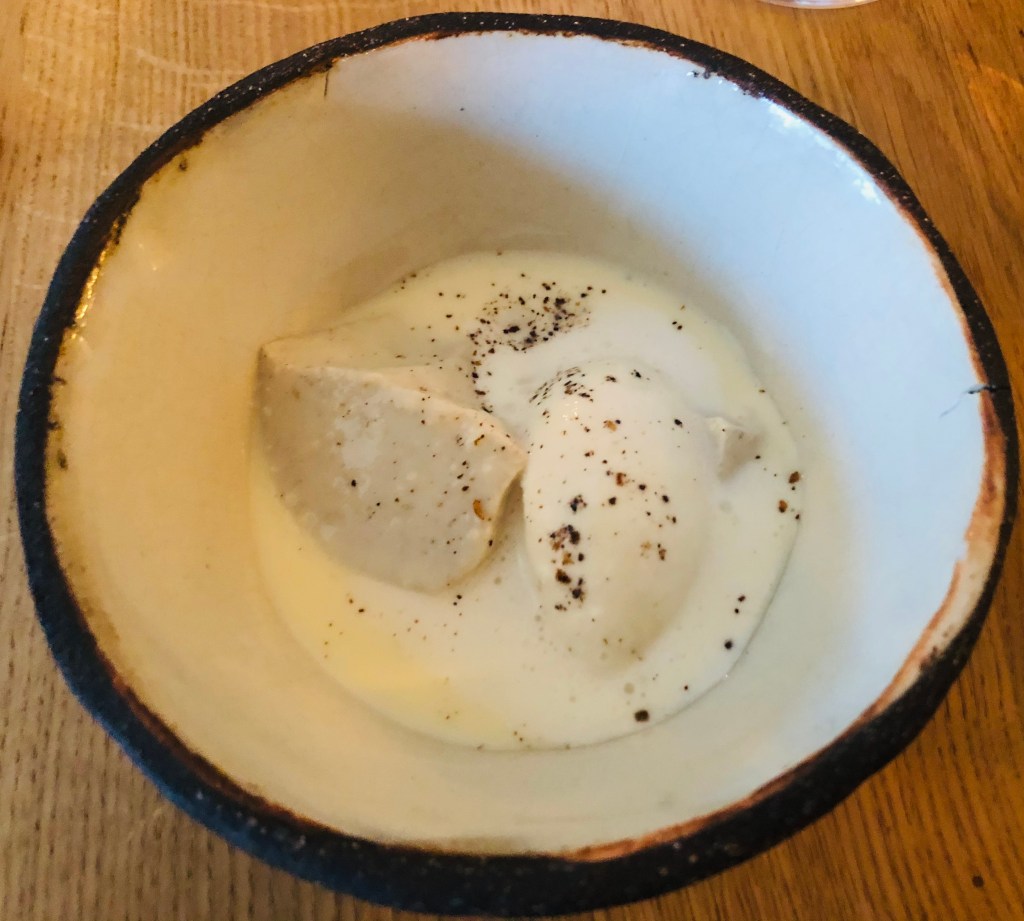 y que se revela en toda su dimensión en el siguiente plato que para mi fue uno de los platos estrellas del menú, el Panache de verdura y yema de huevo una variedad de verduras salteadas y que ligadas con el huevo en una base de caldo de guisantes tirabeques y berros hacen la delicia de cualquier paladar.