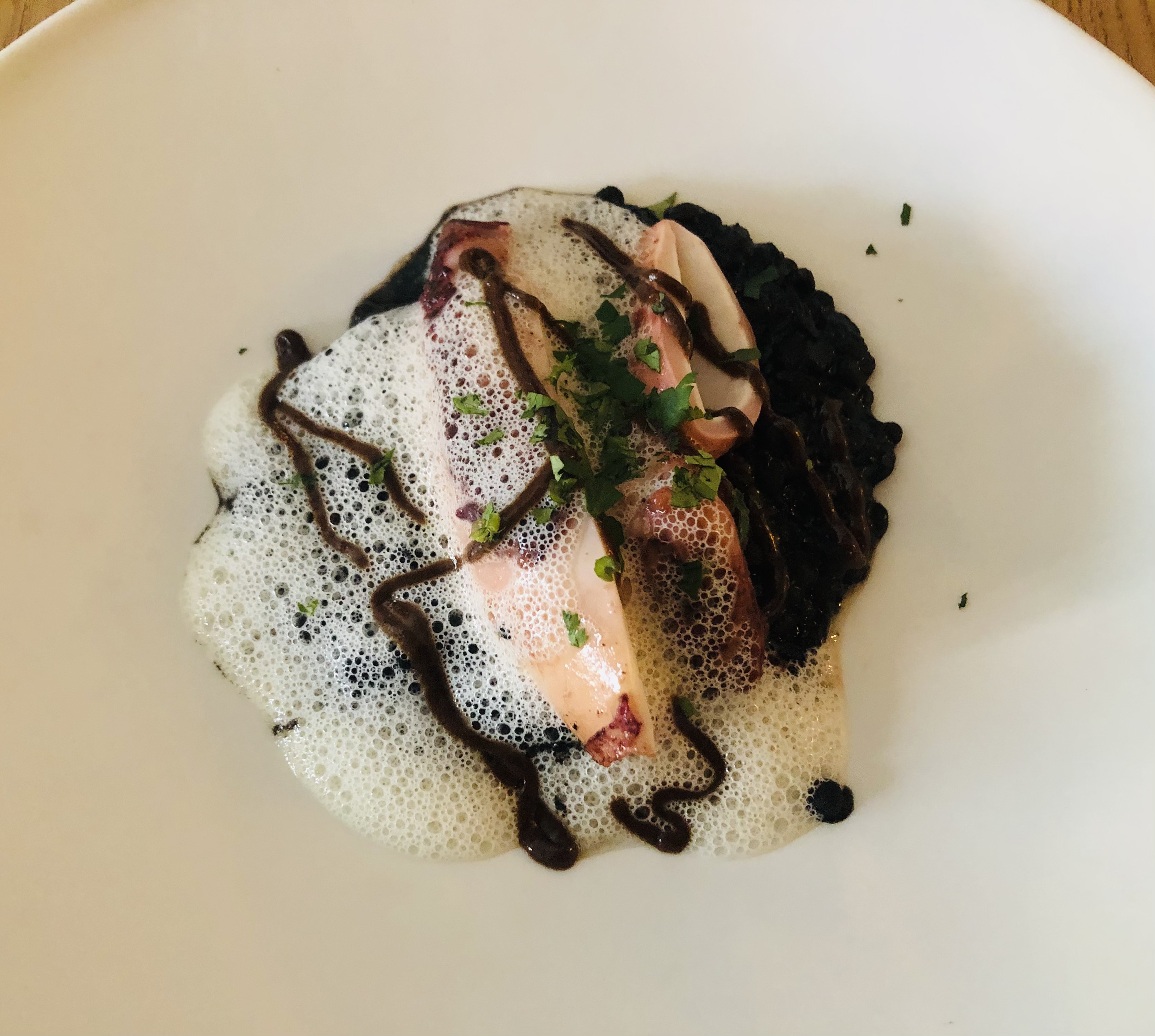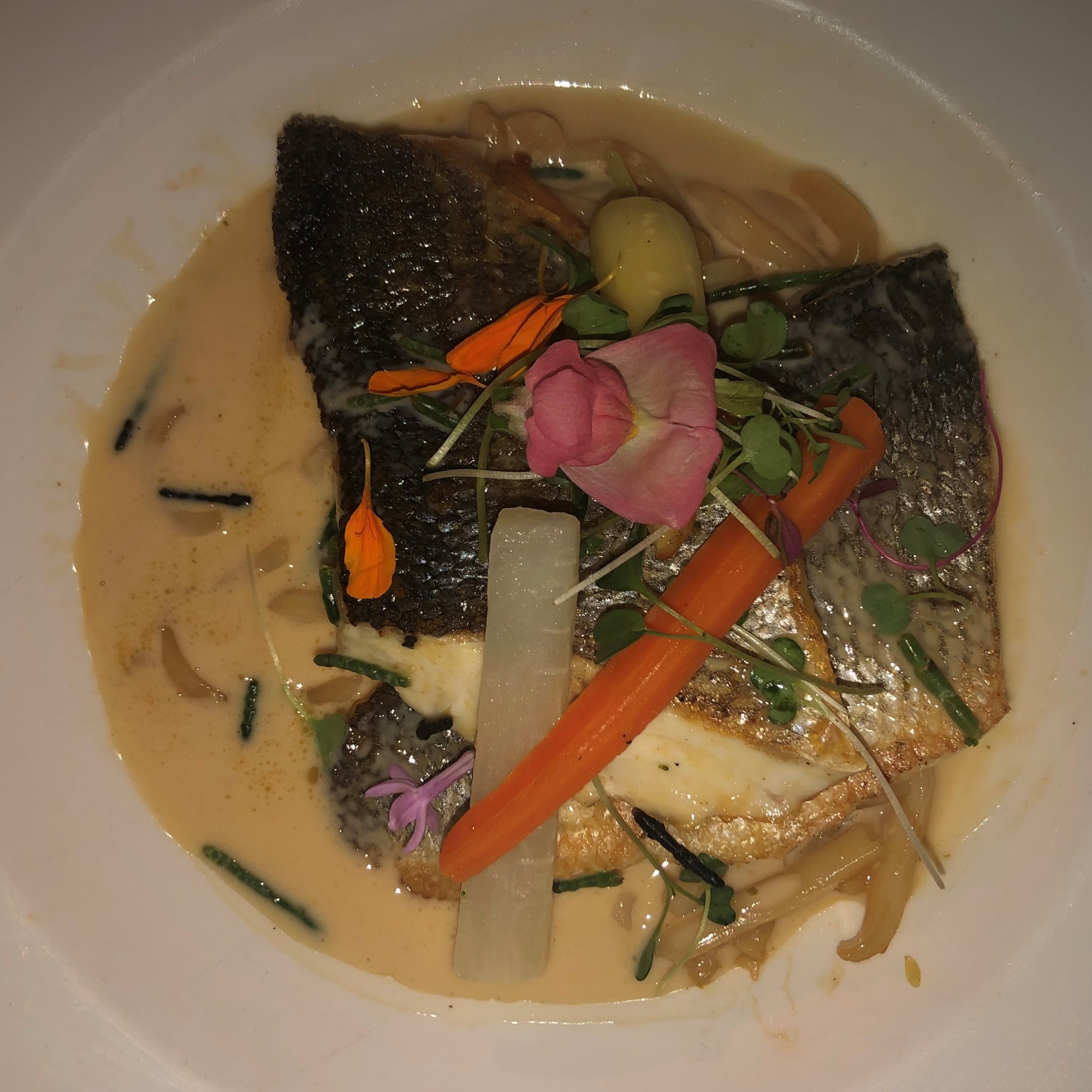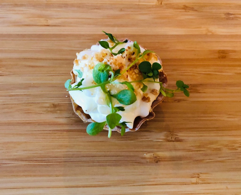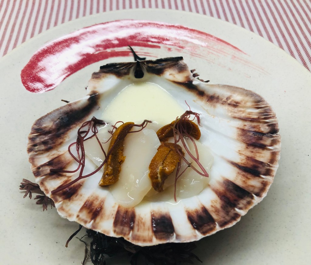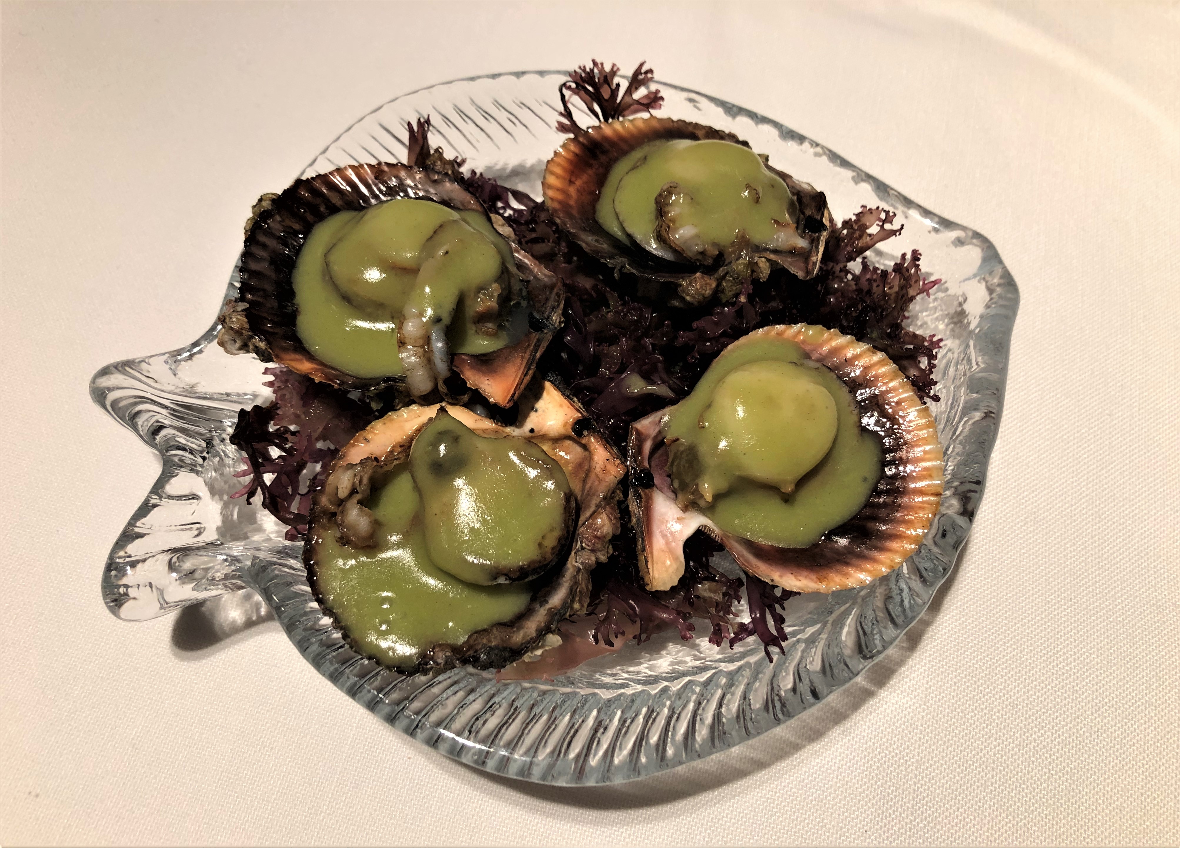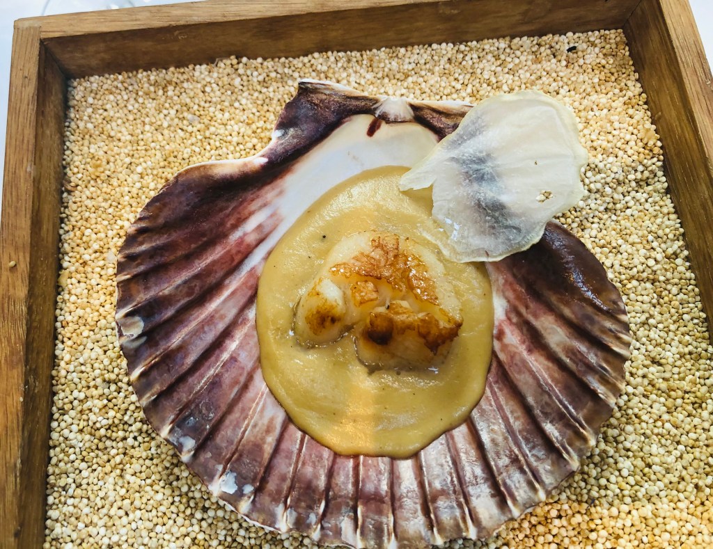 Le sigue una Vieira gratinada con crema de tupinambo, un tubérculo parecido a la raíz del jengibre con un sabor similar a la alcachofa, conocido también como alcachofa de Jerusalén y la rematan con un semitransparente chip de apionabo.