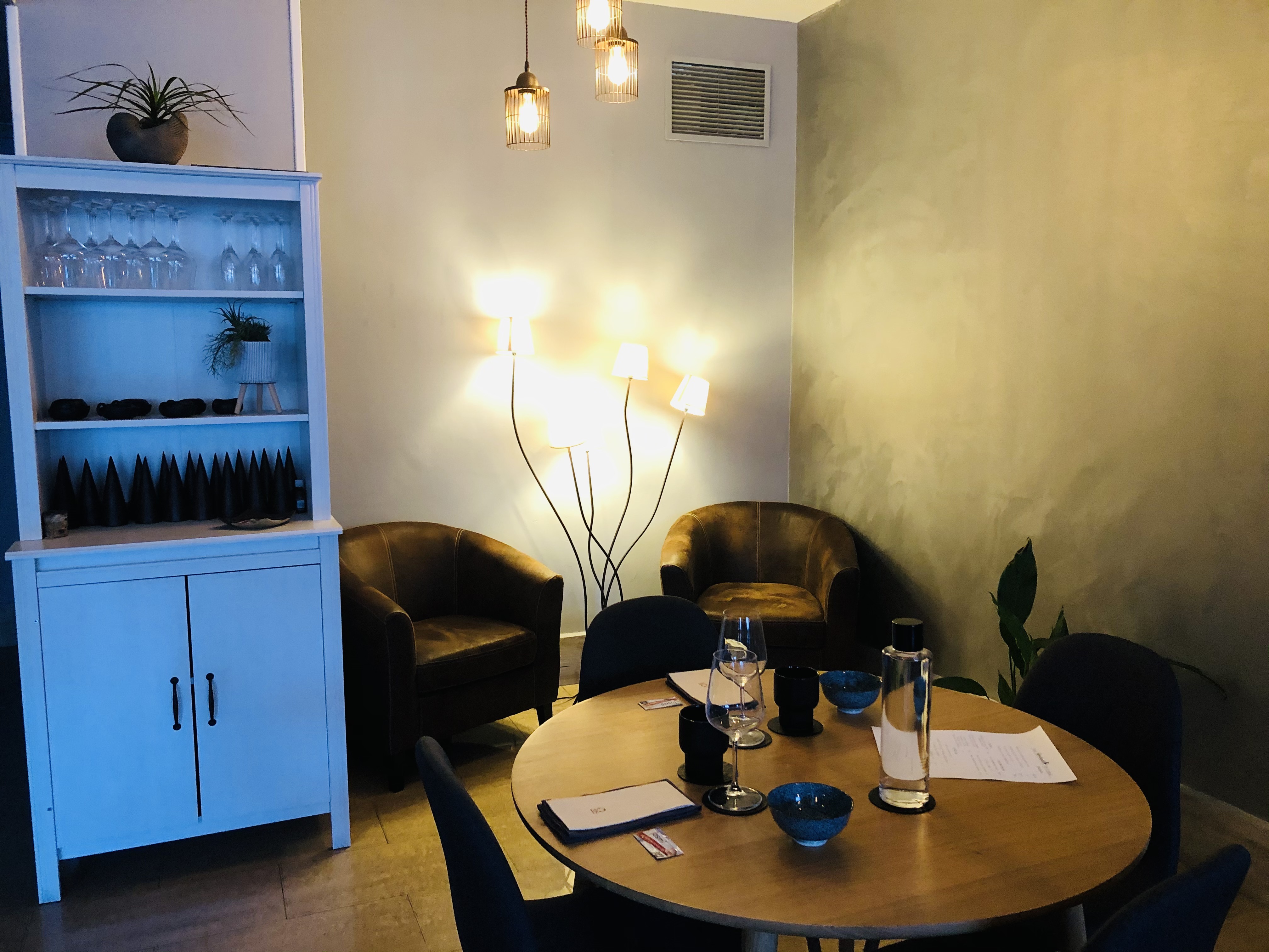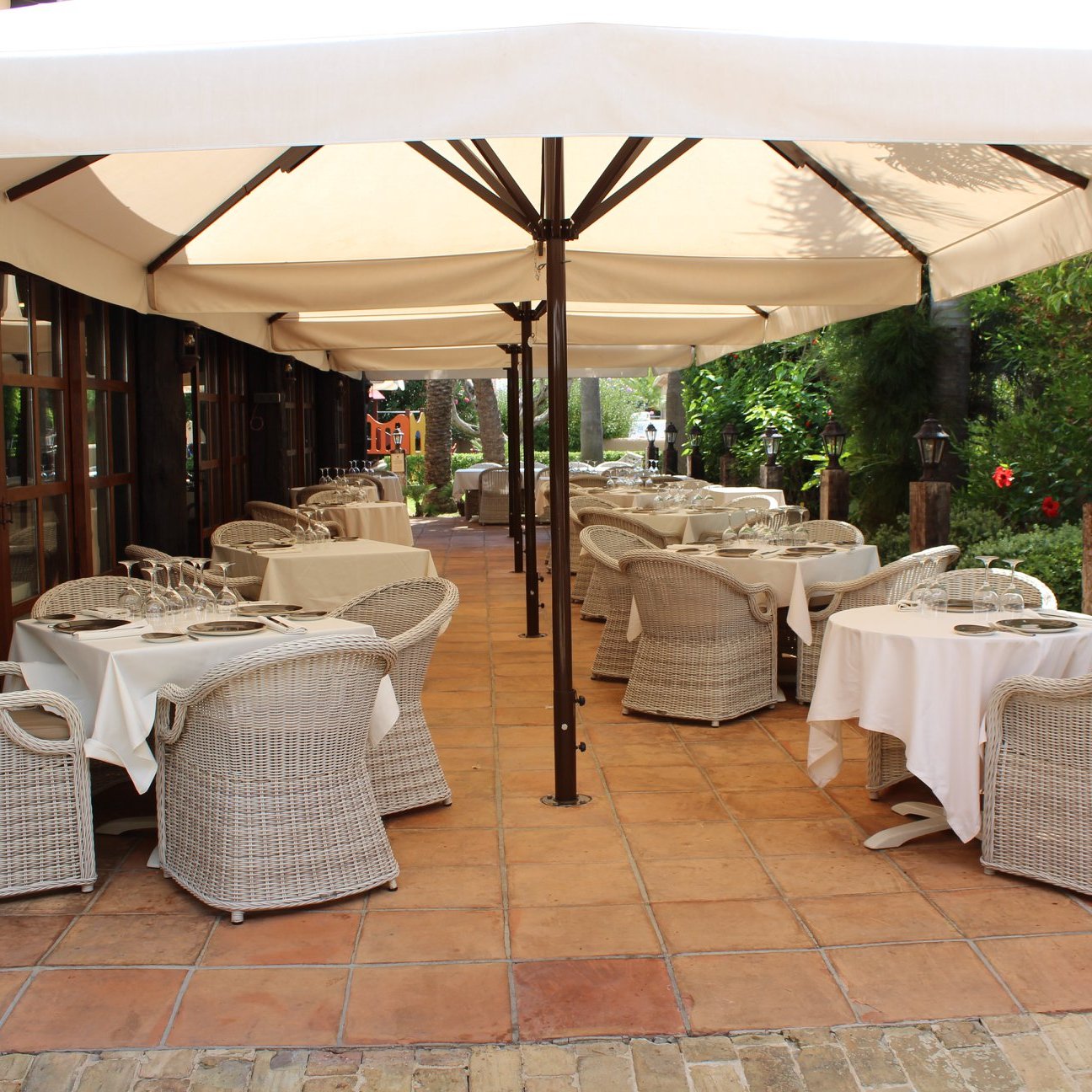 Me encantan esas mesas redondas que invitan tanto a la sobremesa, amplias, separadas entre sí y vestidas con manteles blancos de hilo. Los detalles de los bajoplatos y el platillo para el pan, en desuso últimamente y que yo agradezco tanto, dan un aire clásico y elegante al conjunto.
