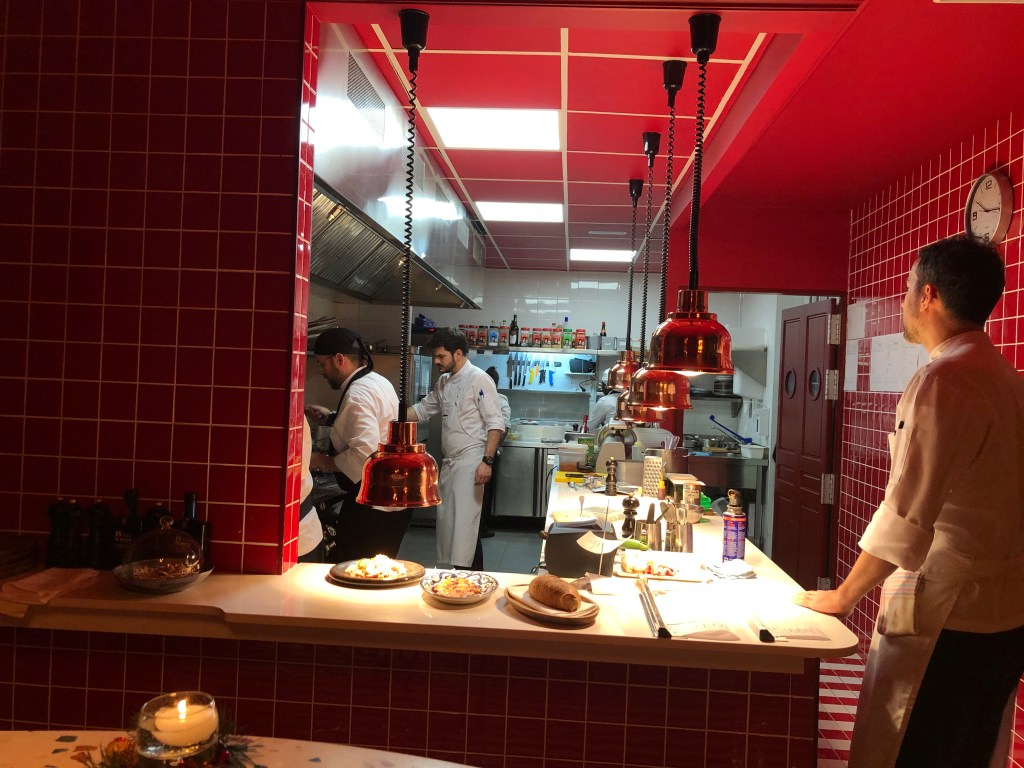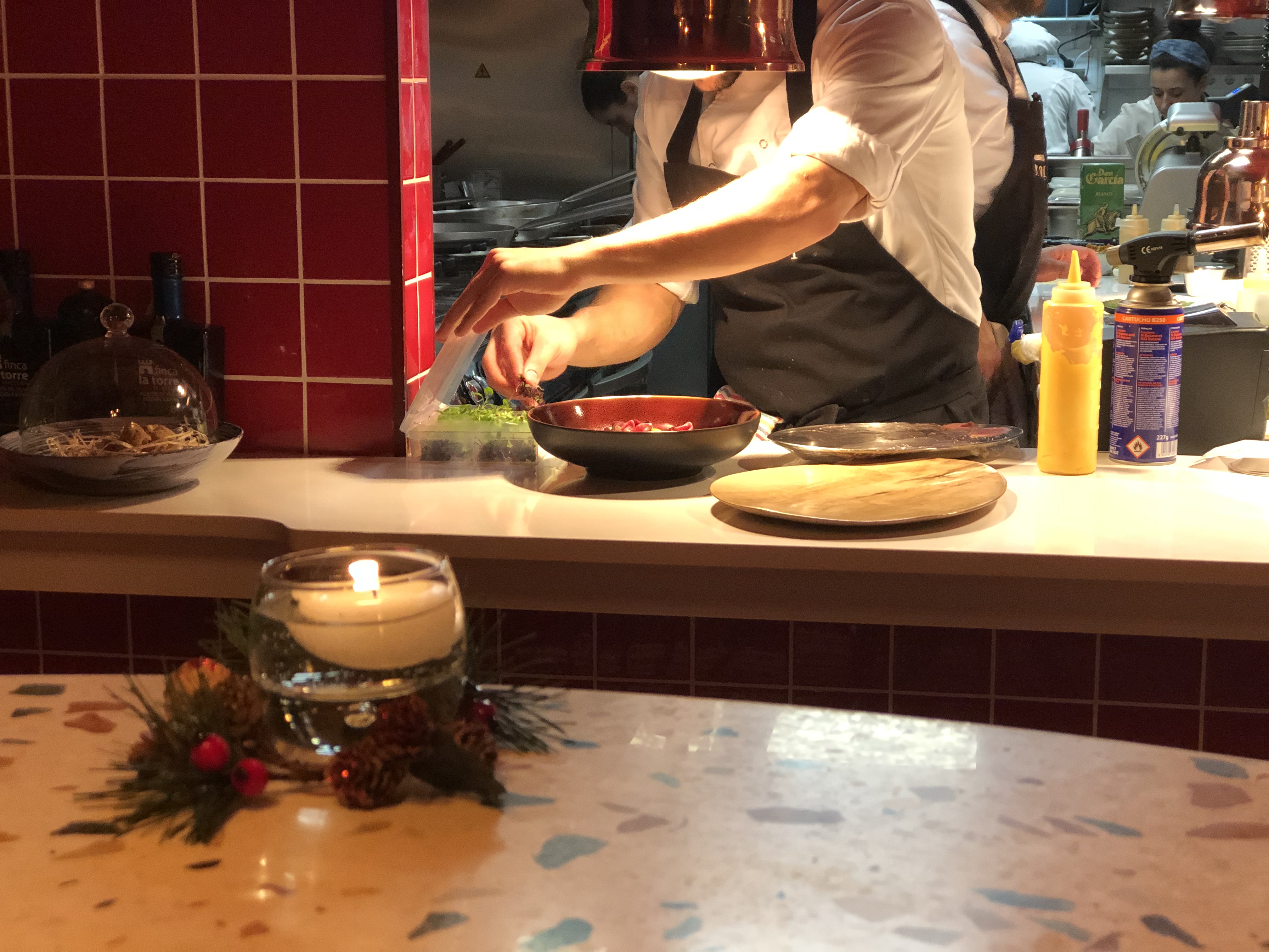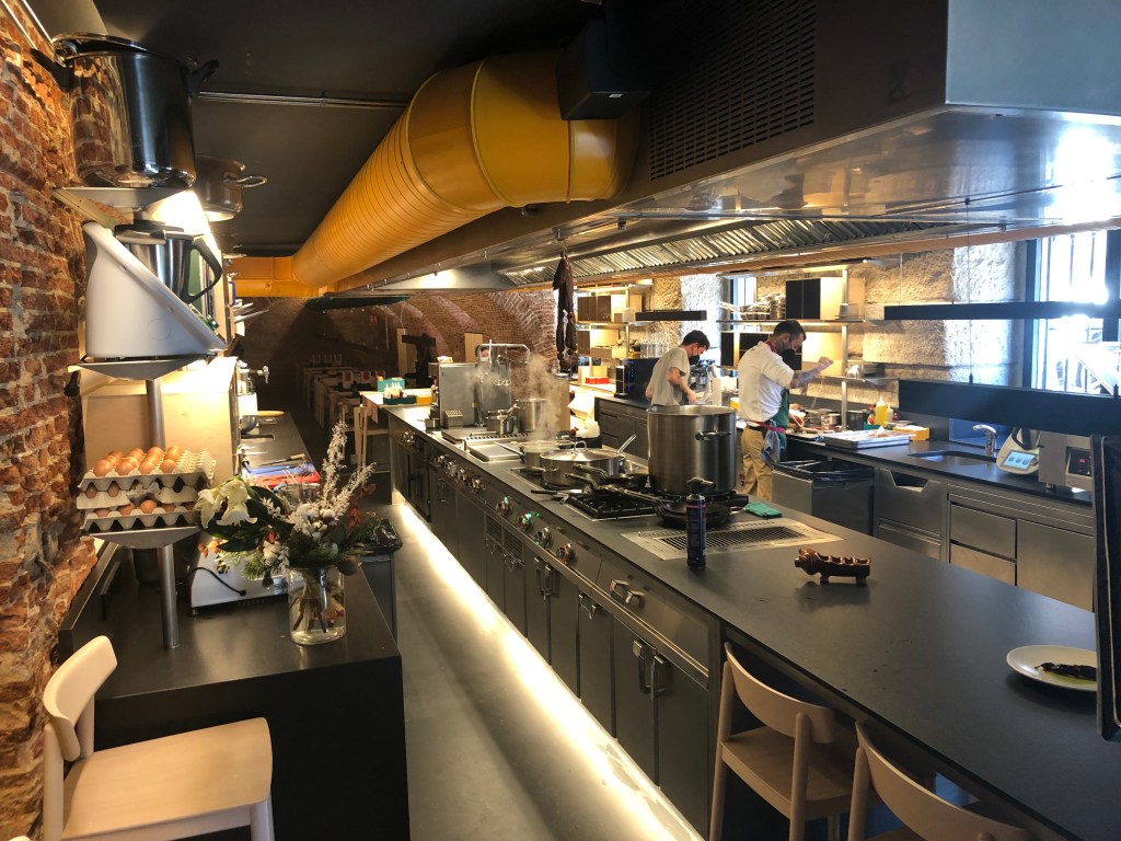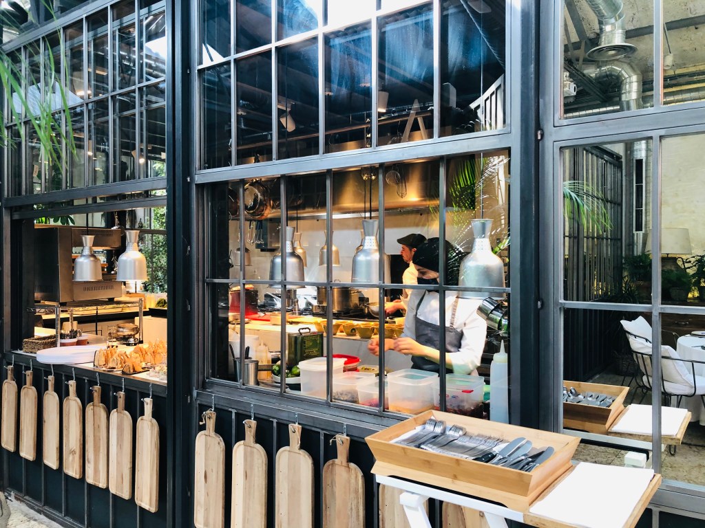 En uno de estos acristalados se ubica la cocina vista, que permite ver con Javier Muñoz- Calero Calderón al frente, el ajetreo del personal elaborando los ricos platos que luego van a la mesa.