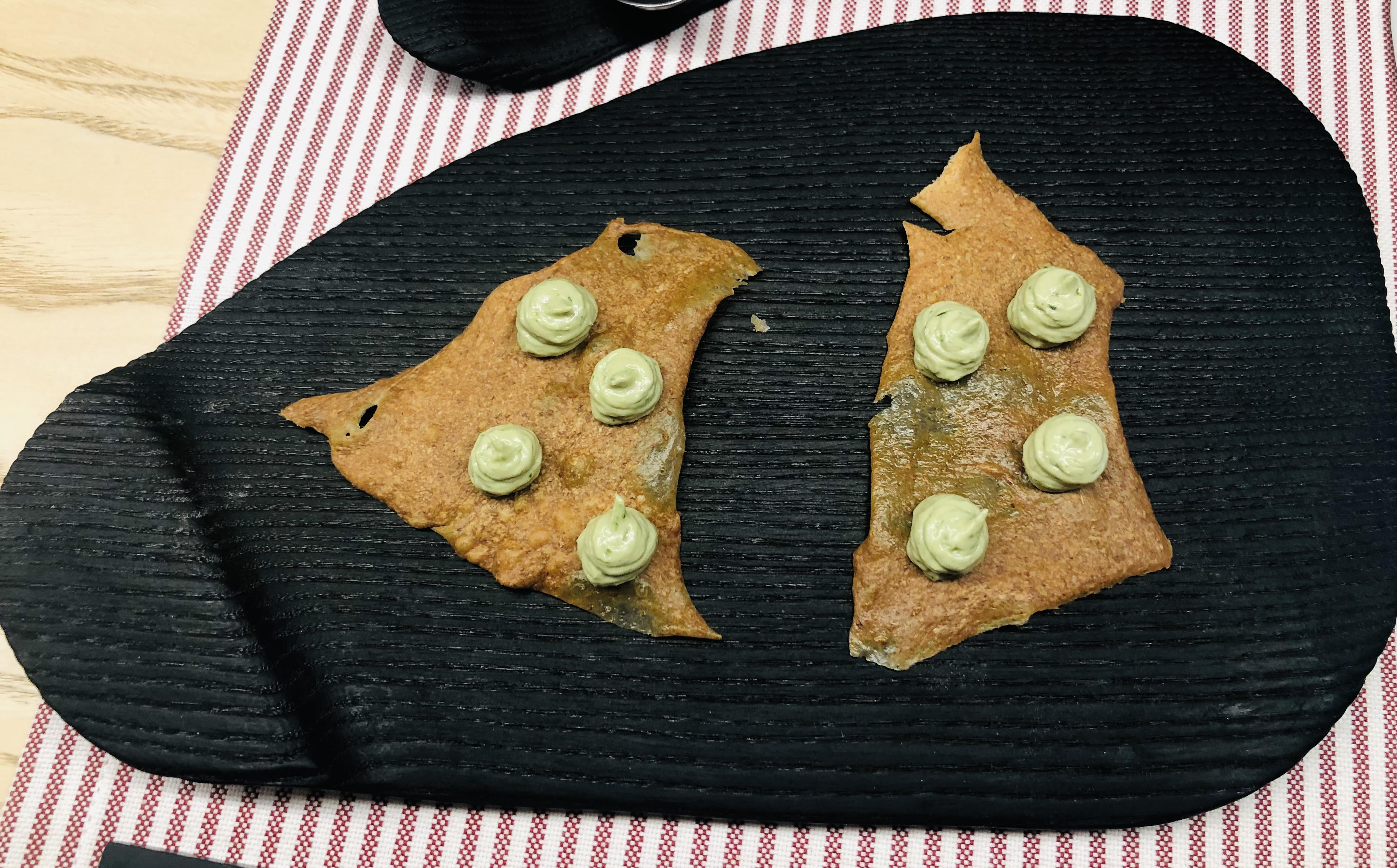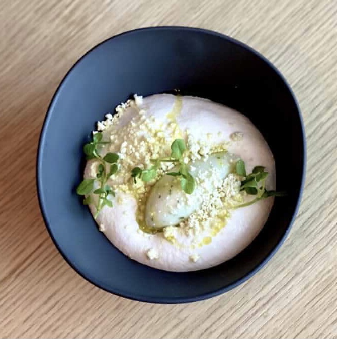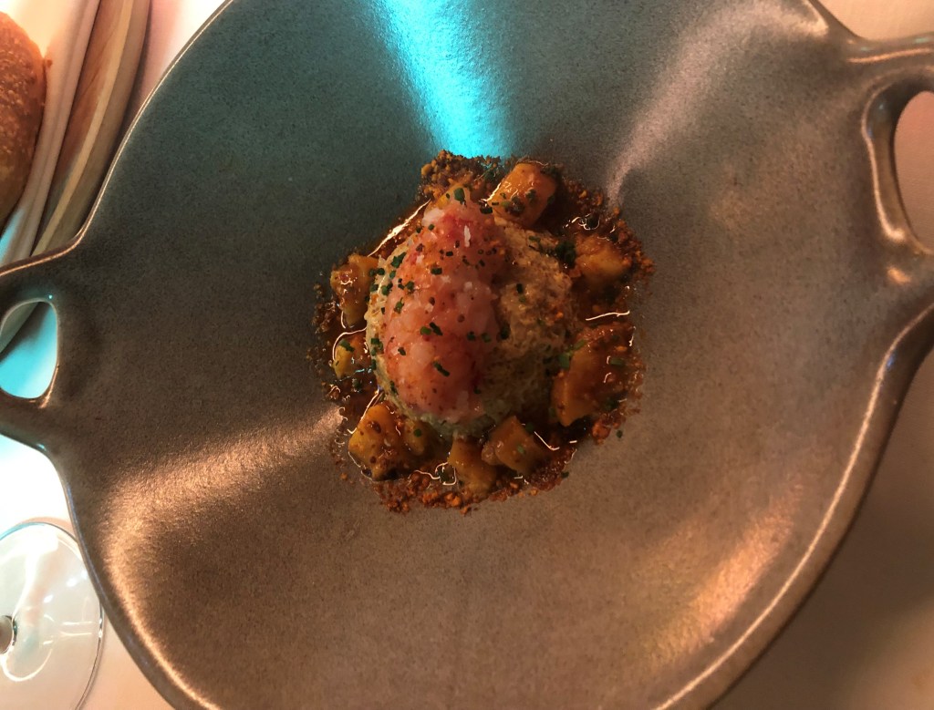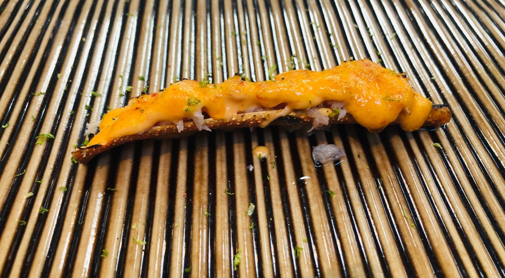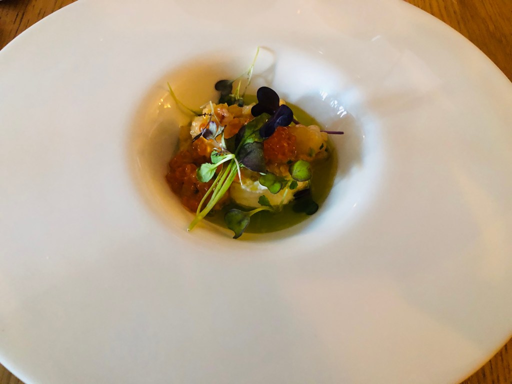 El primer bocado del menú es Cangrejo real con mayonesa de cayena y lima, cocinado a baja temperatura y flambeado con un toque picante delicioso.