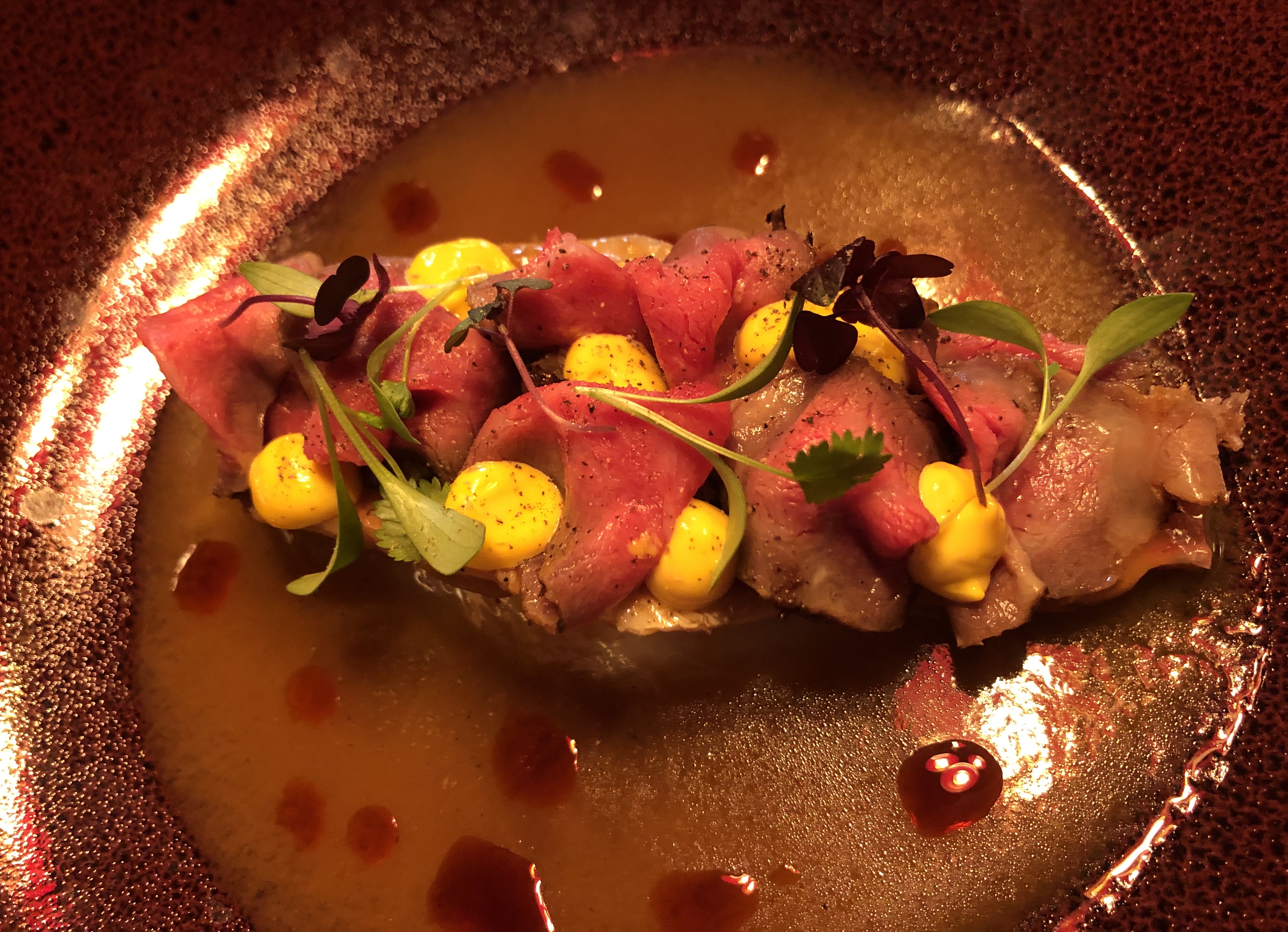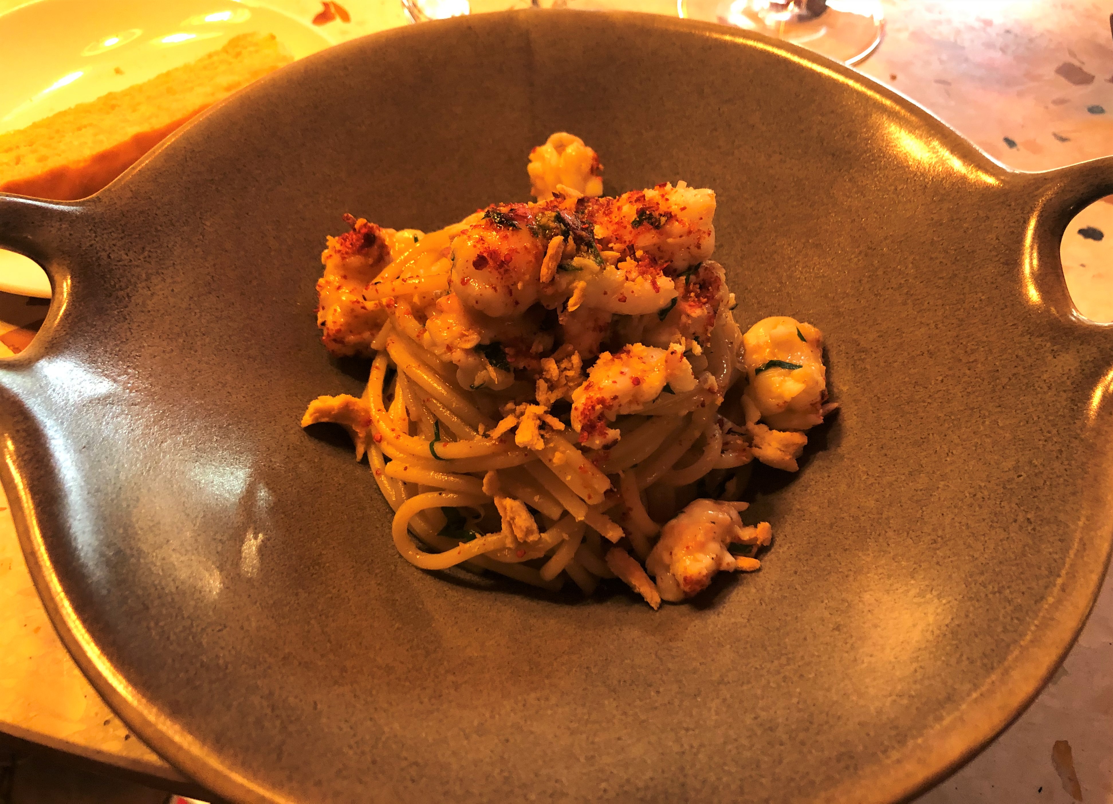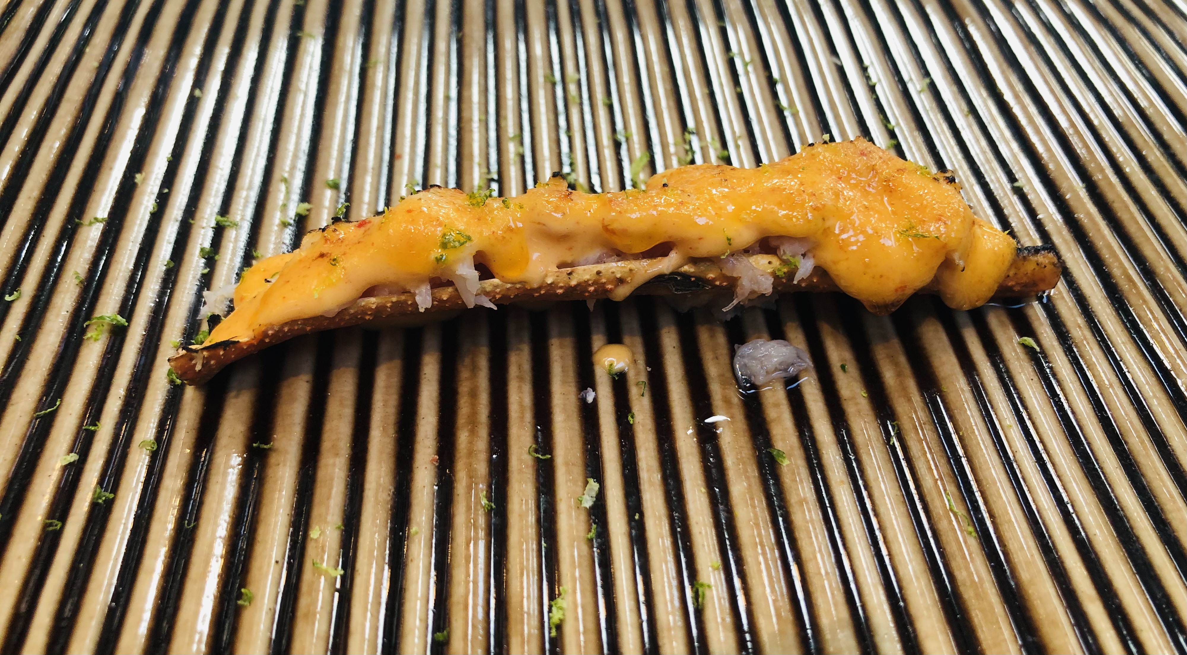 El primer bocado del menú es Cangrejo real con mayonesa de cayena y lima, cocinado a baja temperatura y flambeado con un toque picante delicioso.