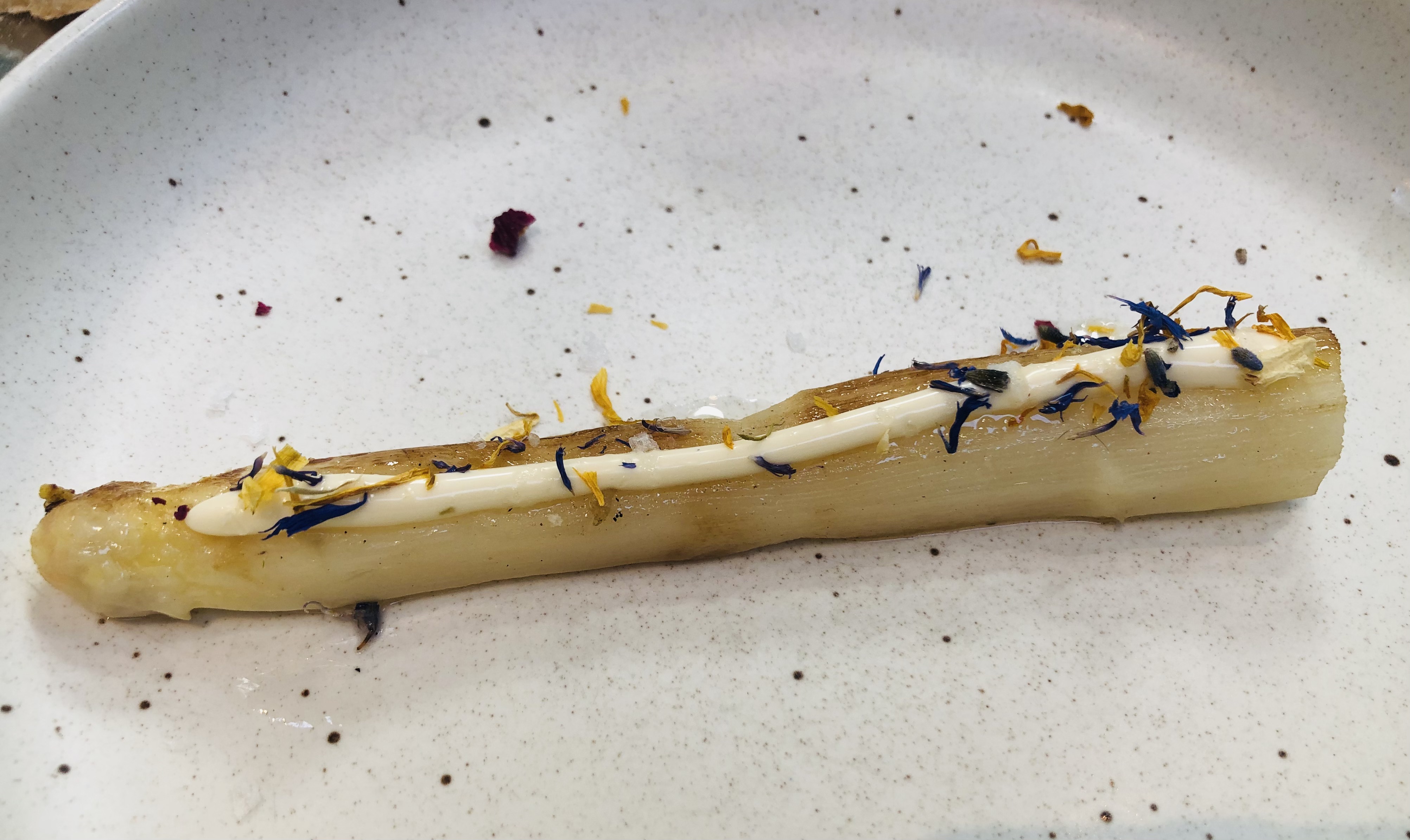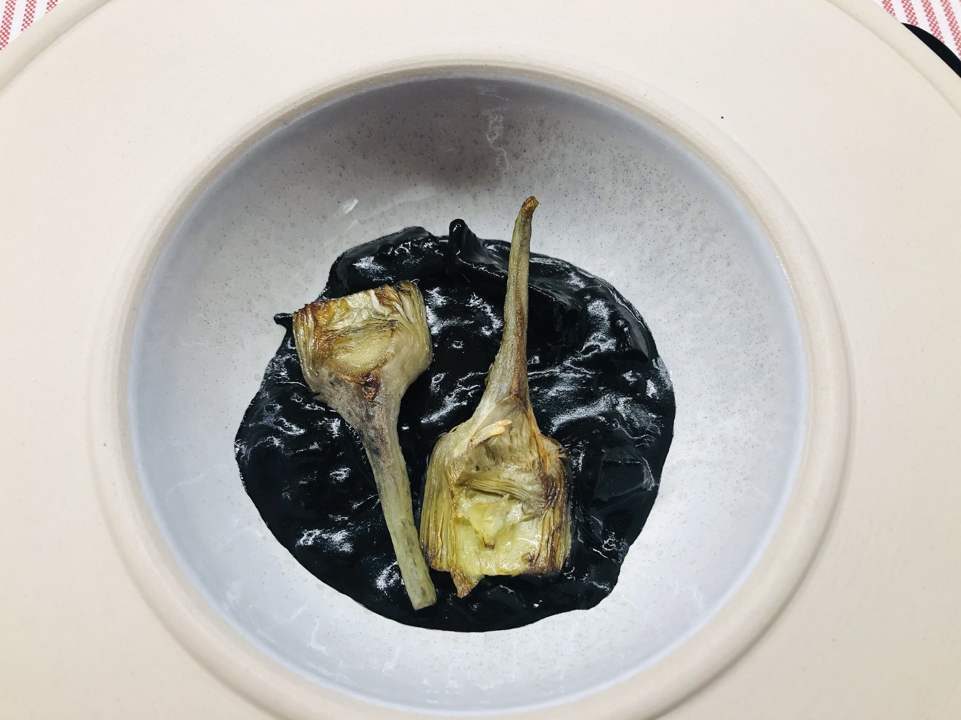 Una Alcachofa al carbón y un Esparrago blanco tibio y mayolina dan un ejemplo del punto maravilloso que dan a la verdura