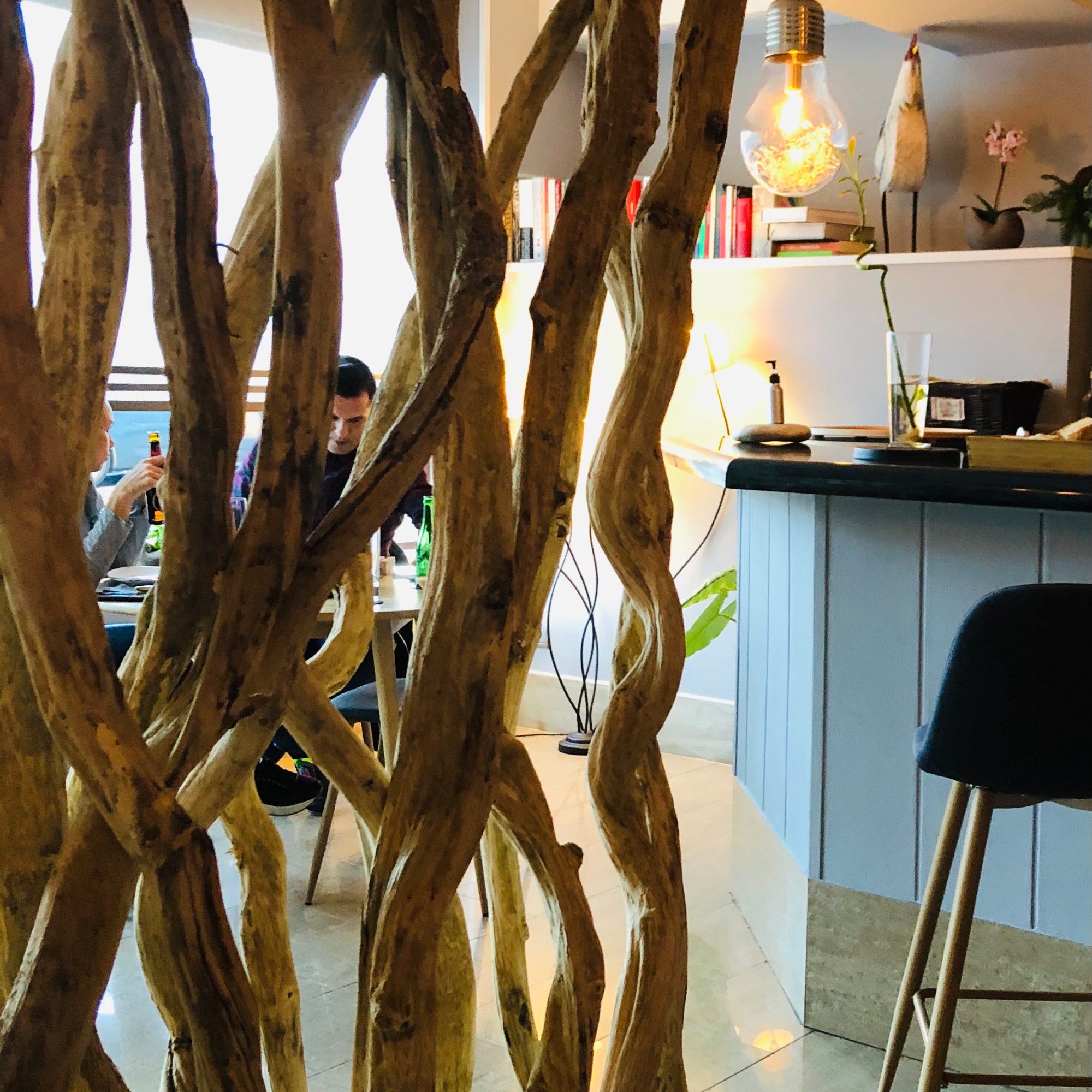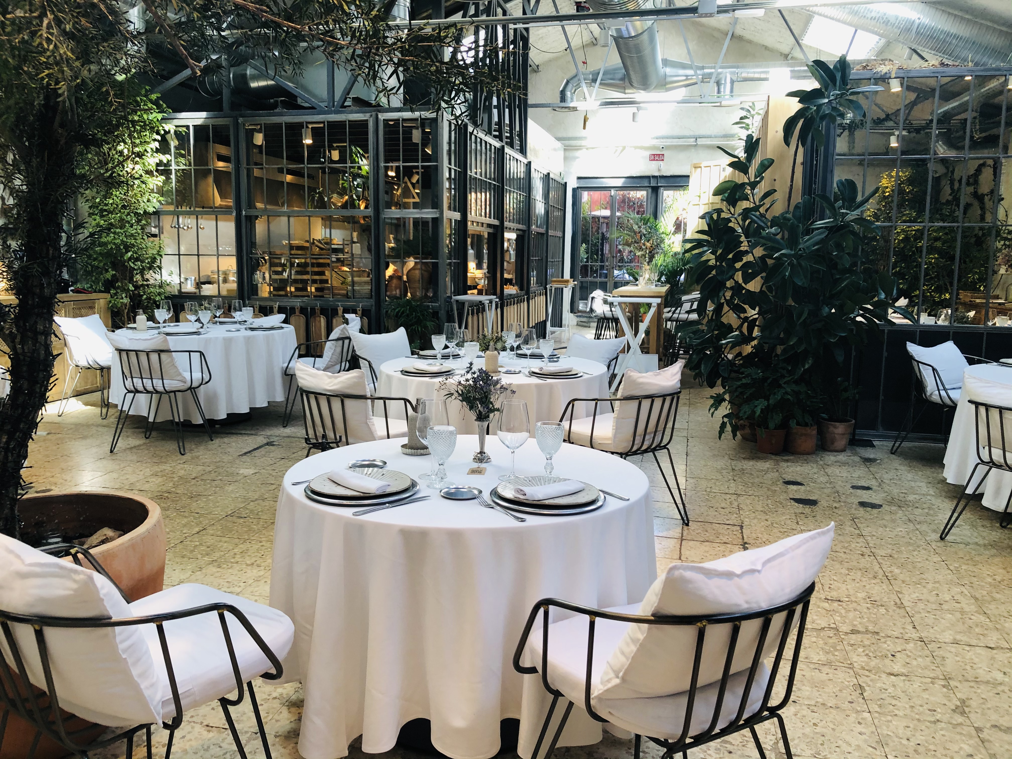 Completa la decoración la enorme cantidad de plantas que se reparten por la sala, grandes maceteros que separan mesas y espacios, enmarcan rincones y que junto con los reservados acristalados le dan un aire de invernadero antiguo.
