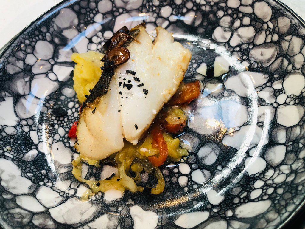 Entrando en los platos fuertes, el sencillo nombre del plato Bacalao ajo guindilla y perejil comprende un plato de siempre en su punto con su camita de verduras.