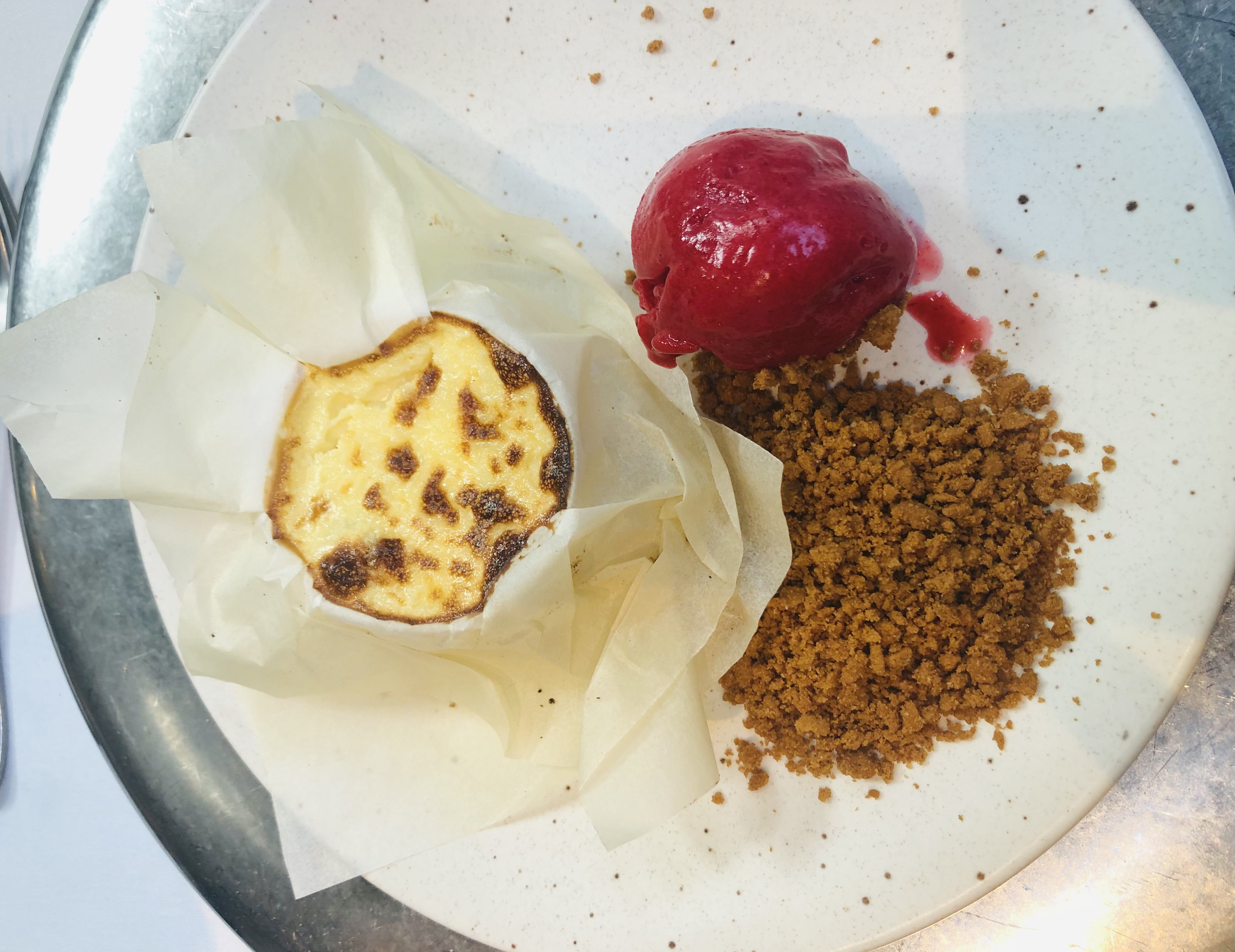 Como broche final la Tarta de tetilla con migas de palulú y helado de frambuesa,