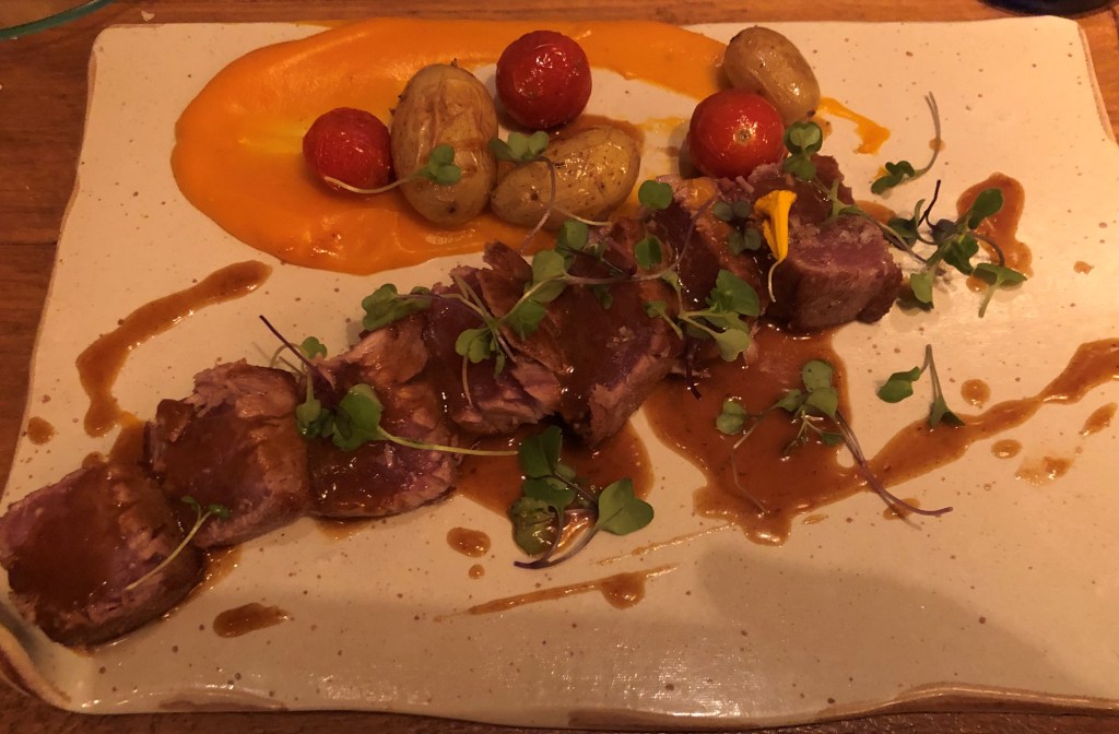 un lomo de venado marinado en cuatro pimientas, setas de temporada, mini zanahorias encurtidas y demi glace especiada, un plato delicioso.