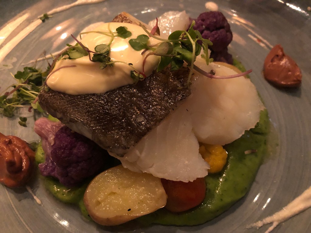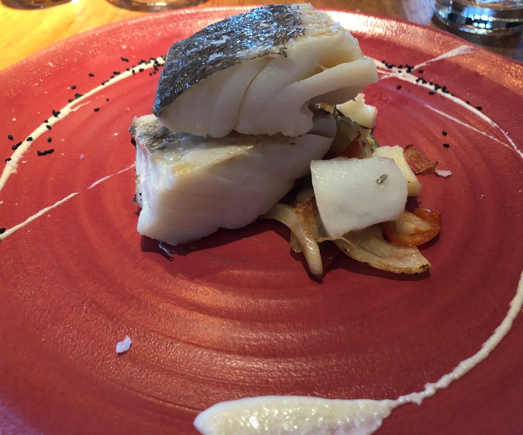 Corvina, en salsa Moilee, poriyal de remolacha y coco, crema de eneldo y pimienta rosa