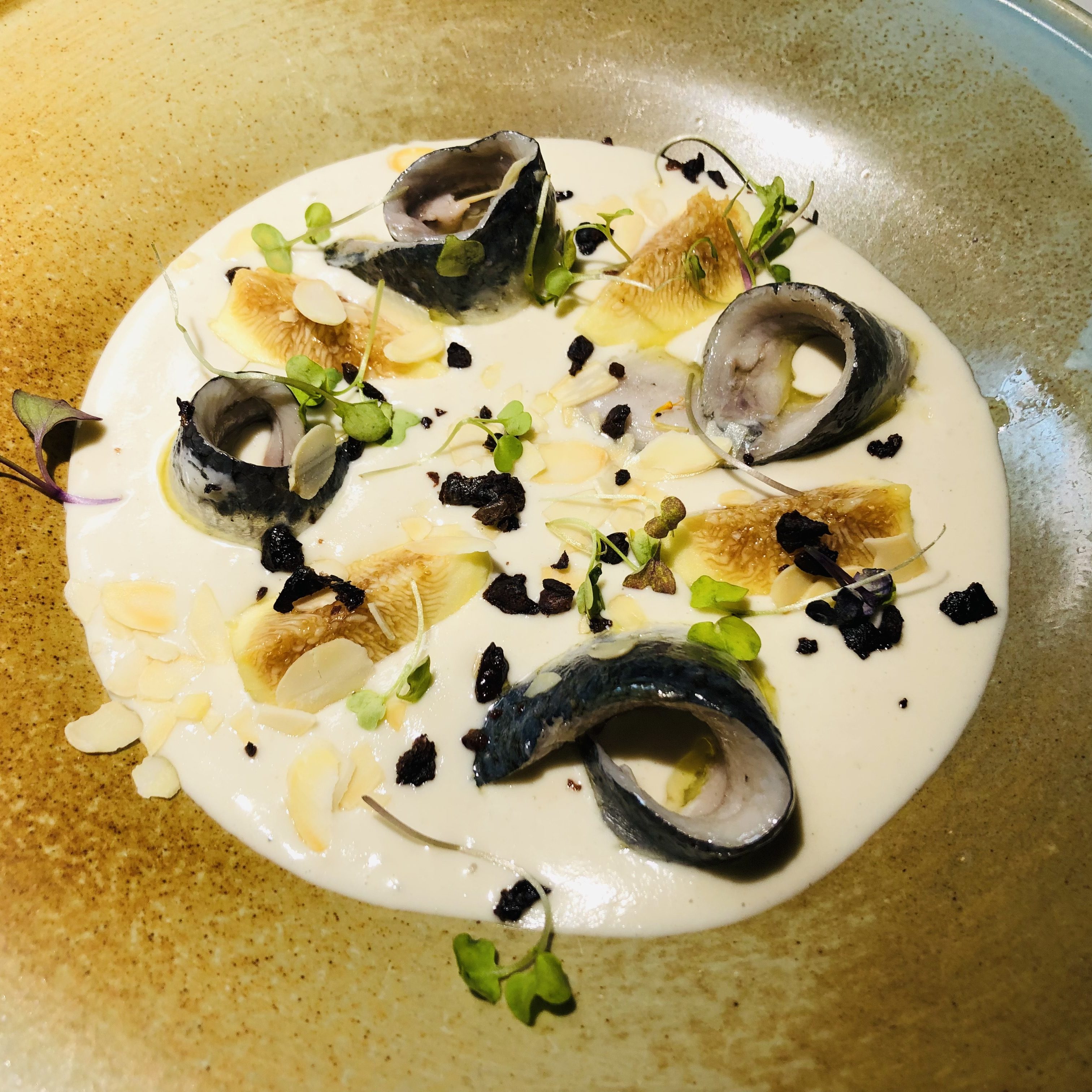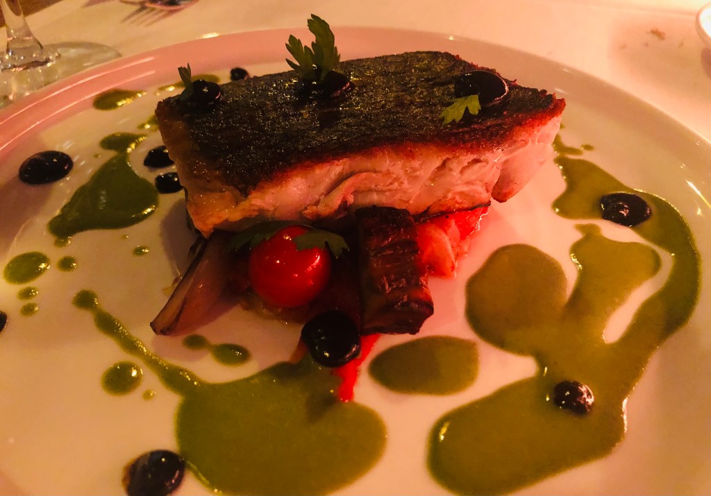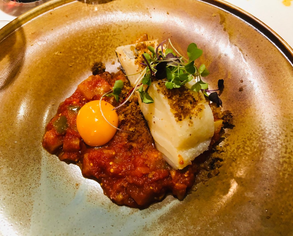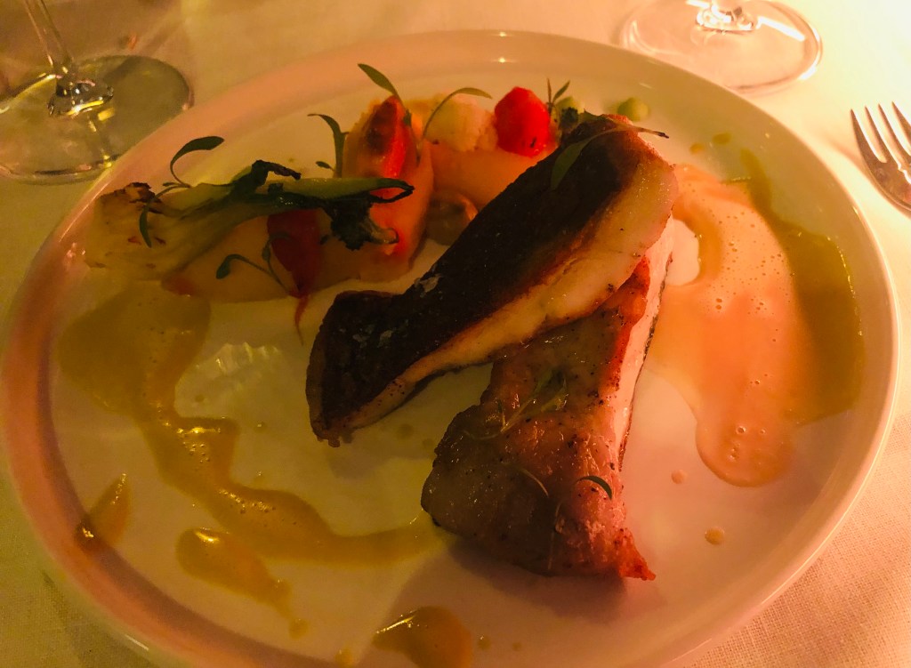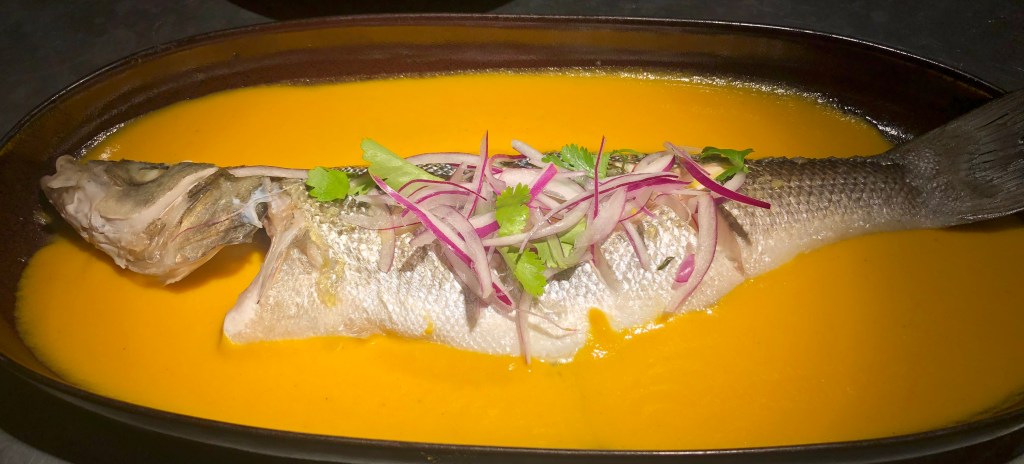 Y Llegamos al segundo “Lubina al vapor con escabeche” una mezcla entre ceviche sin serlo y escabeche, espectacular también.