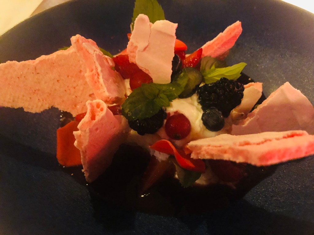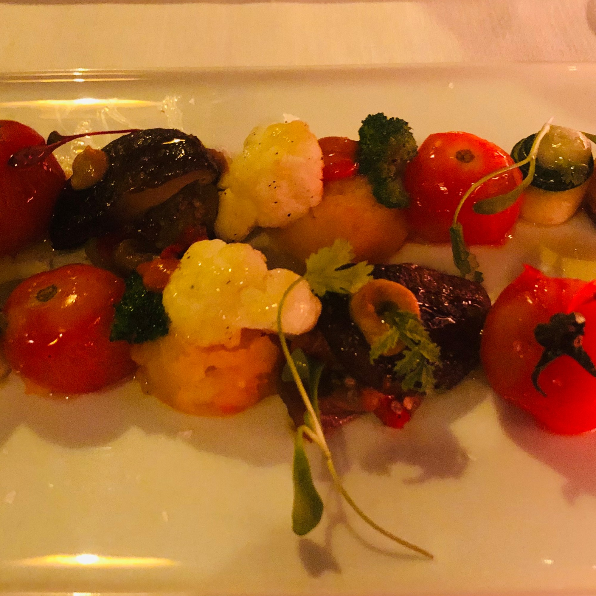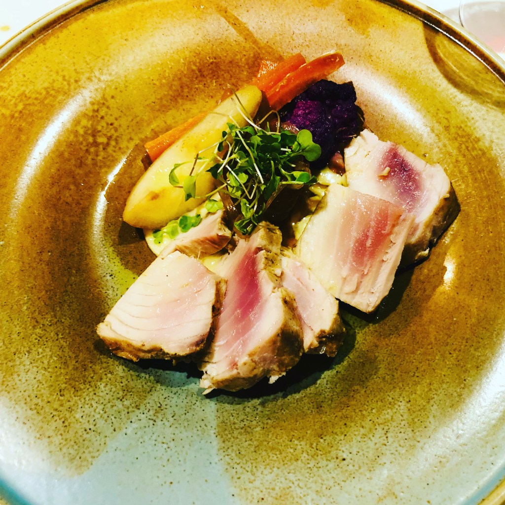 Y Llegamos al segundo “Lubina al vapor con escabeche” una mezcla entre ceviche sin serlo y escabeche, espectacular también.