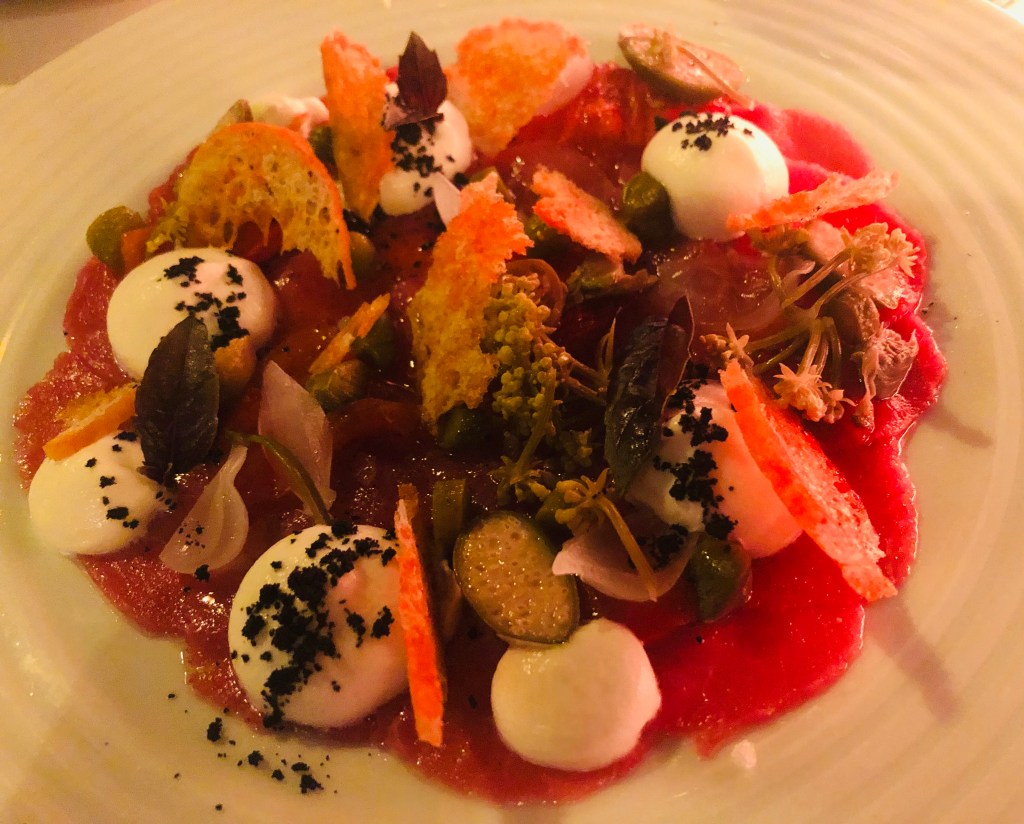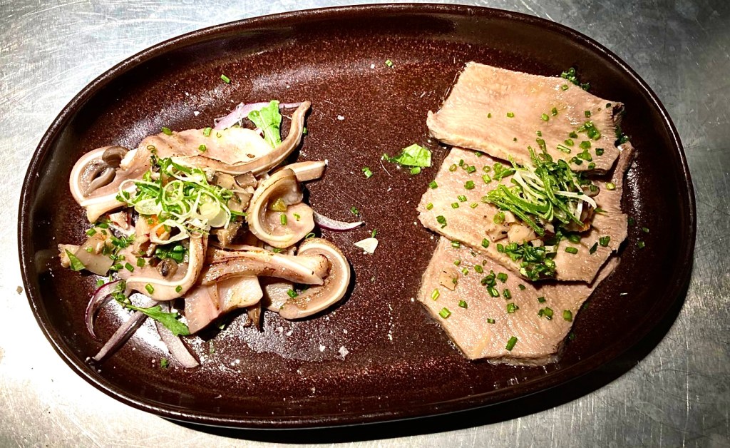 El siguiente para amantes de la casquería, “Lengua de vaca con ensalada de hinojo y el fiambre de oreja de cerdo escabechadas”, un puntazo de sabor.