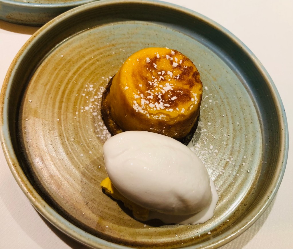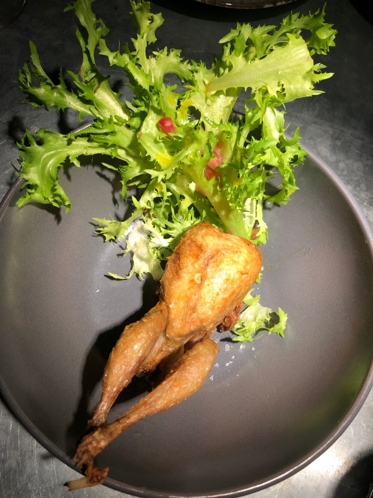 Y “Codorniz frita” estrella indiscutible de los entrantes y que resume esa filosofía de la sencillez de un plato extraordinario. Con tan solo una pequeña ensalada de escarola y granada, una pieza crujiente en el exterior y tiernísima en el interior para comerla con las manos y chuparse los dedos, una delicia