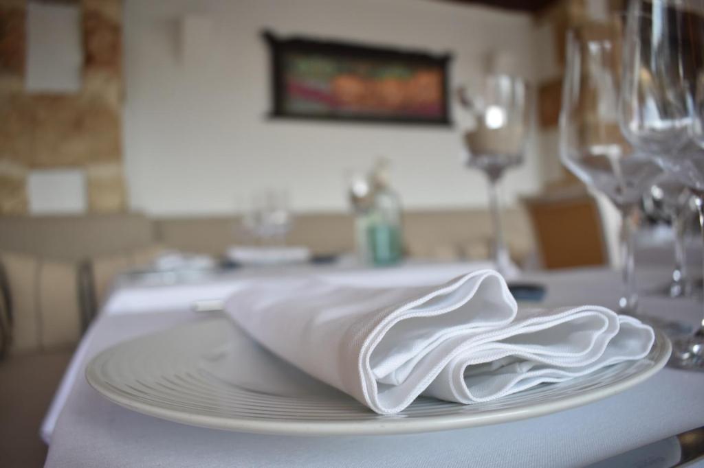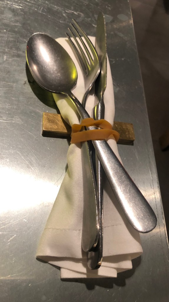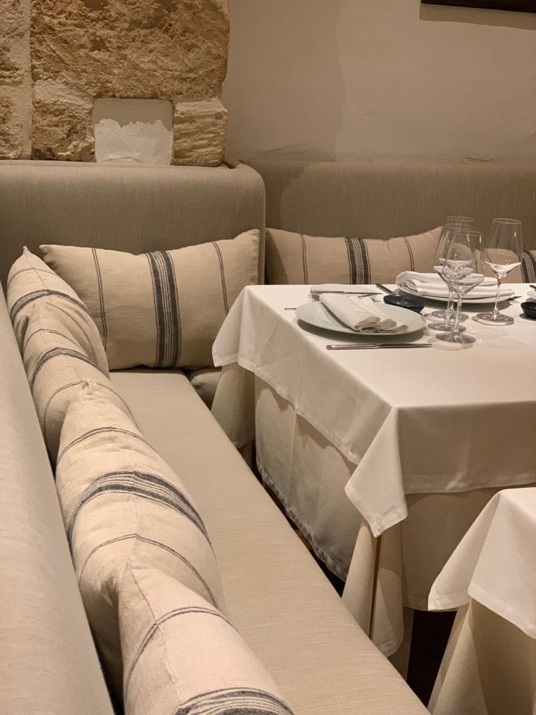 Nada más entrar en todas las mesas tienen un bol de patatas fritas caseras como detalle y una bonita jarra de agua. Una pequeña pieza de latón para apoyar los cubiertos, atados con la servilleta con una sencilla goma, son sus únicos acompañantes.