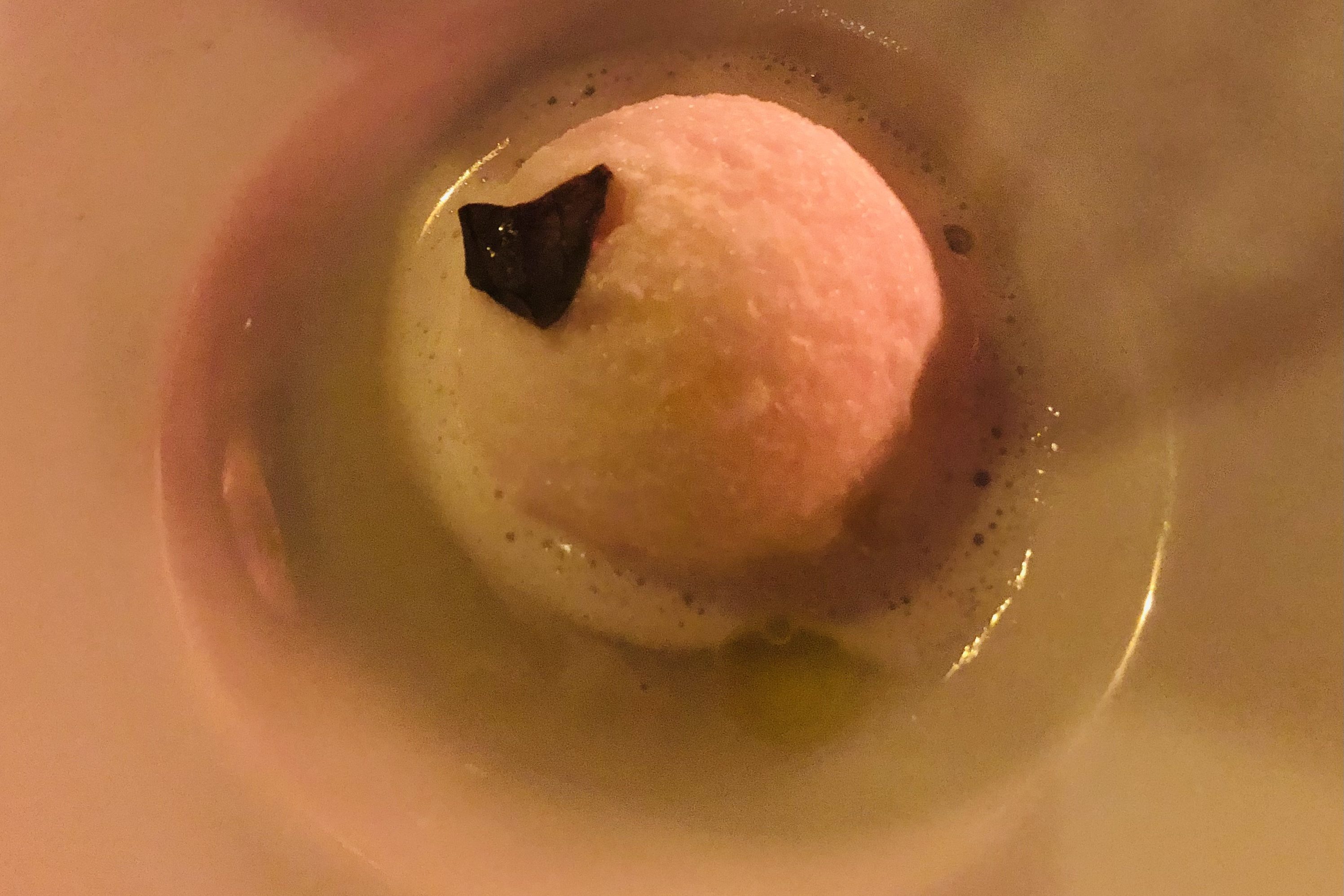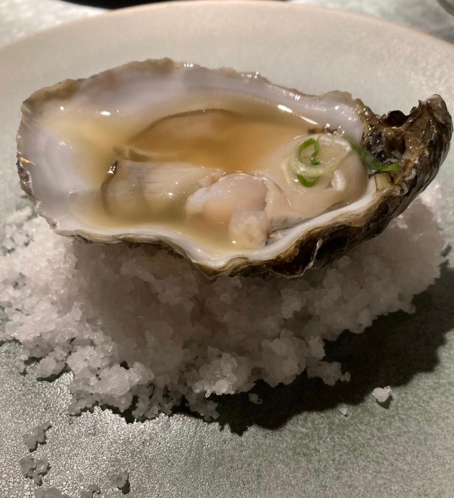 Empezamos los entrantes con una refrescante Ostra aliñada con escabeche de puerro, bocado indescriptible