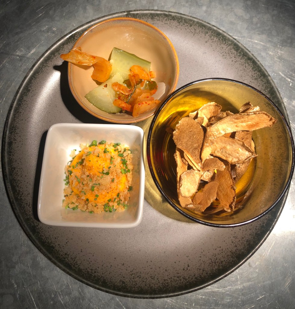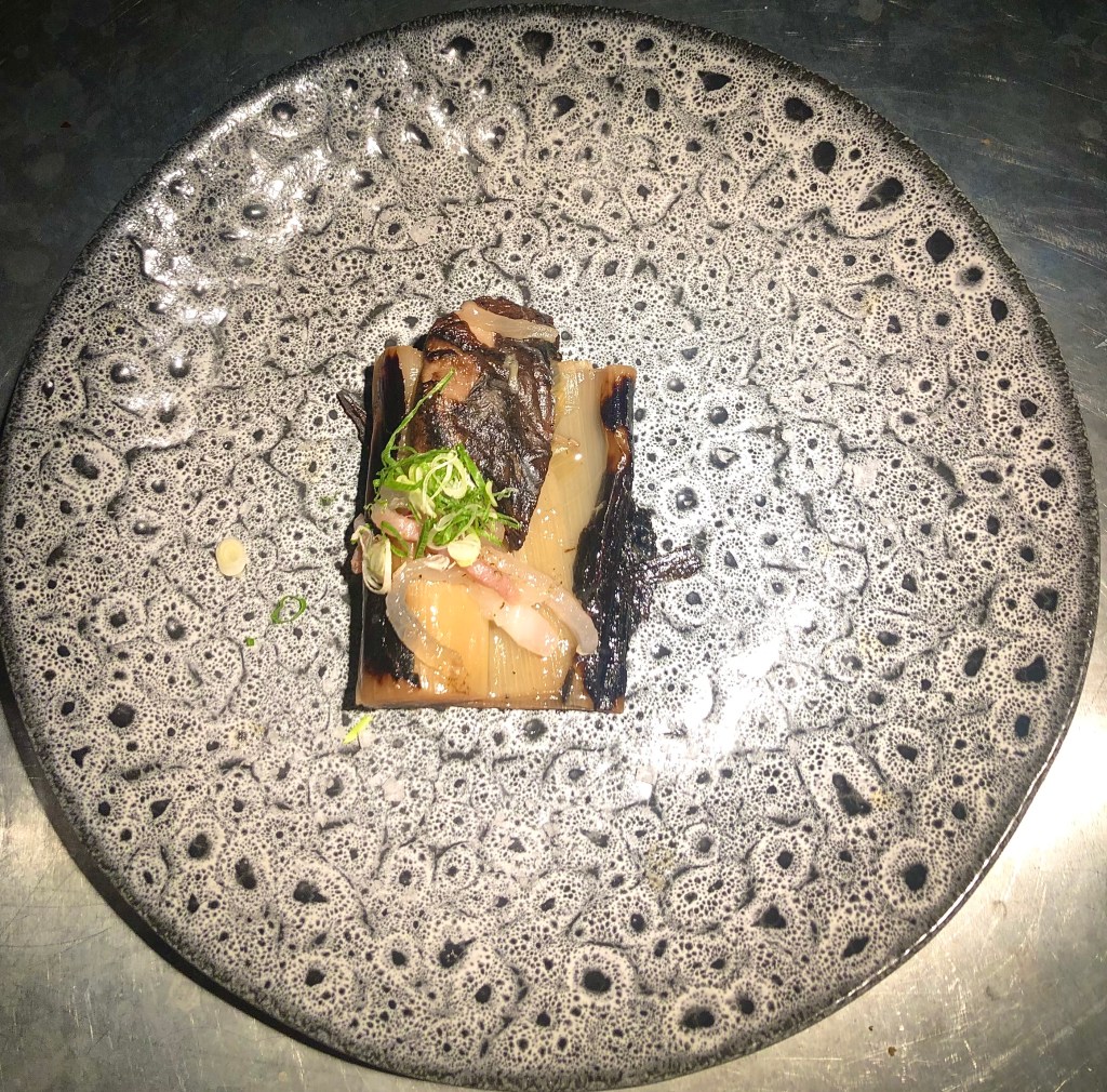 Continuamos con “Puerro quemado escabechado y shitake”, una combinación exquisita el intenso sabor del escabeche en el puerro con esta seta que siempre tiene un cierto sabor ahumado y aroma profundo