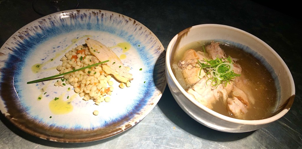 “Conejo escabechado “ se sirve en un caldo riquísimo, la carne tierna y suave, una delicia que acompañan con una original guarnición, una ensalada de pasta y un trozo de pechuga de pollo escabechada.